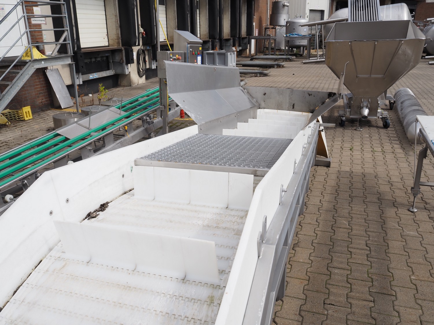 Elevating belt, s/s frame, plastic belt with dividers, belt width: 600 mm, dividers height: 130 mm, distance between dividers: 400 mm, total dimensions: 7700 mm x 1150 mm x 1400 mm.