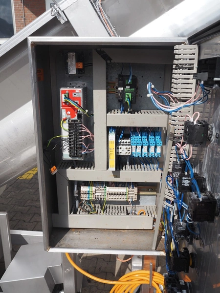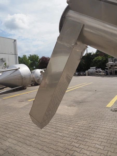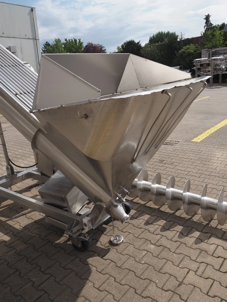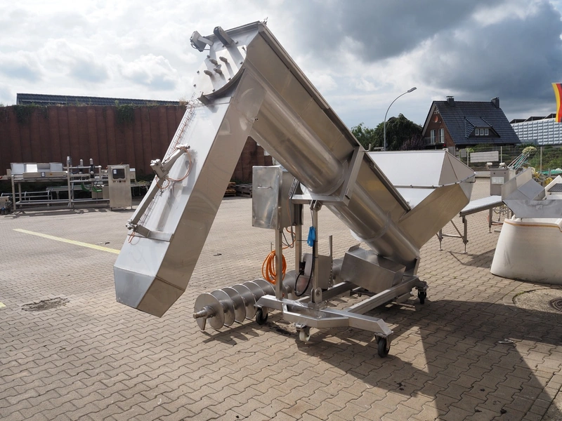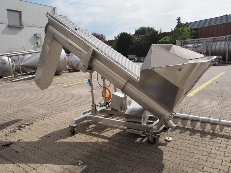 Mobile elevating screw with bunker, s/s screw, screw diameter: 400 mm, tier: 160 mm, elevating height: 700 mm, total dimensions: 4300 mm x 1500 mm x 2700 mm.