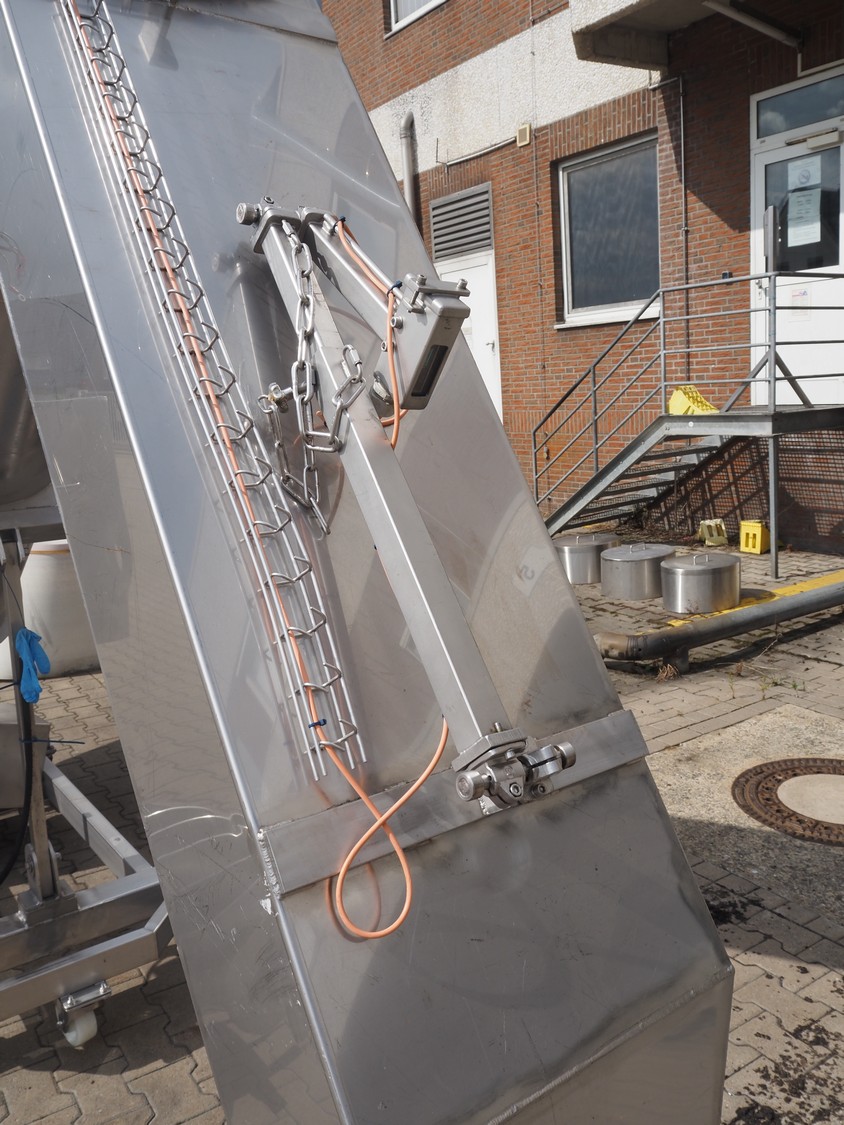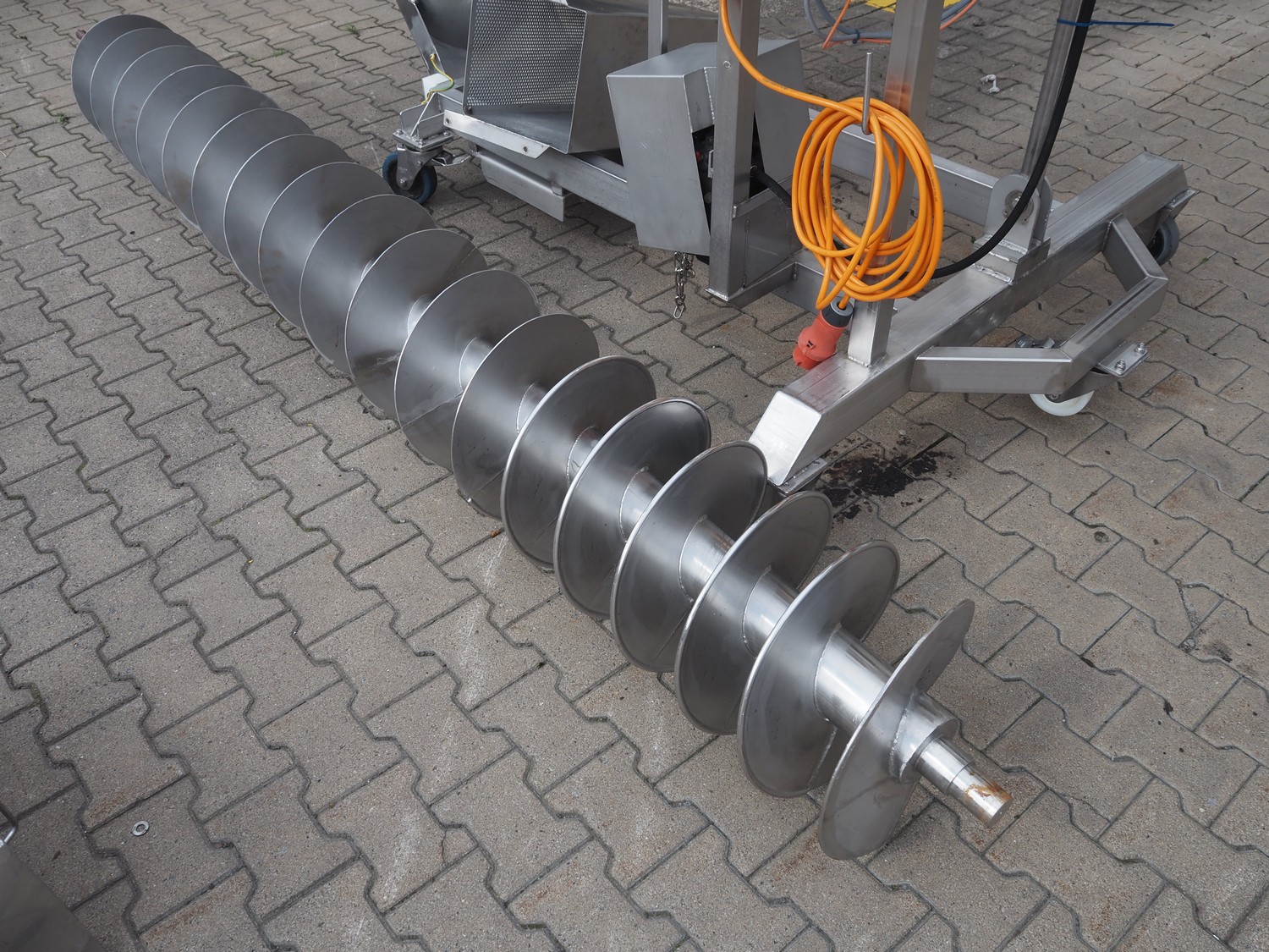 Mobile elevating screw with bunker, s/s screw, screw diameter: 400 mm, tier: 160 mm, elevating height: 700 mm, total dimensions: 4300 mm x 1500 mm x 2700 mm.