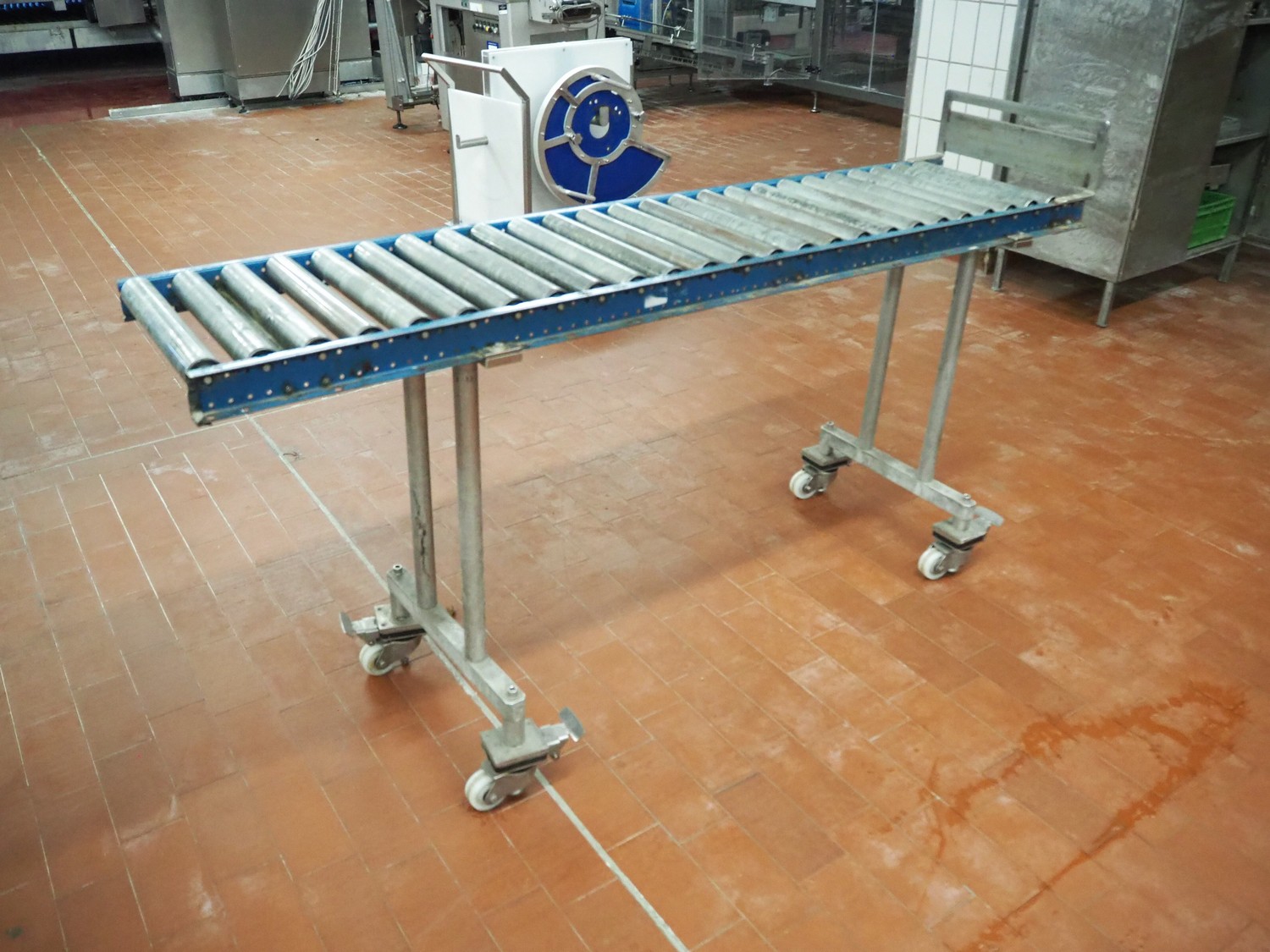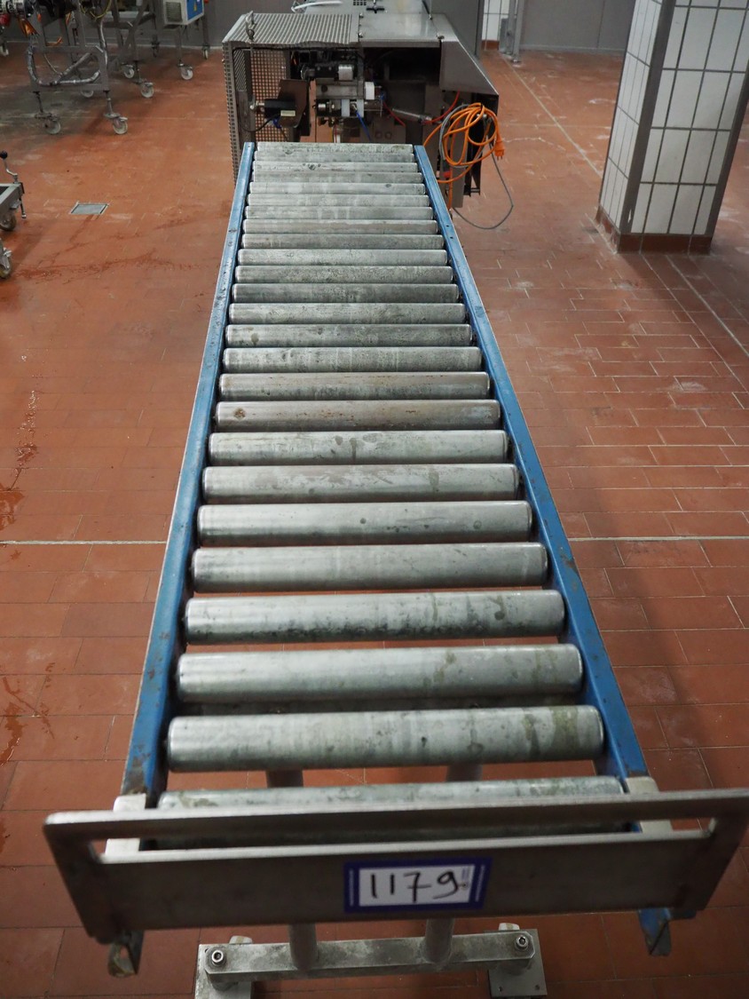 Mobile roller conveyor, steel frame, steel rollers, roller width: 390 mm, total dimensions: 4060 mm x 930 mm x 1050 mm.