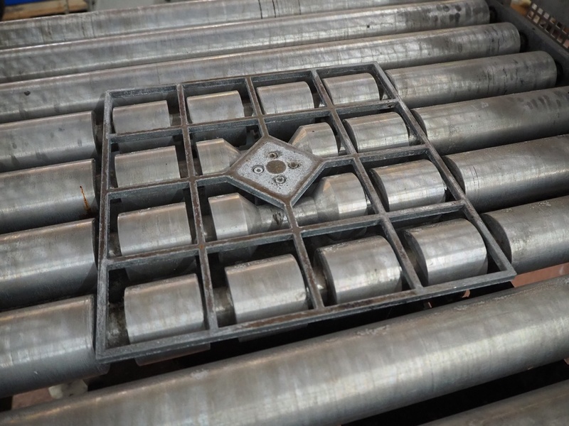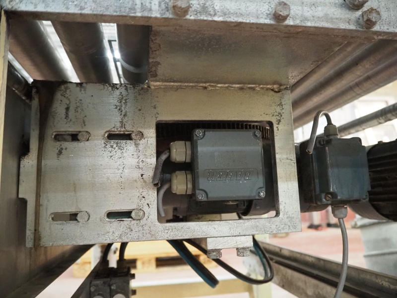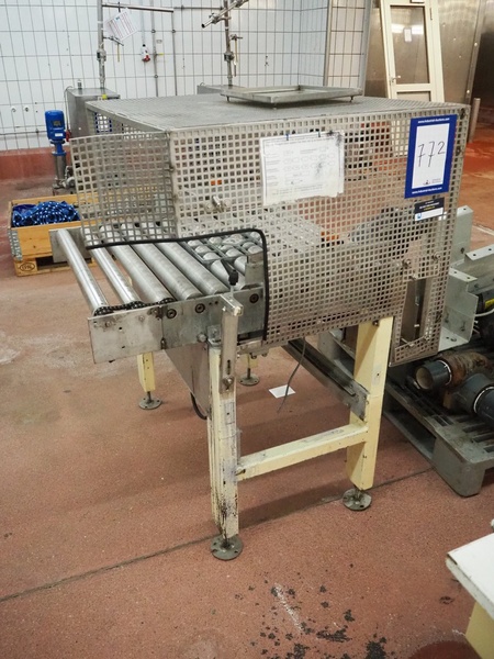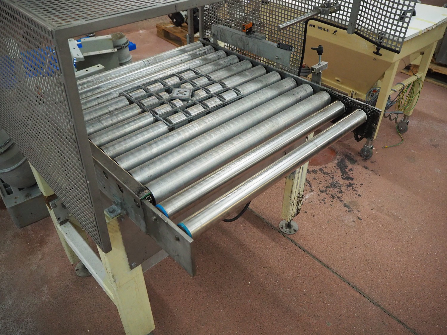 Roller conveyor, steel frame, s/s rollers, roller width: 730 mm, total dimensions: 1150 mm x 1050 mm x 1300 mm.