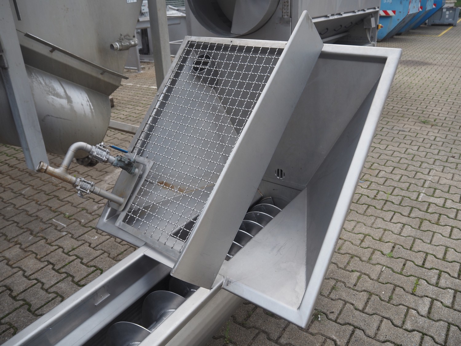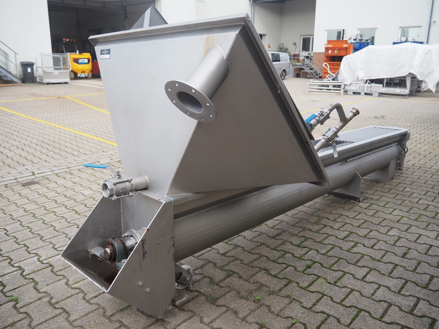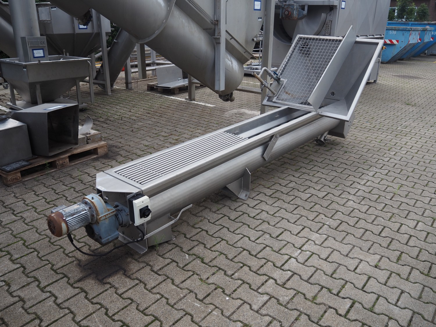 Kiremko elevating screw with bunker, s/s screw, screw diameter: 280 mm, tier: 200 mm, elevating height: 3700 mm, total dimensions: 1500 mm x 1100 mm x 4200 mm.