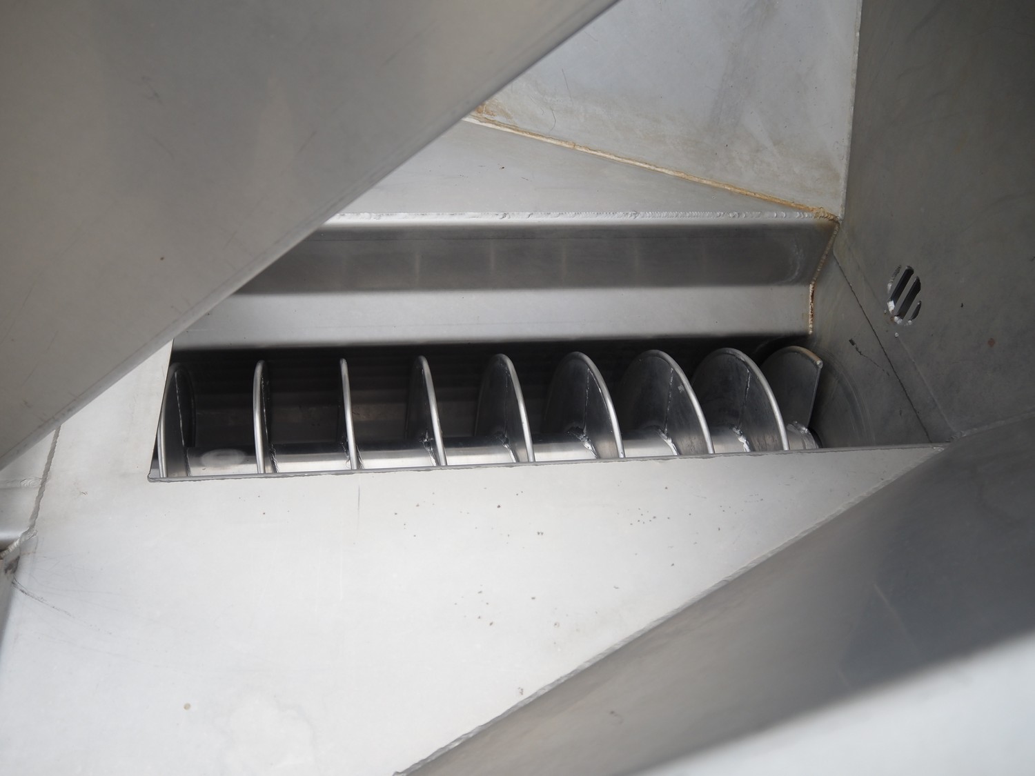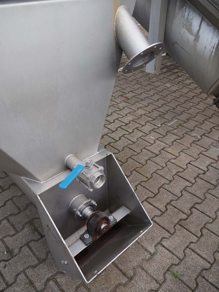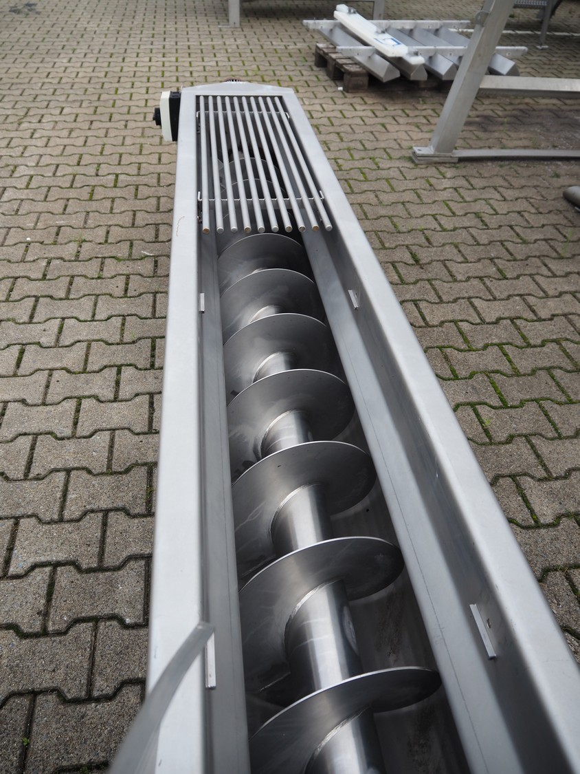 Kiremko elevating screw with bunker, s/s screw, screw diameter: 280 mm, tier: 200 mm, elevating height: 3700 mm, total dimensions: 1500 mm x 1100 mm x 4200 mm.