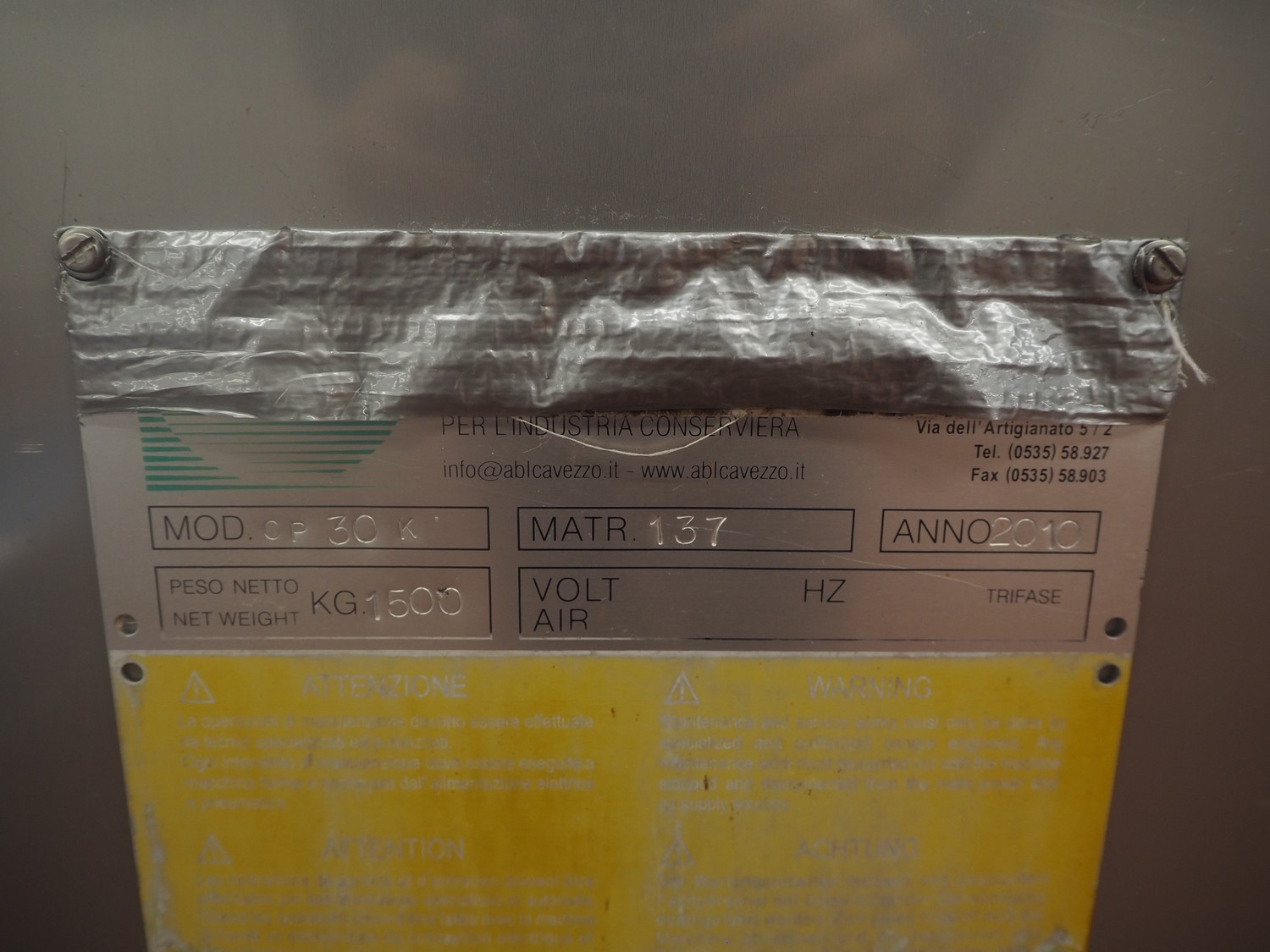 ABL fruit peeler for kiwi and mango, model: op30k, serial number: 137, year of construction: 2010, machine weight: 1500 kg, plastic belt, belt width: 300 mm x 400 mm, total dimensions: 5400 mm x 1750 mm x 2300 mm.