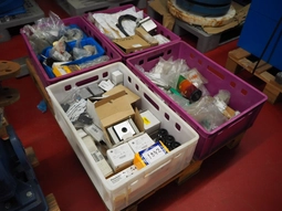 Pallet with large amount of parts, among others: controls, circuit breaker, cables, electrical components, dimensions: 1200 mm x 80…1 bidLot is closed -
