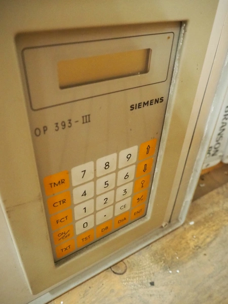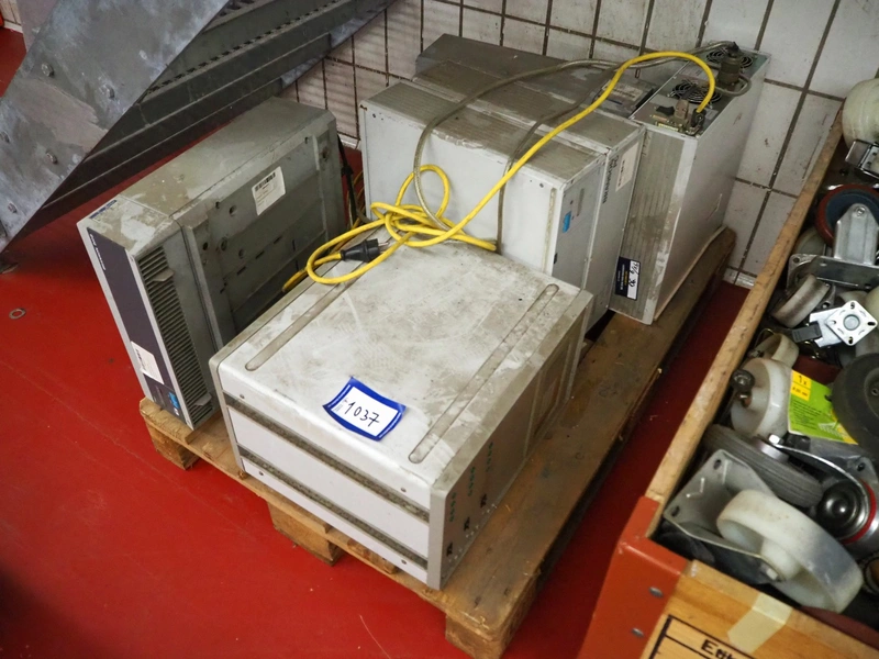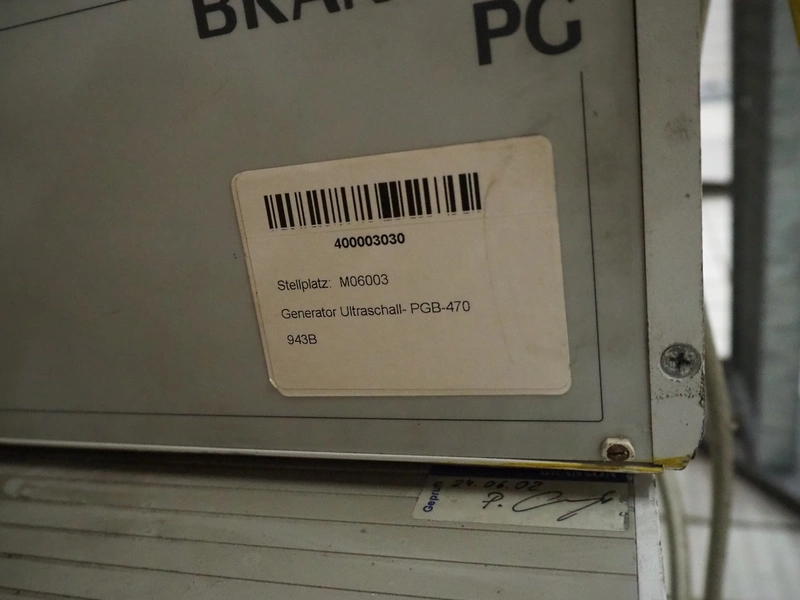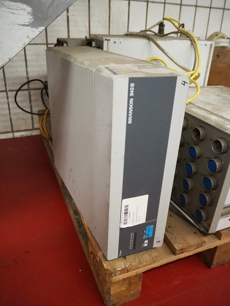Pallet with 5 Branson PG industrial PCs and 1 Siemens operating panel, dimensions: 1200 mm x 800 mm x 650 mm.