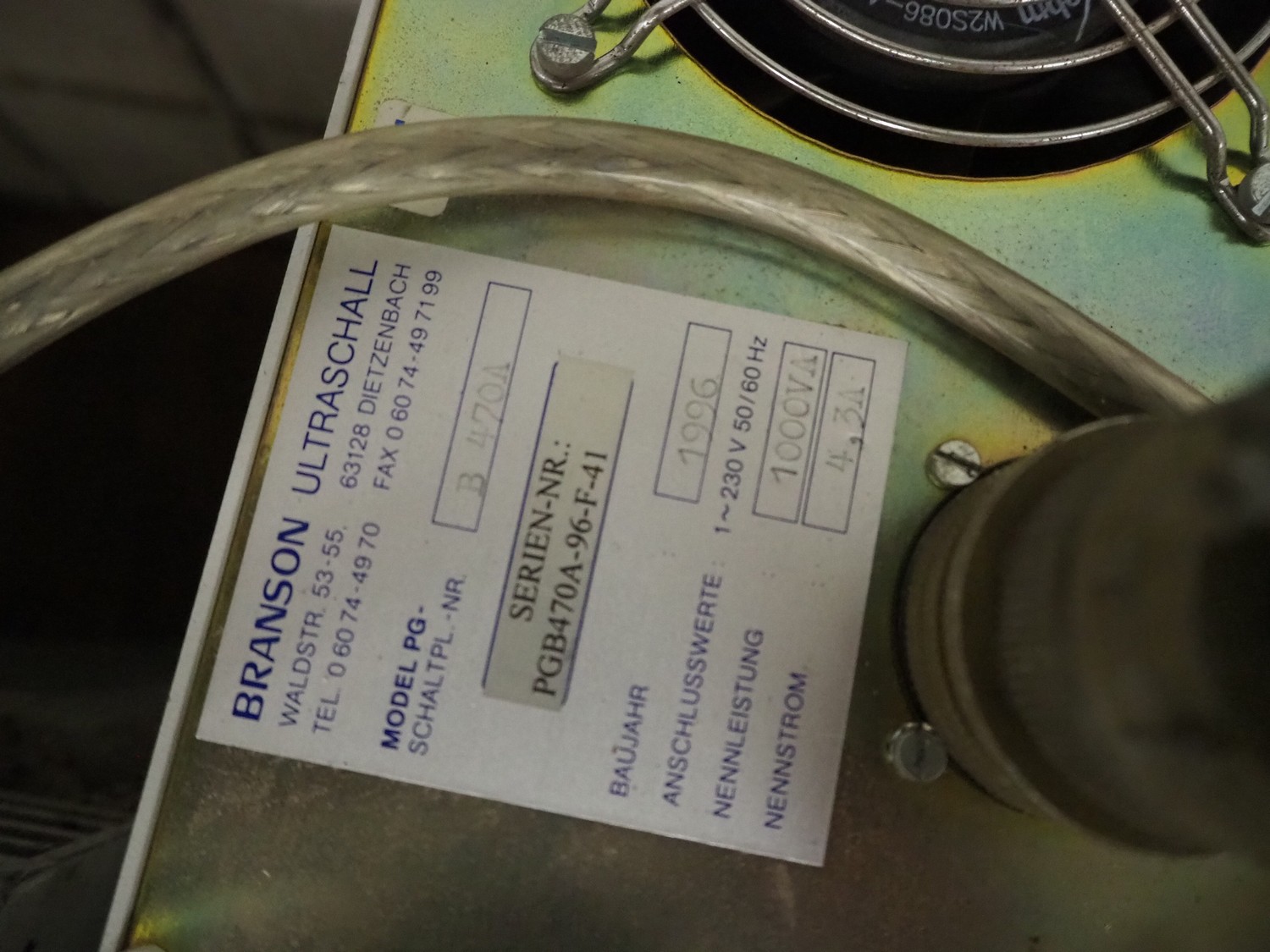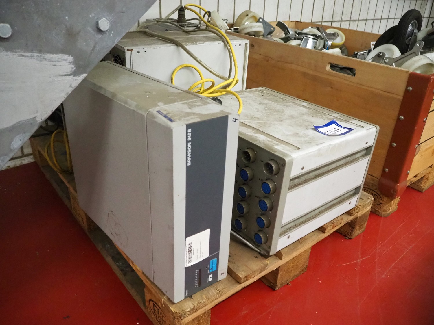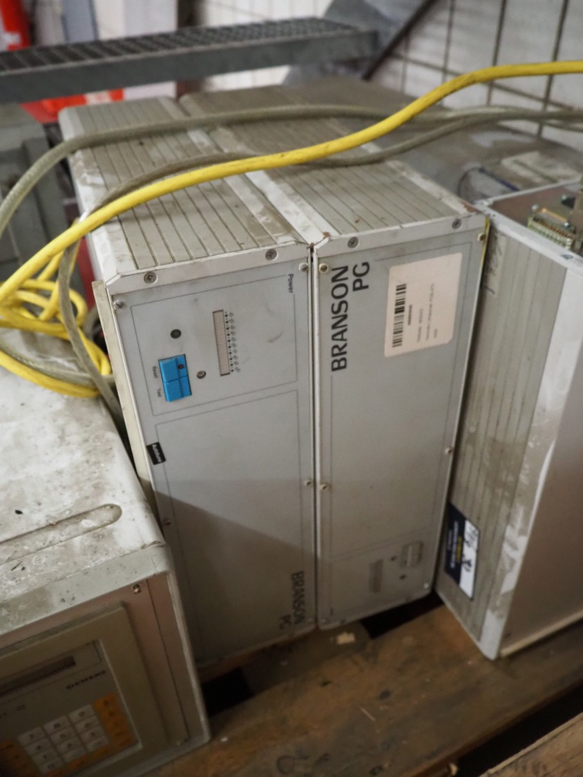 Pallet with 5 Branson PG industrial PCs and 1 Siemens operating panel, dimensions: 1200 mm x 800 mm x 650 mm.