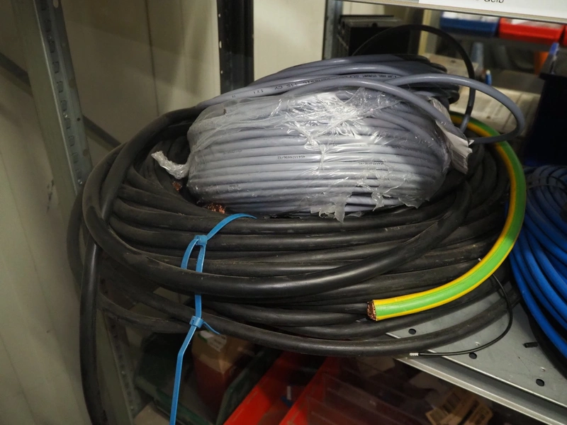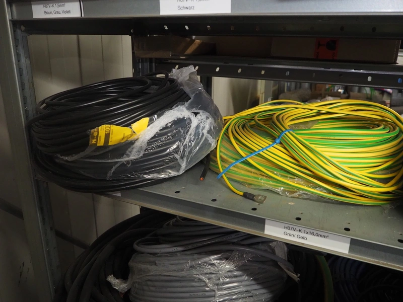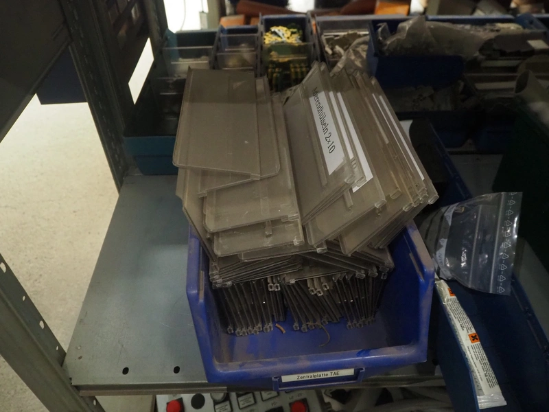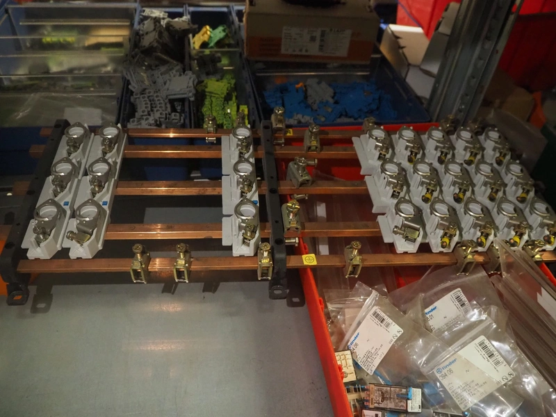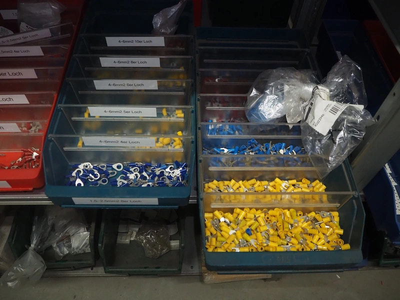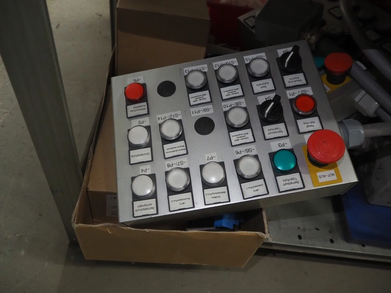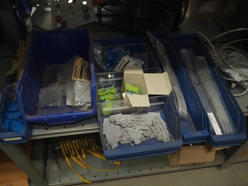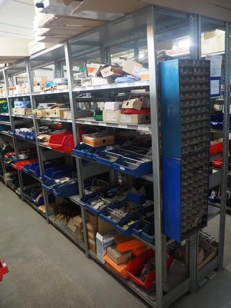 Aluminum rack with large amount of different machine parts, amoung others: small electric components, cables, emergency exit lamps, s/s switch cabinets, dimensions: 5000 mm x 830 mm x 2100 mm.