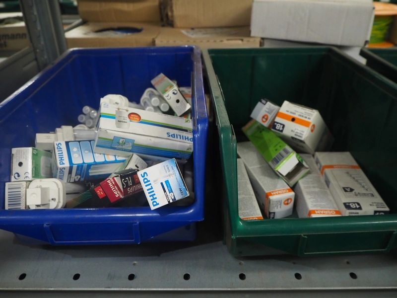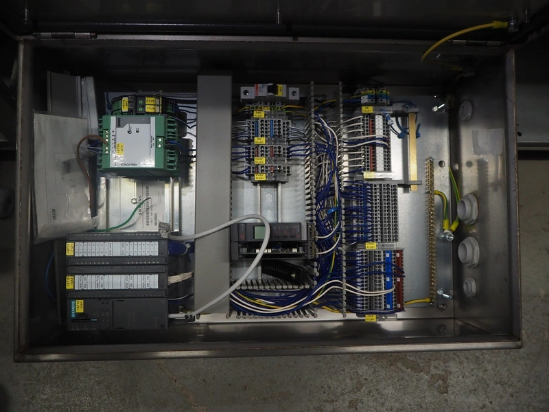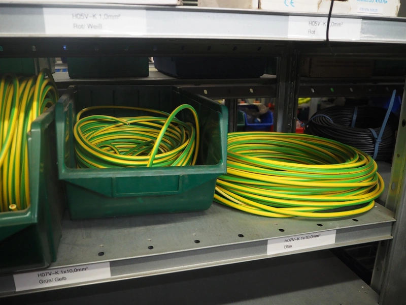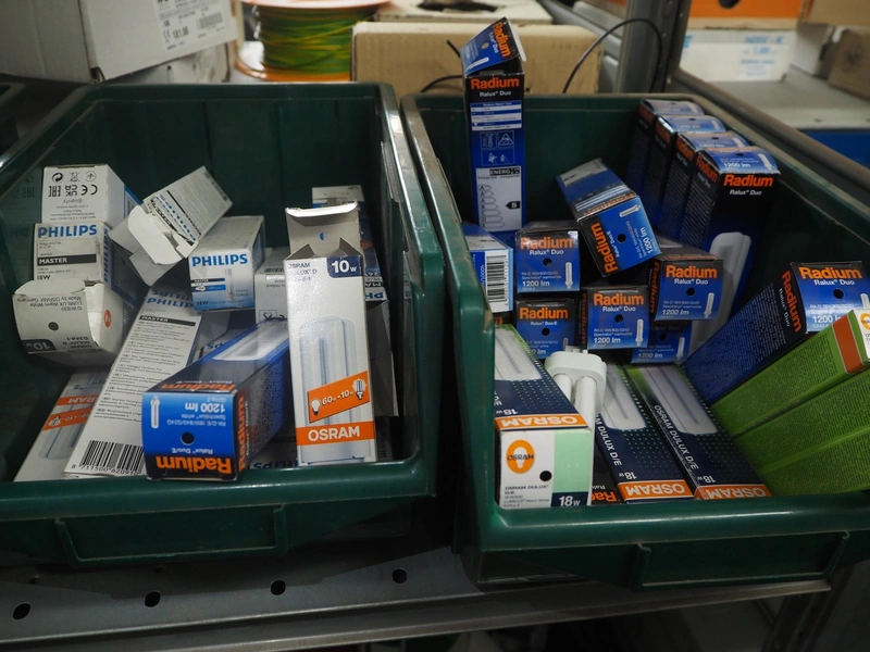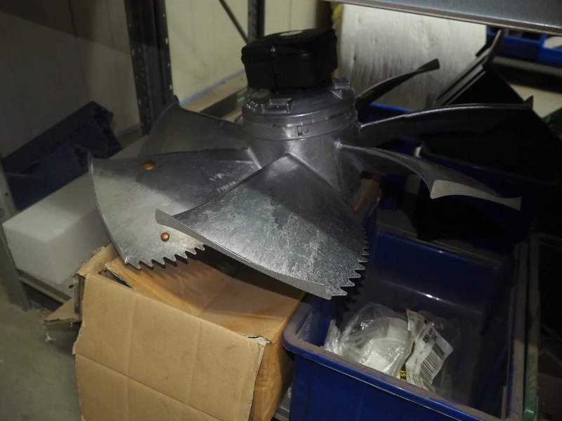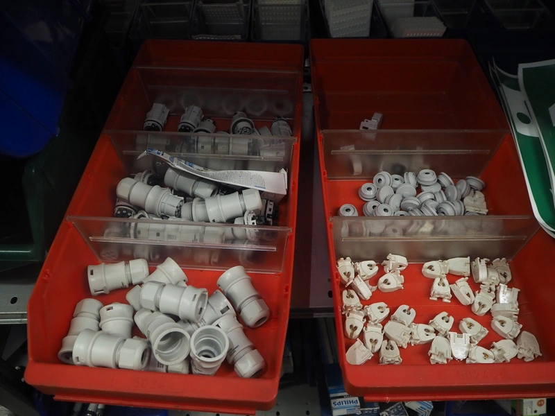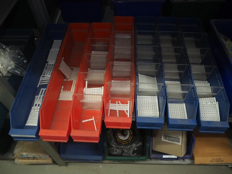 Aluminum rack with large amount of different machine parts, amoung others: small electric components, cables, emergency exit lamps, s/s switch cabinets, dimensions: 5000 mm x 830 mm x 2100 mm.