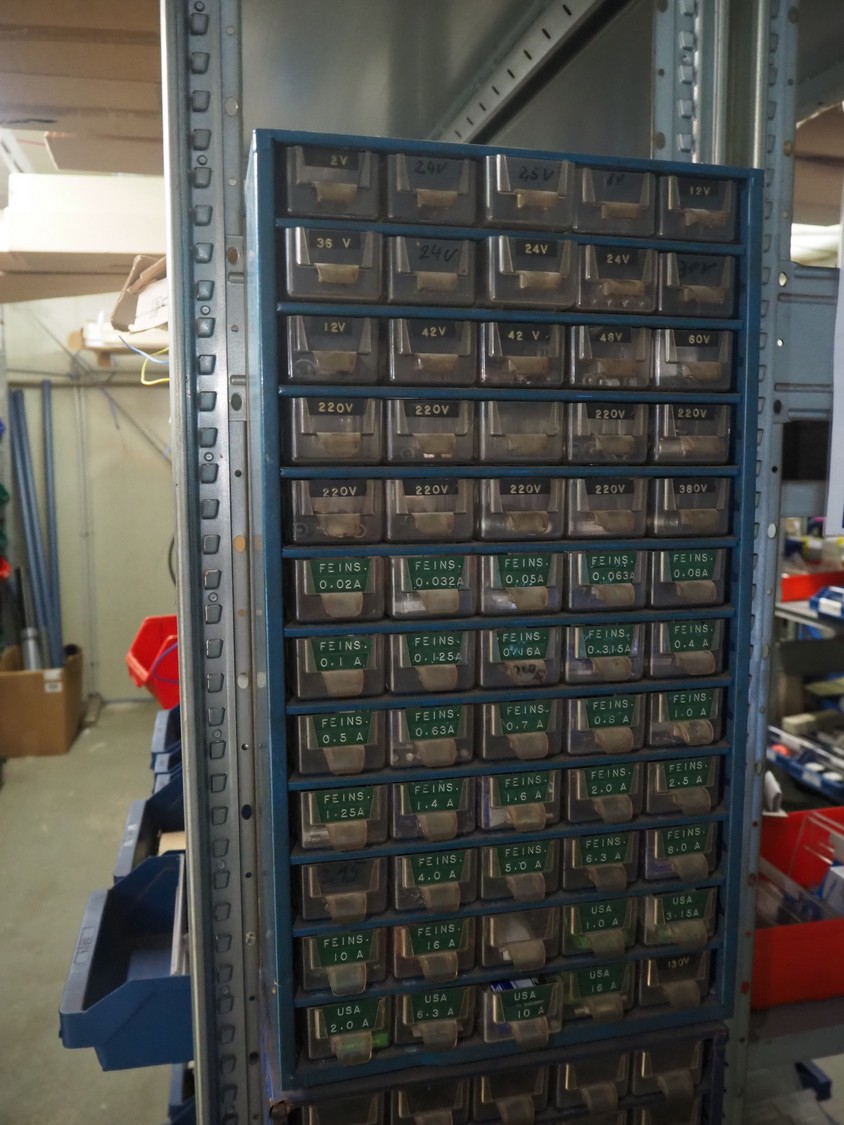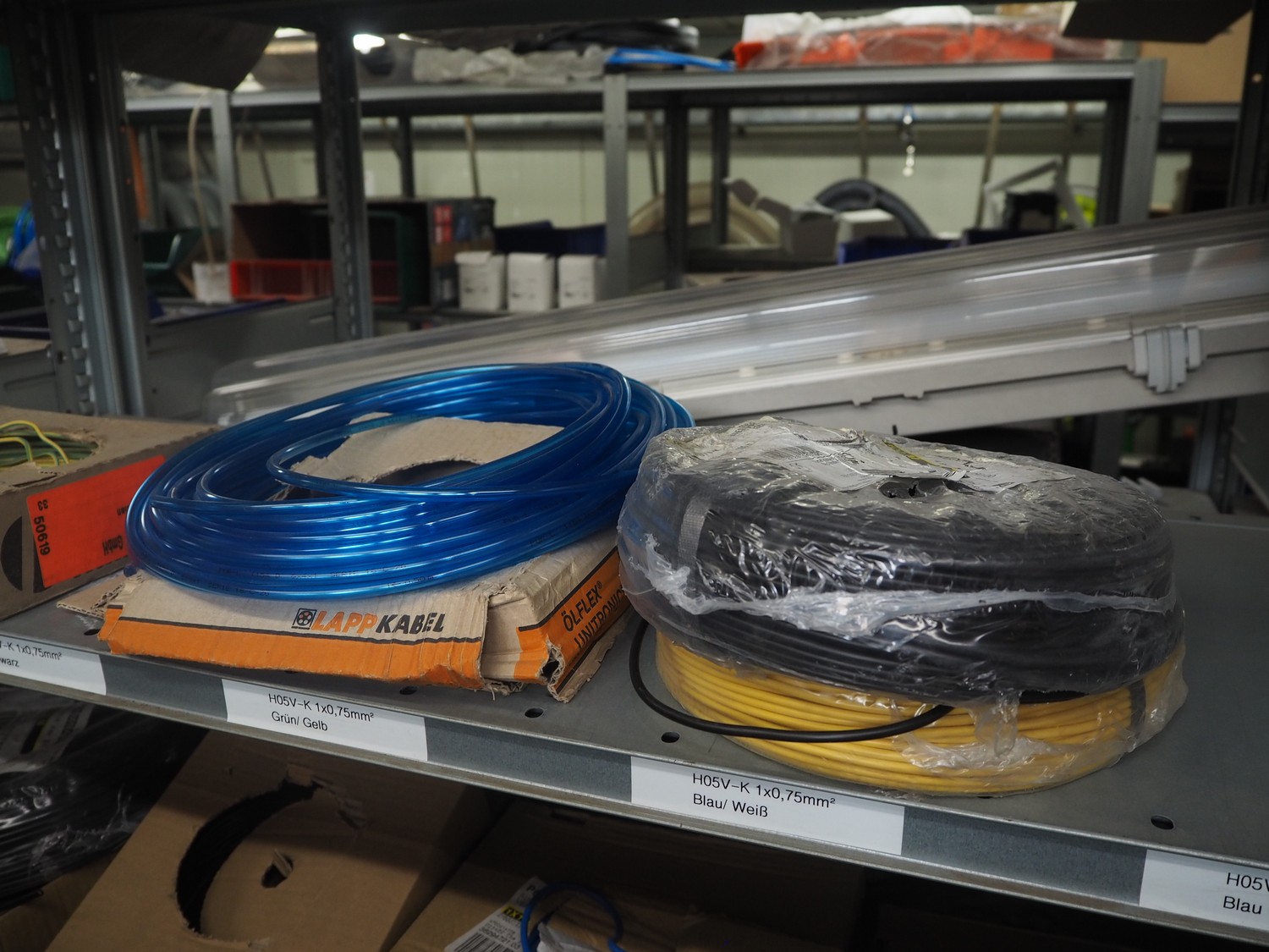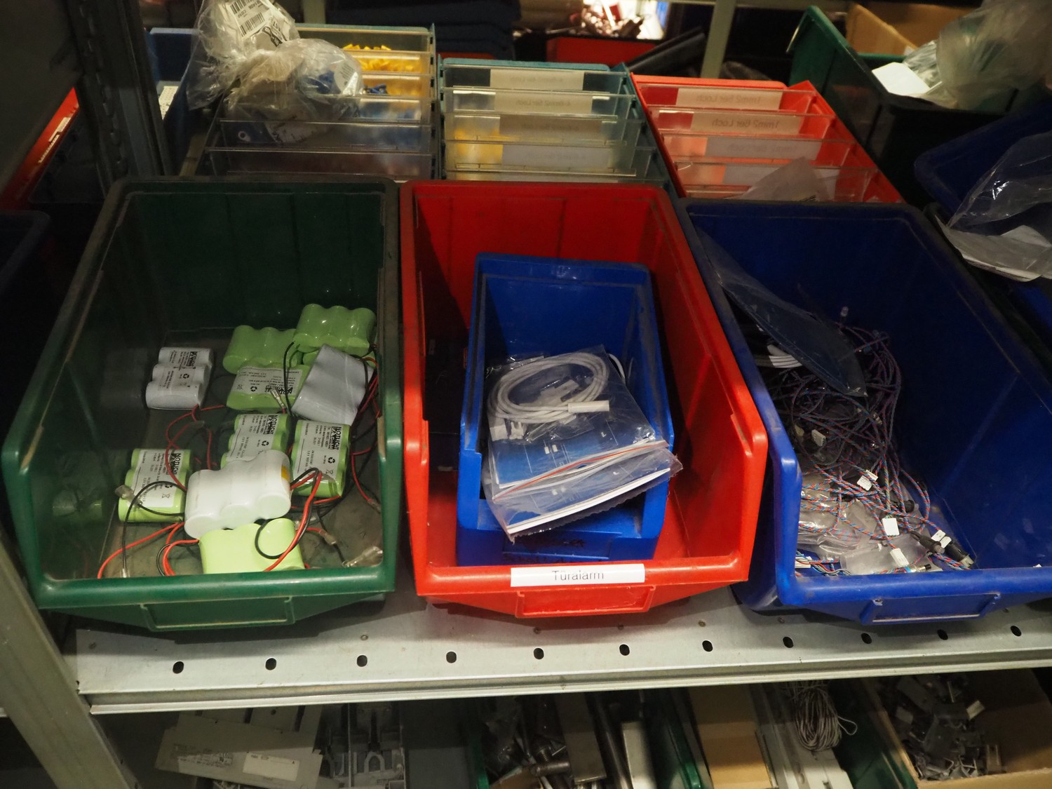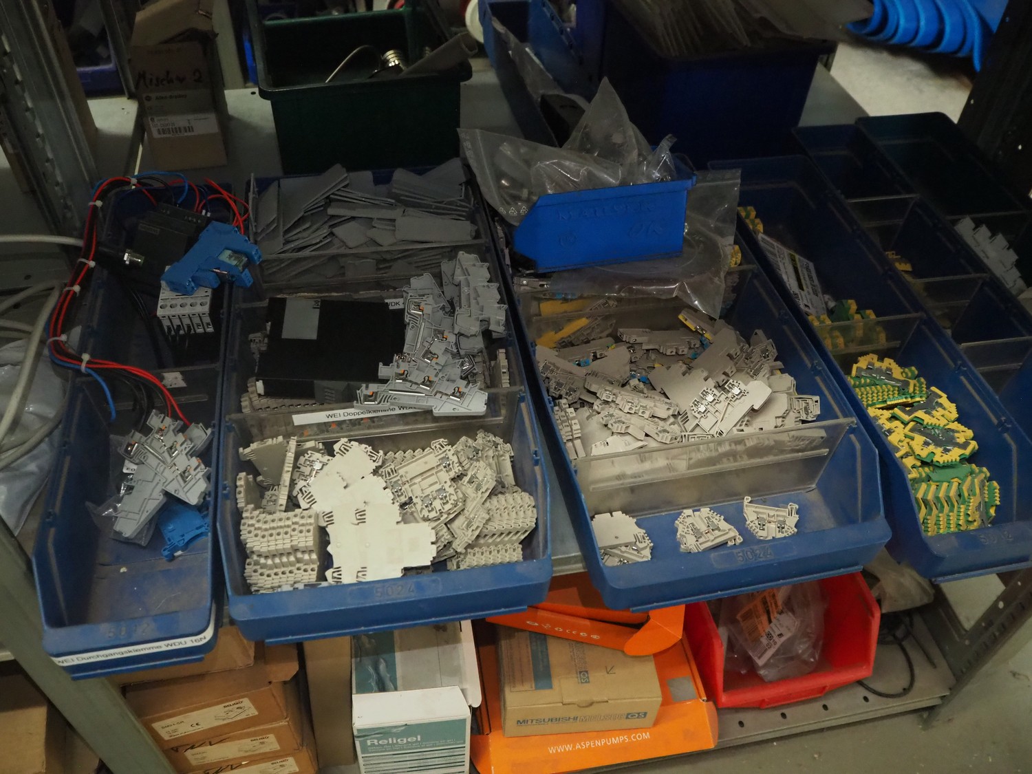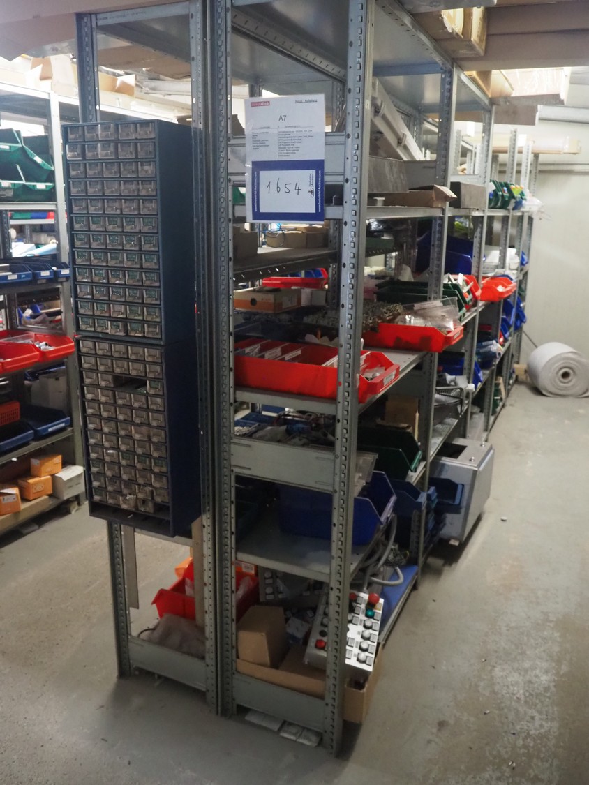 Aluminum rack with large amount of different machine parts, amoung others: small electric components, cables, emergency exit lamps, s/s switch cabinets, dimensions: 5000 mm x 830 mm x 2100 mm.