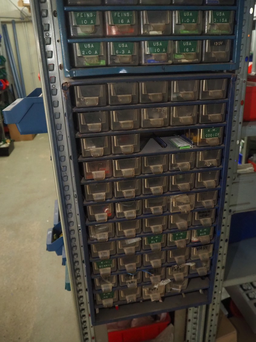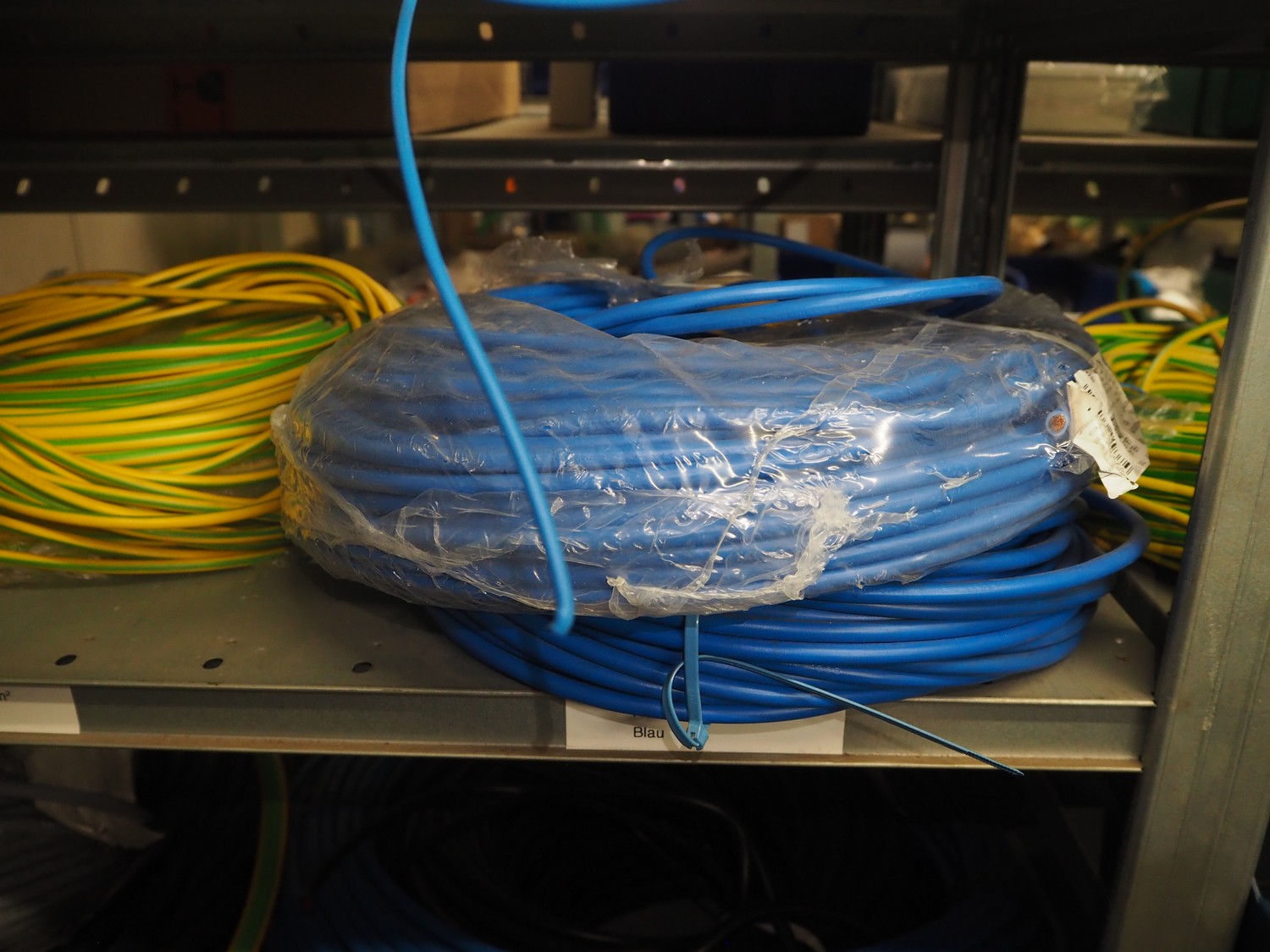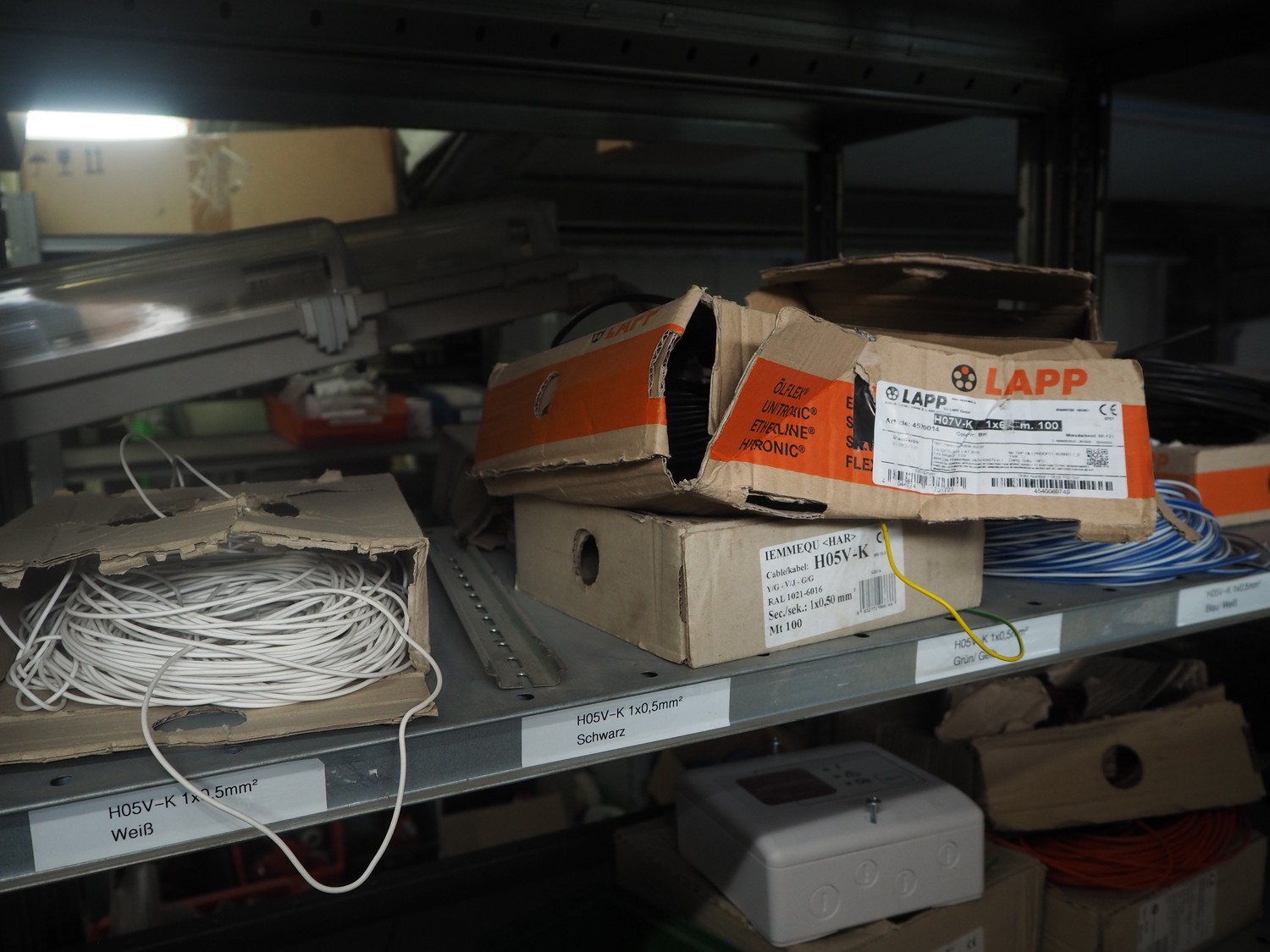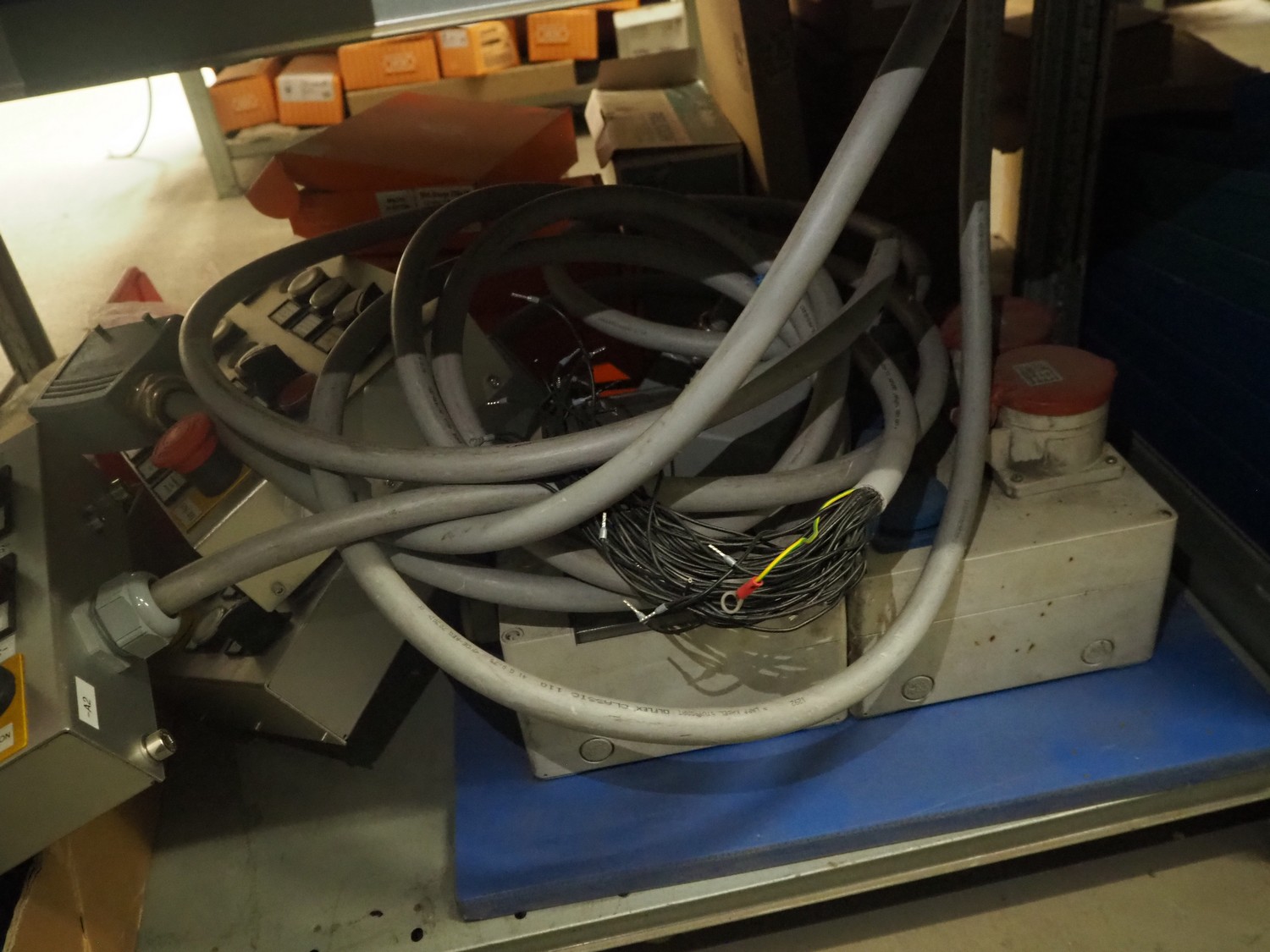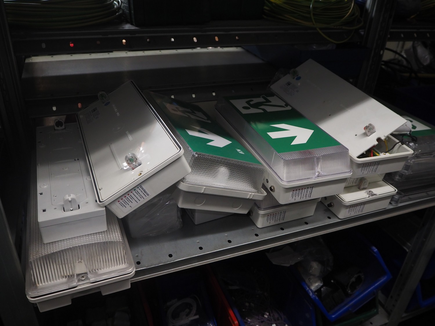 Aluminum rack with large amount of different machine parts, amoung others: small electric components, cables, emergency exit lamps, s/s switch cabinets, dimensions: 5000 mm x 830 mm x 2100 mm.