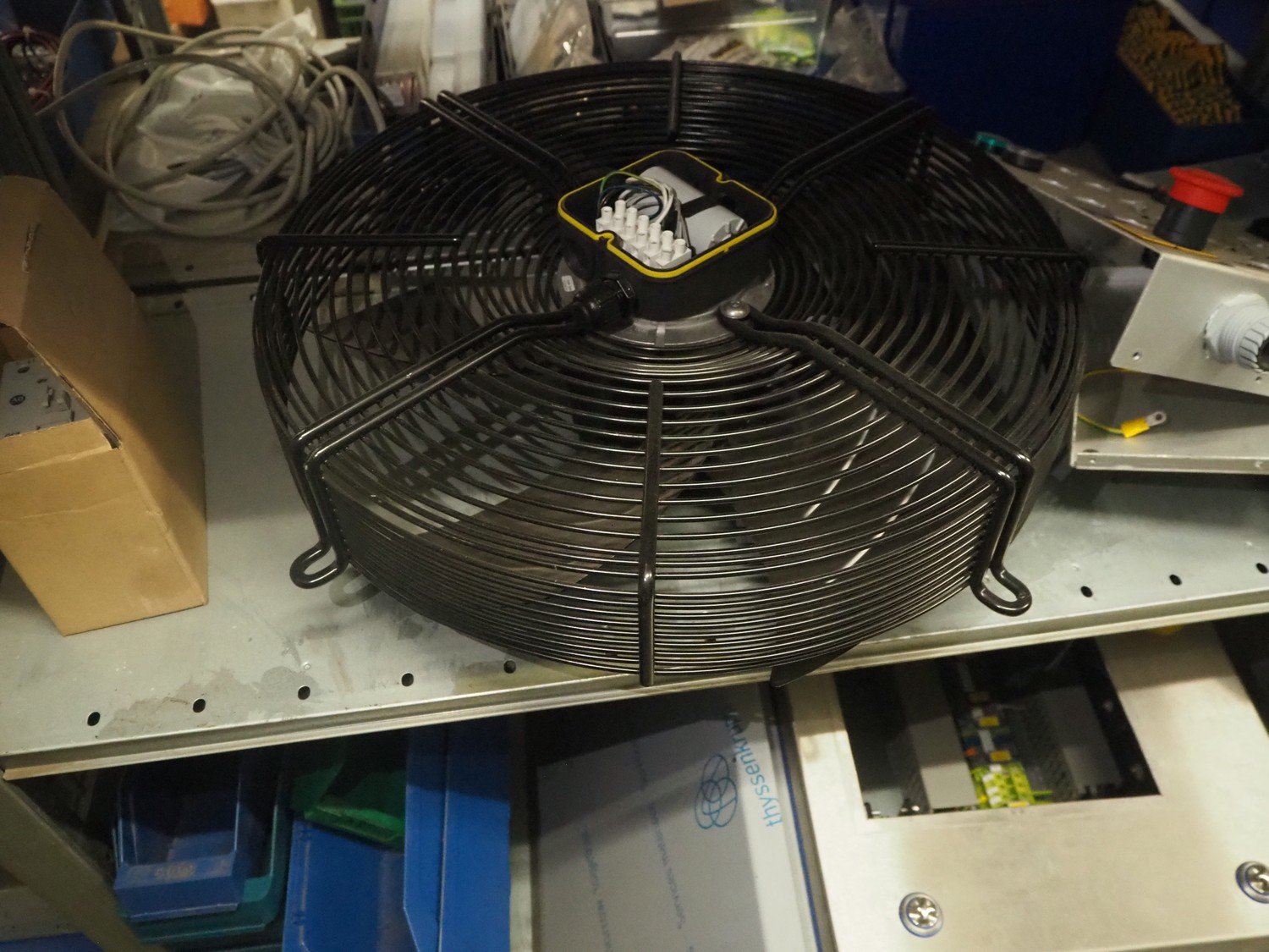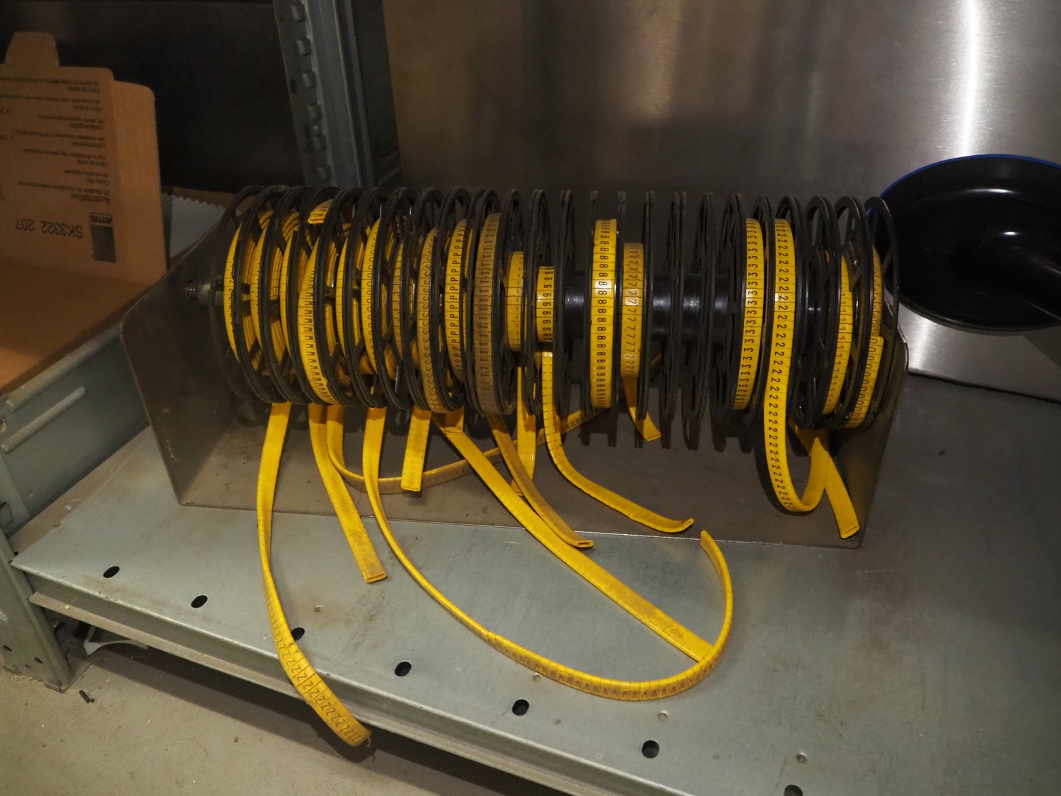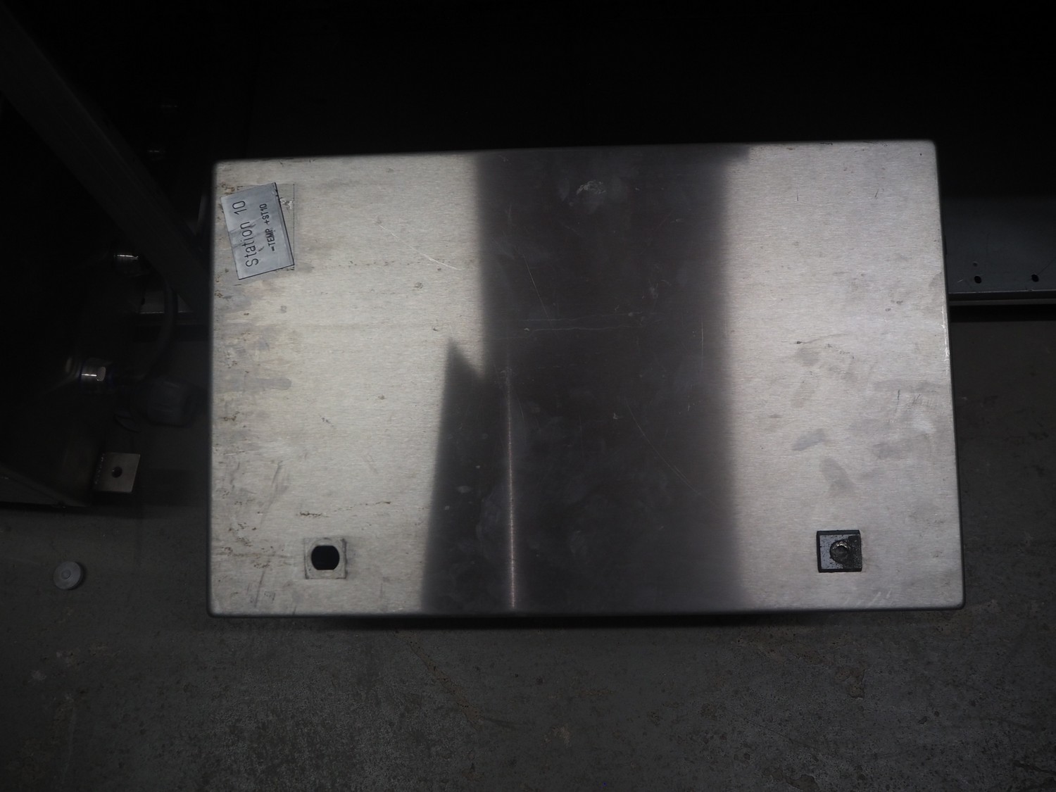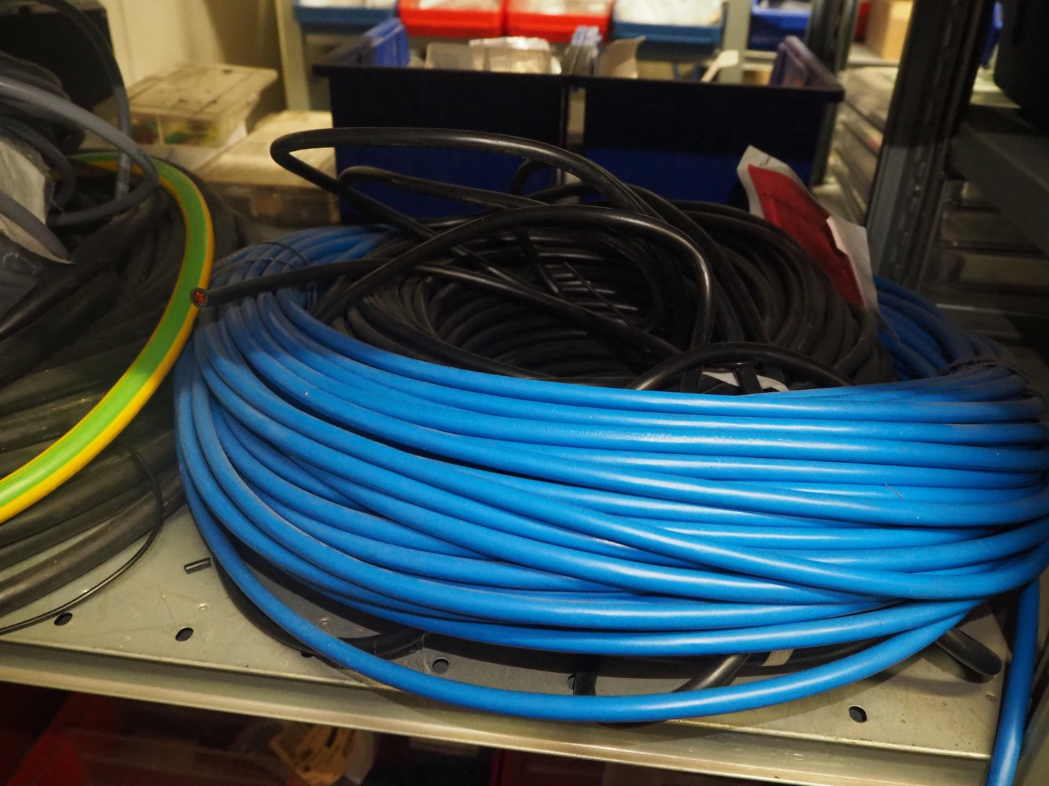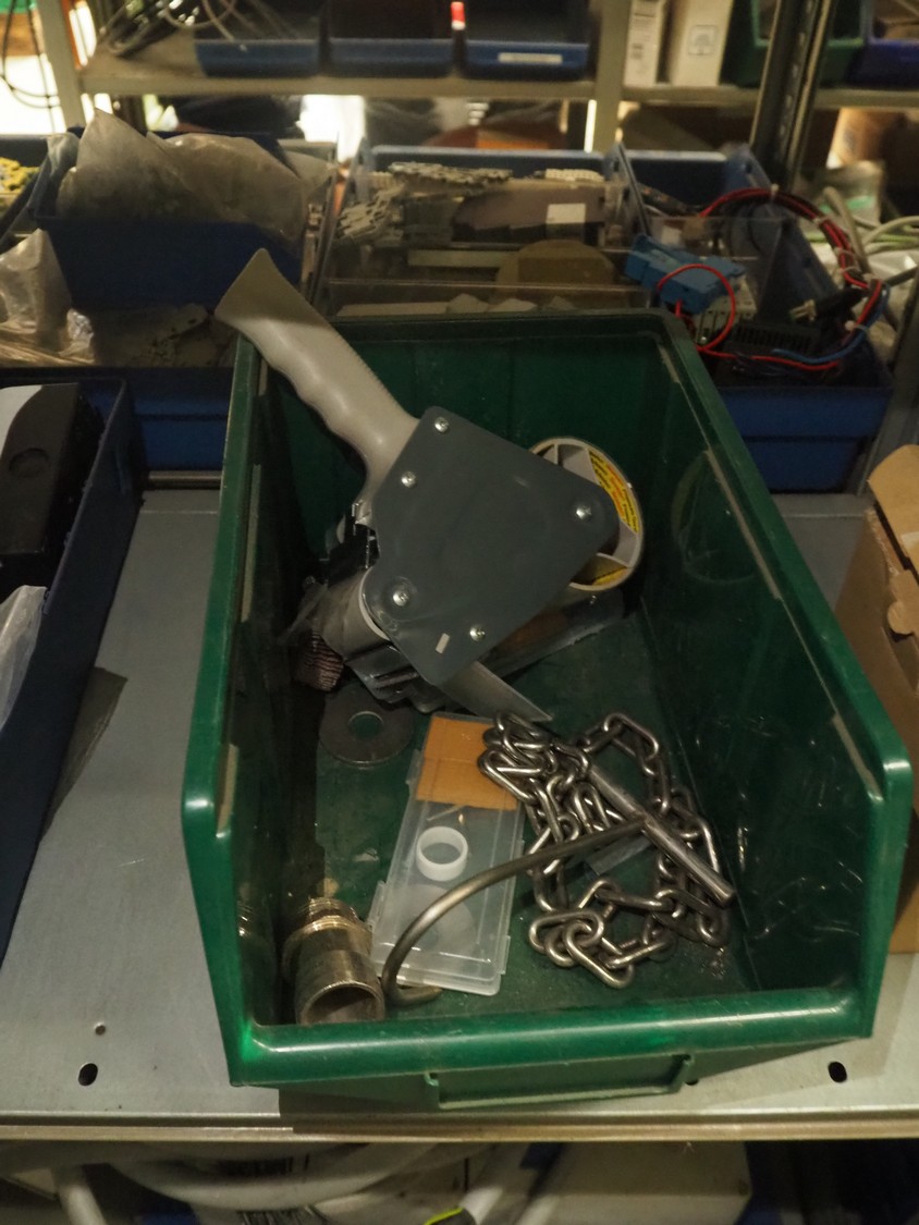 Aluminum rack with large amount of different machine parts, amoung others: small electric components, cables, emergency exit lamps, s/s switch cabinets, dimensions: 5000 mm x 830 mm x 2100 mm.