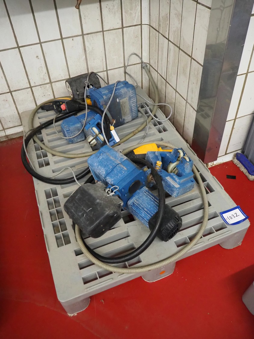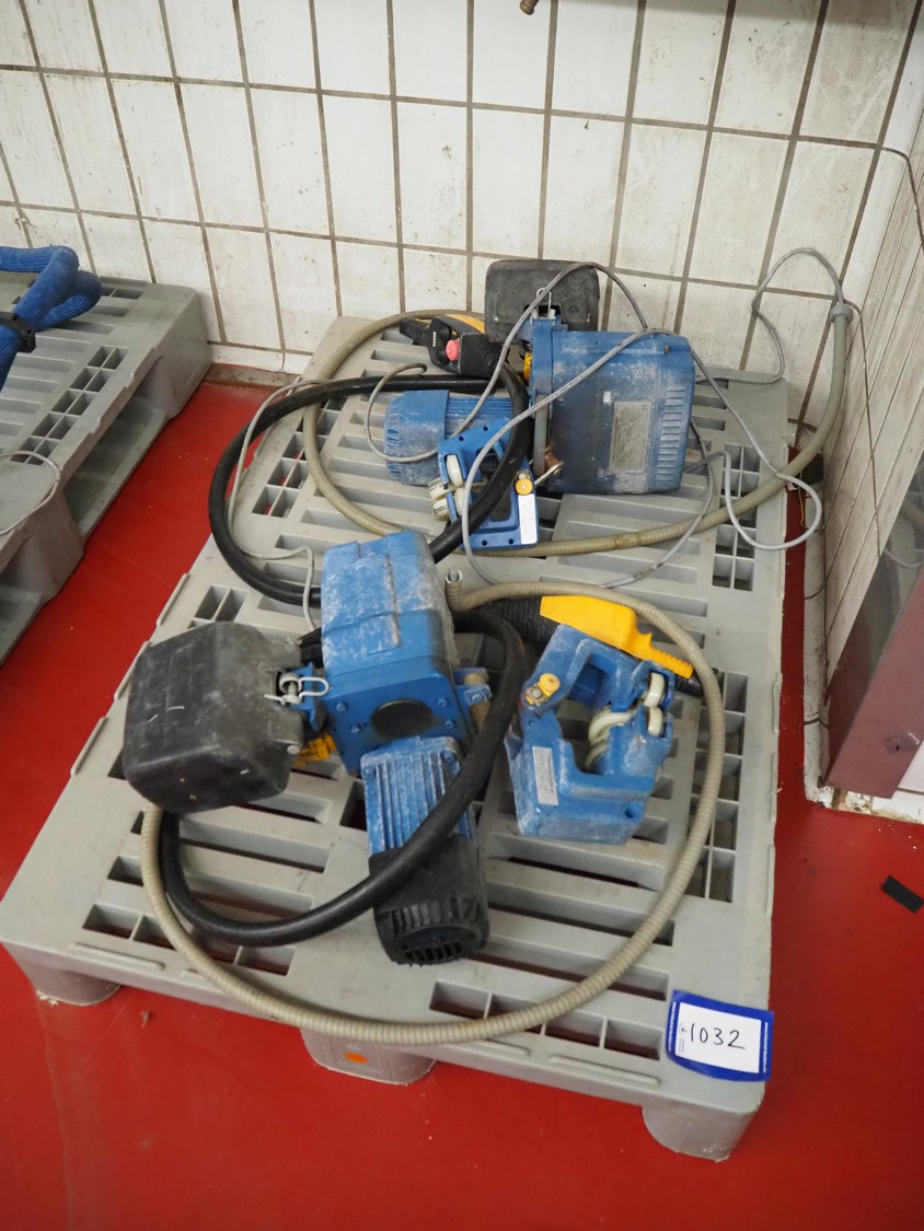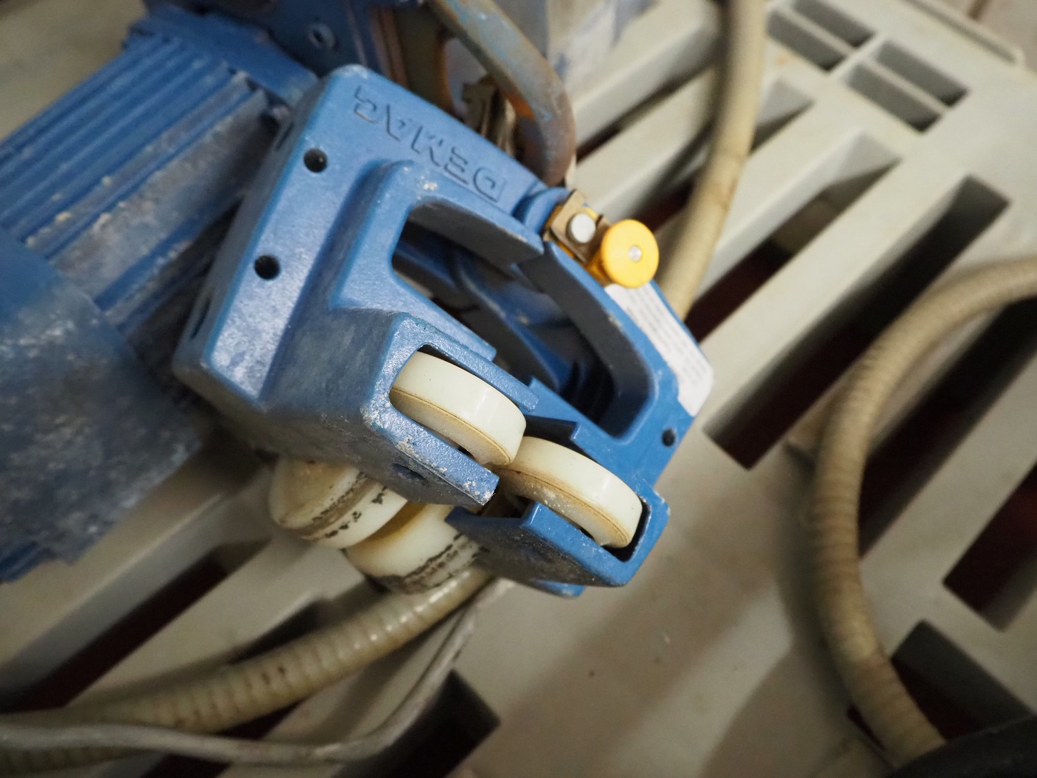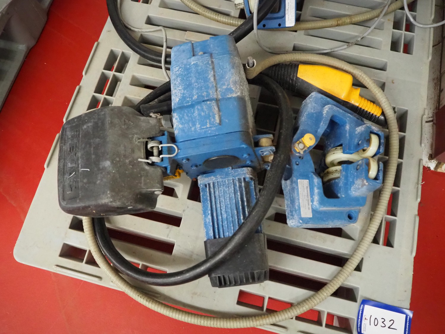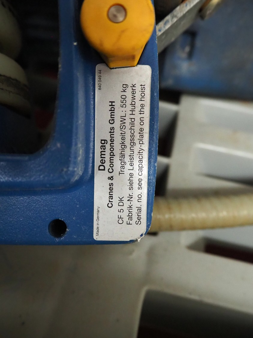 Pallet with 2 Demag hoists, capacity: 125 kg, dimensions: (2x) 550 mm x 400 mm x 250 mm.