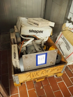 Pallet with various machine parts, among others: Strapex strap cord, housing for worm and drill, dimensions: 1200 mm x 800 mm x 650…0 bidsLot is closed -