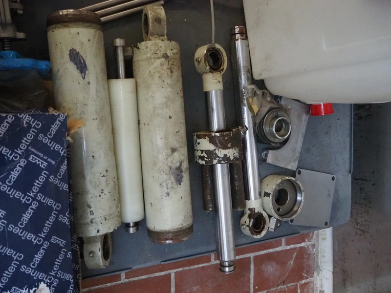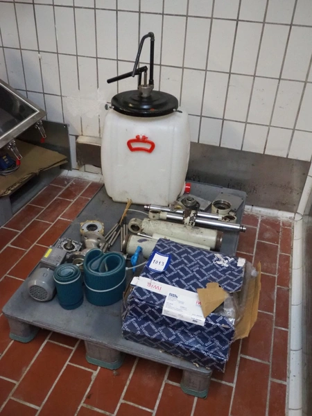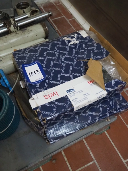 Pallet with various machine parts, among others: motor, transport belts, roller chain and tub.