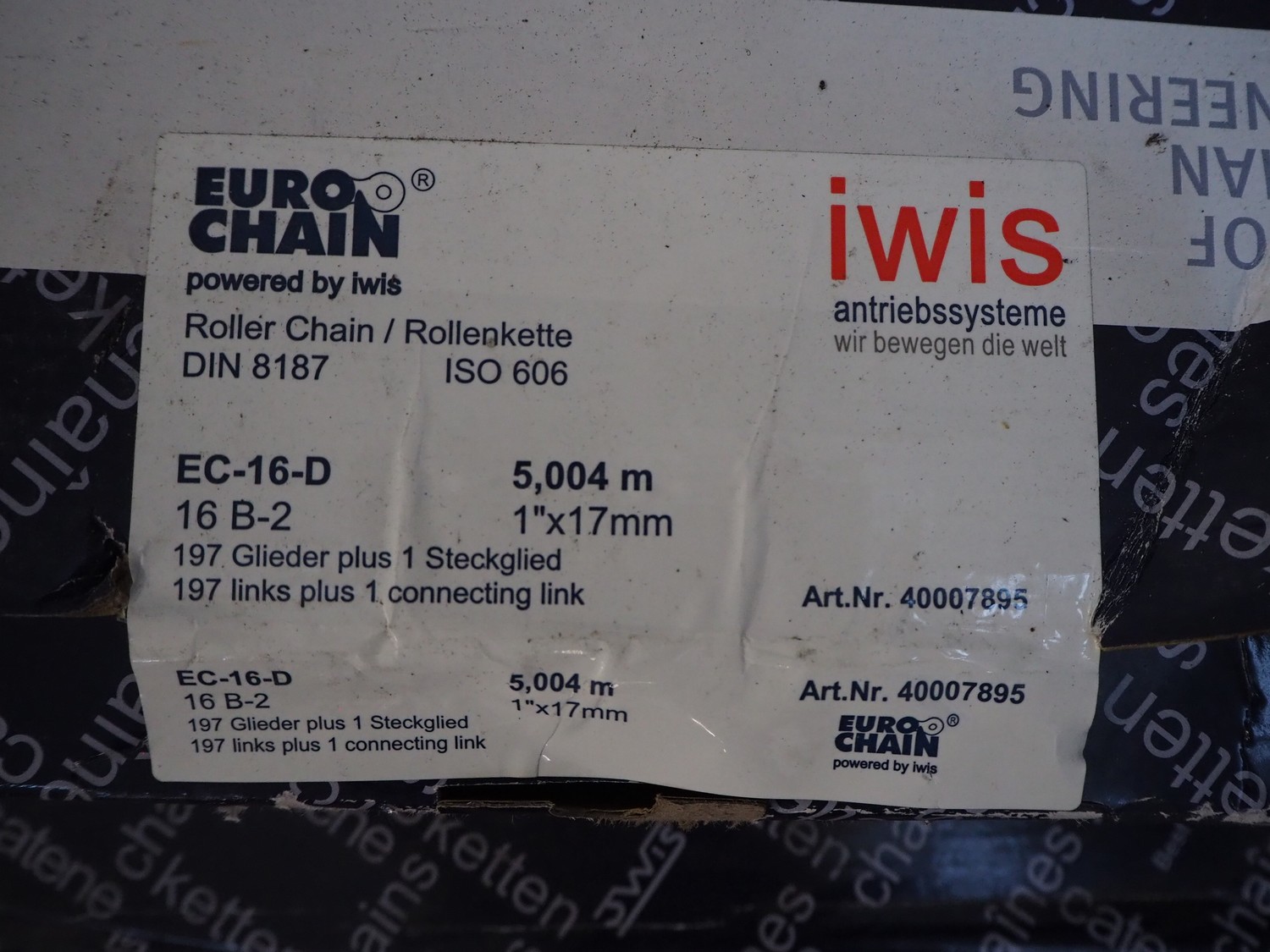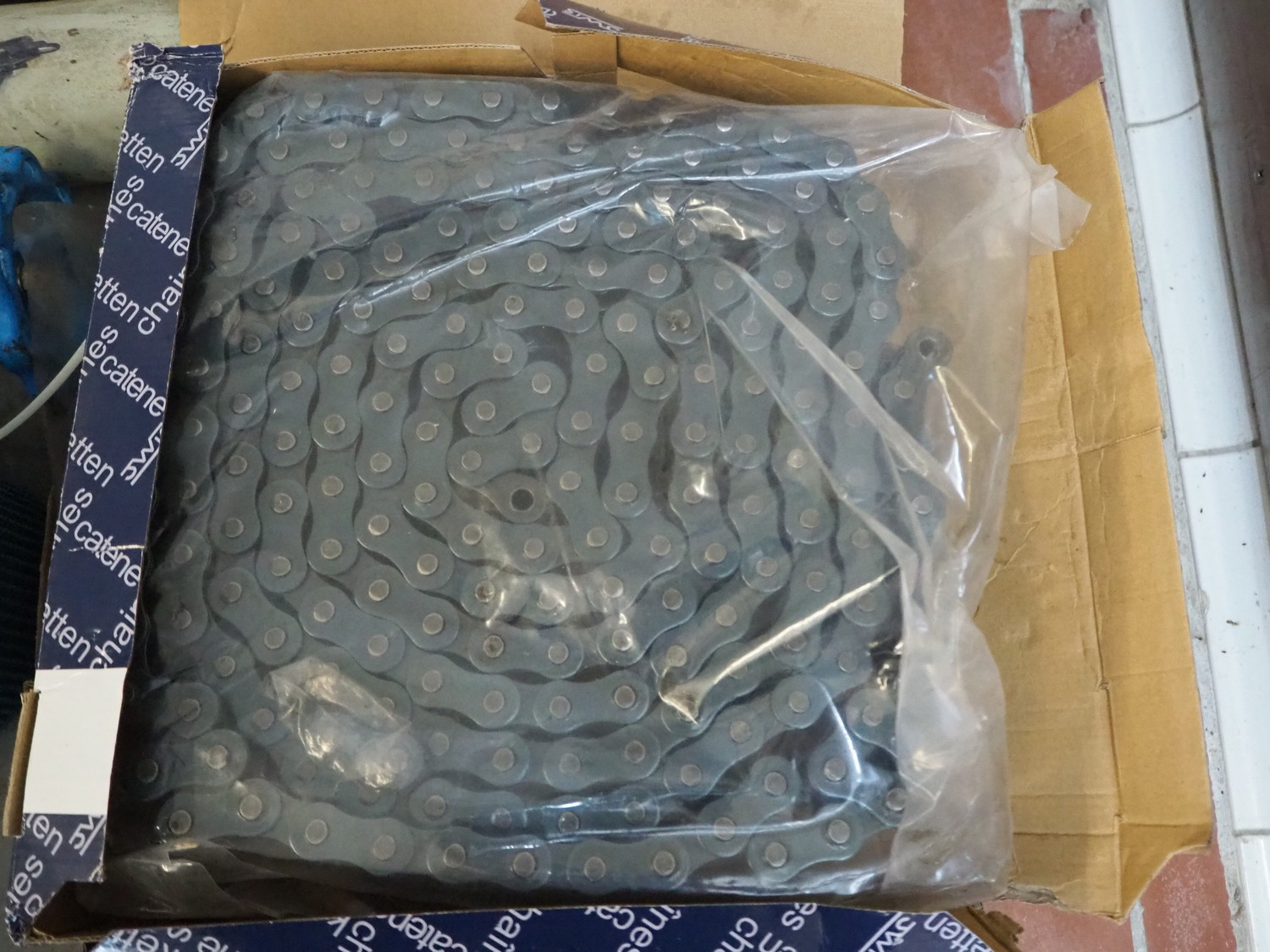 Pallet with various machine parts, among others: motor, transport belts, roller chain and tub.