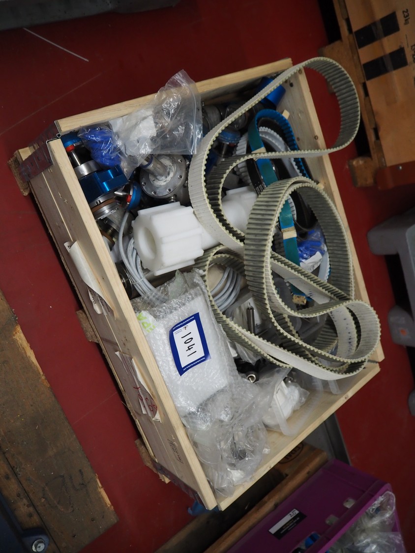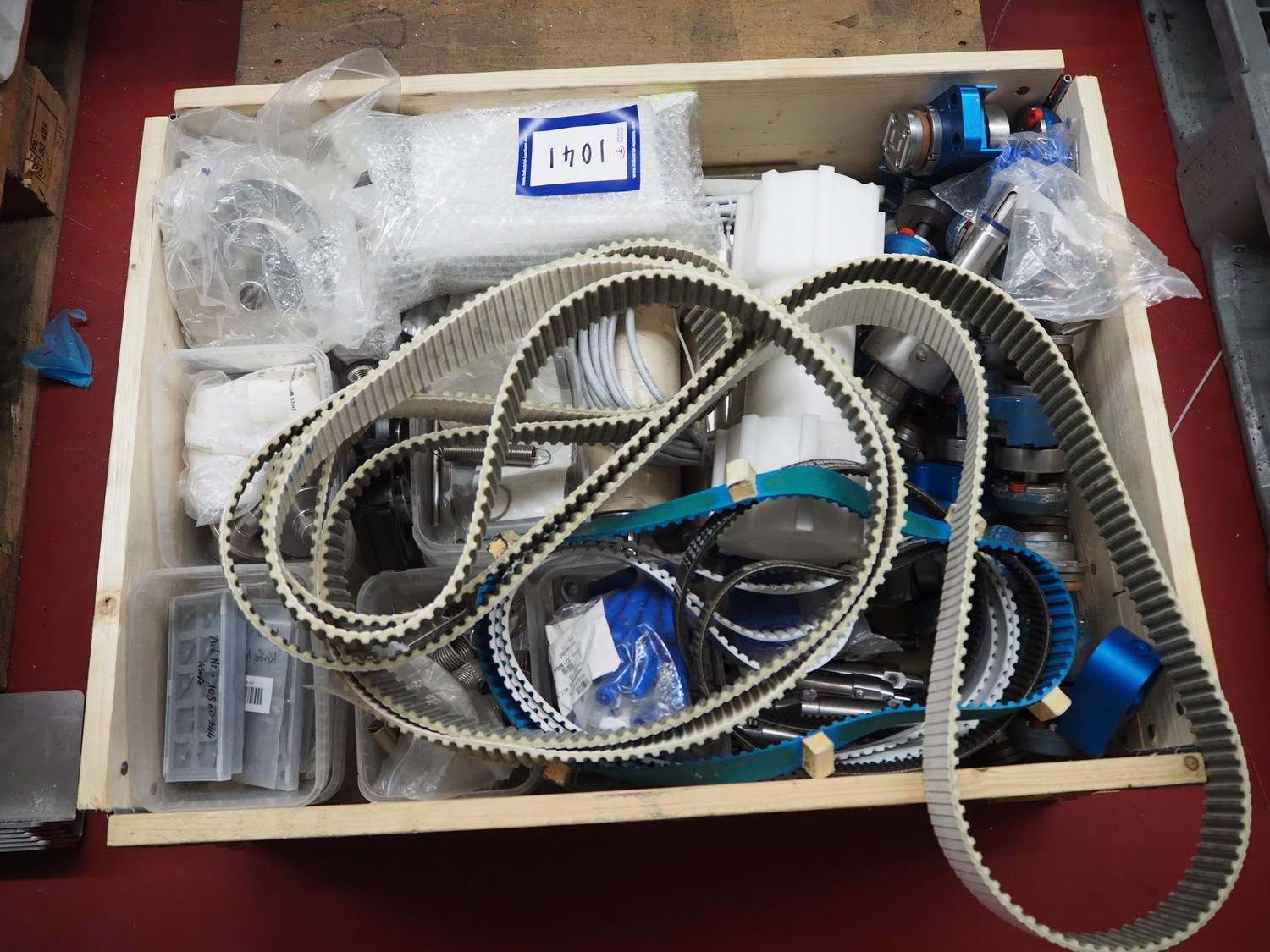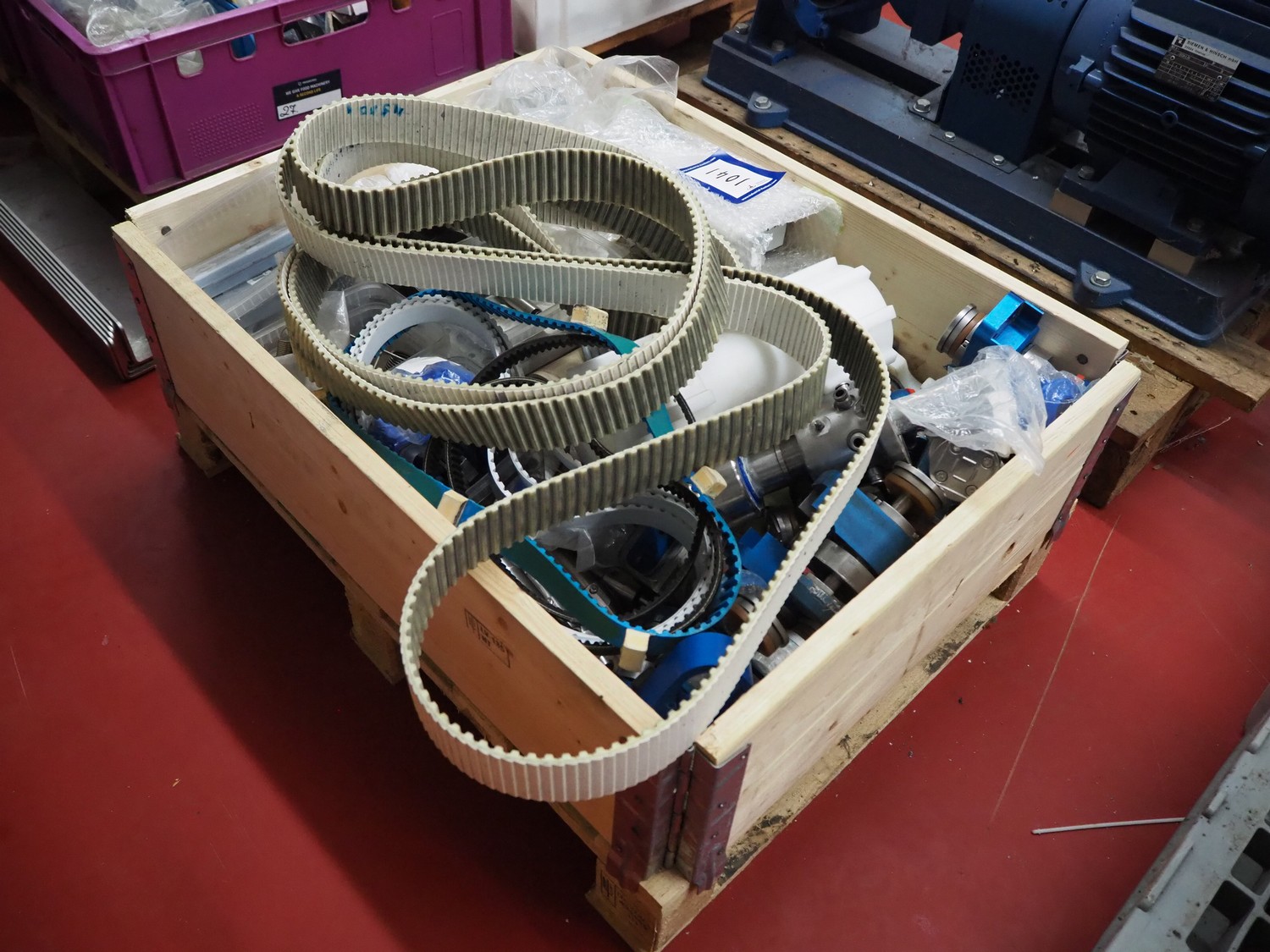 Pallet with various parts for machine drives, dimensions: 800 mm x 600 mm x 400 mm.