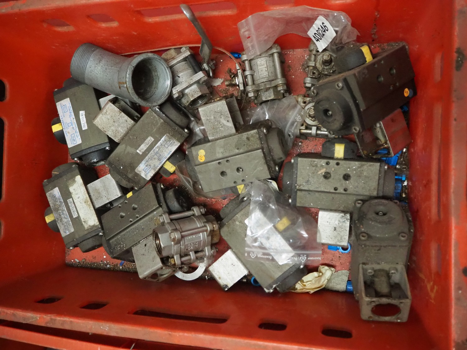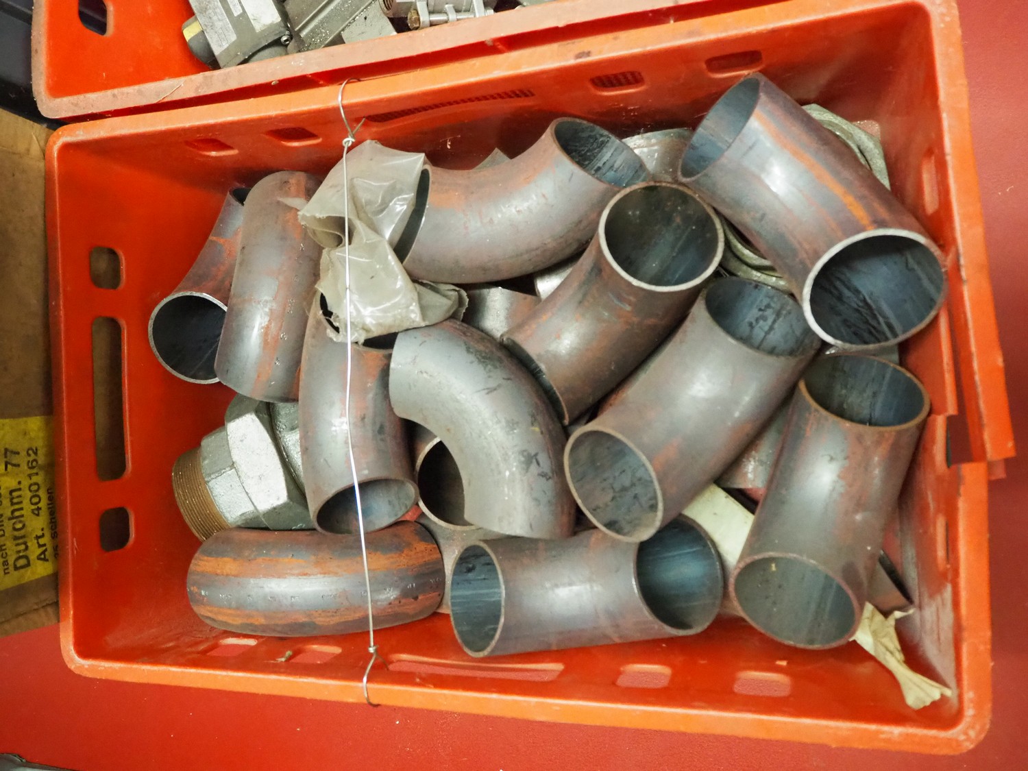 Pallet with various plumbing parts, among others: pipes, and couplings.