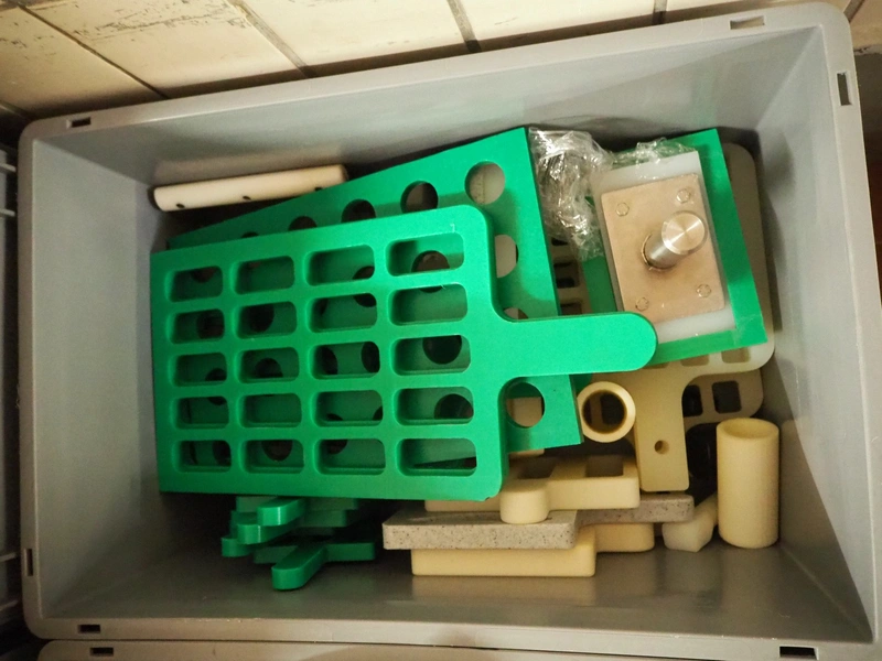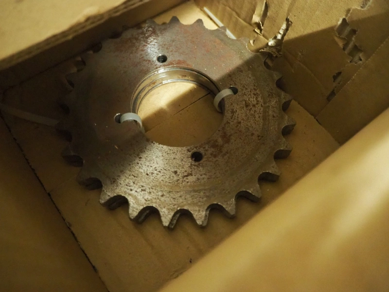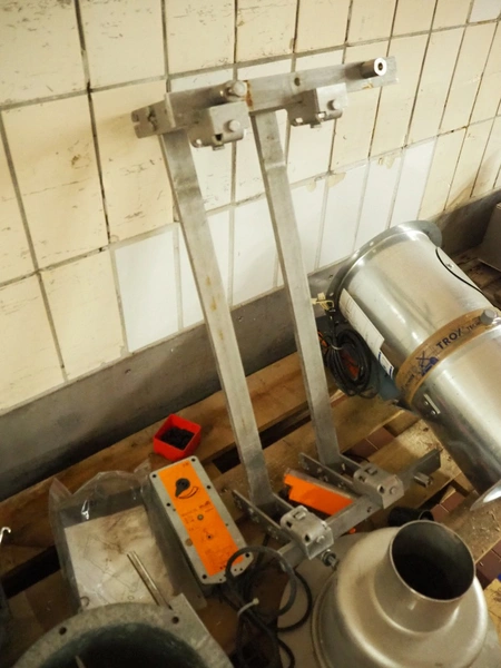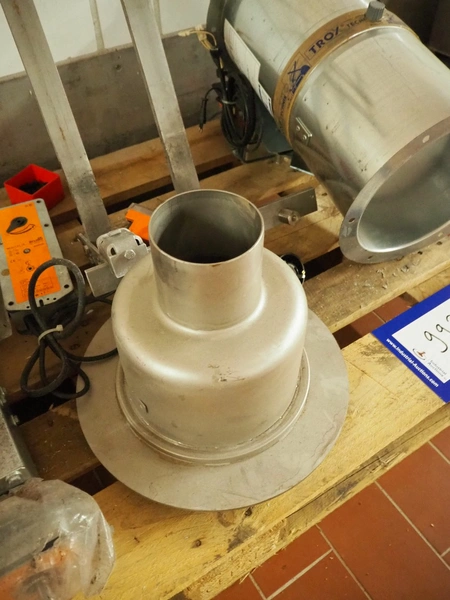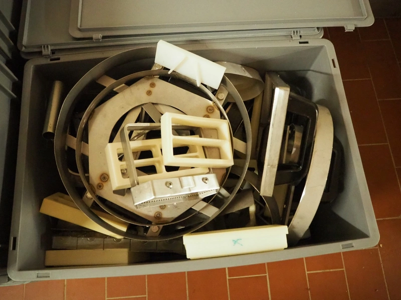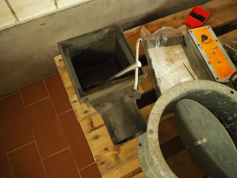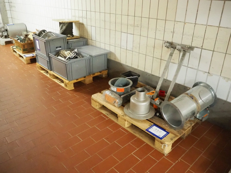 3 pallets with machine parts, among others: Parts for packaging machine, wooden reel with drive chain, parts for blower and powder machine, infeed funnel and parts for fans.