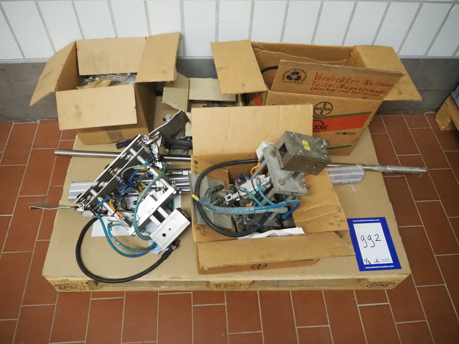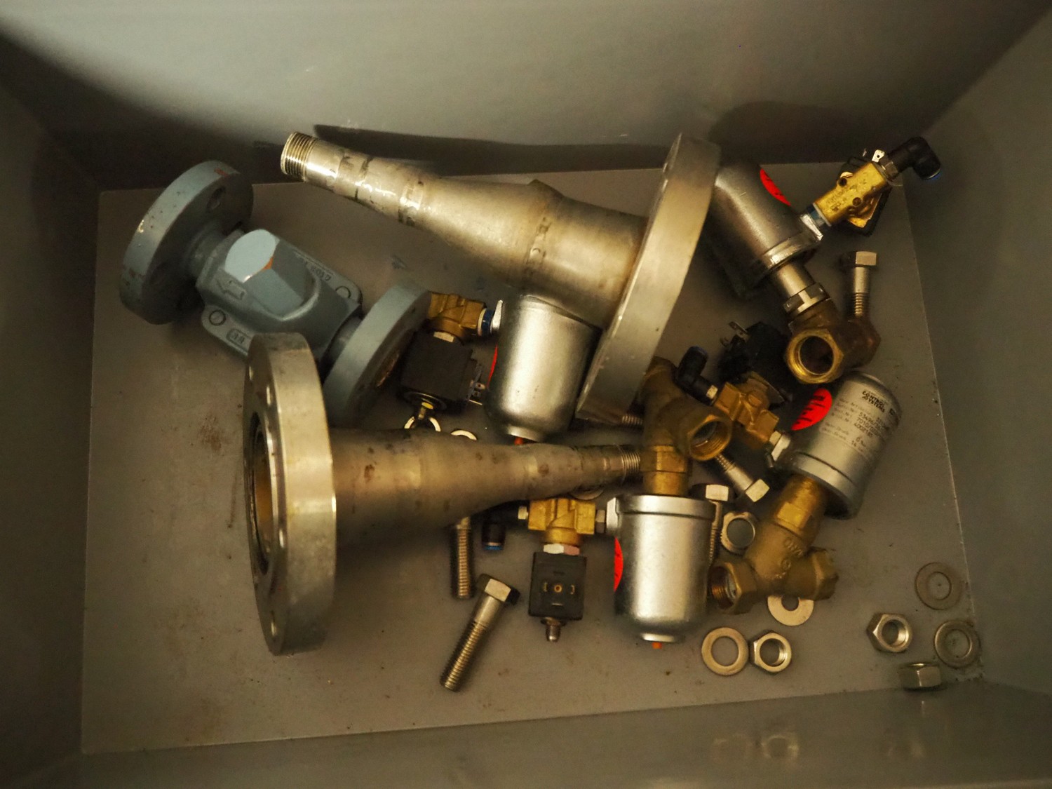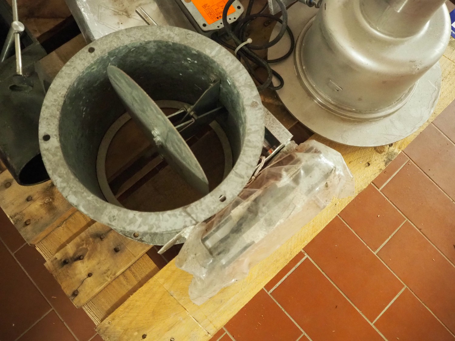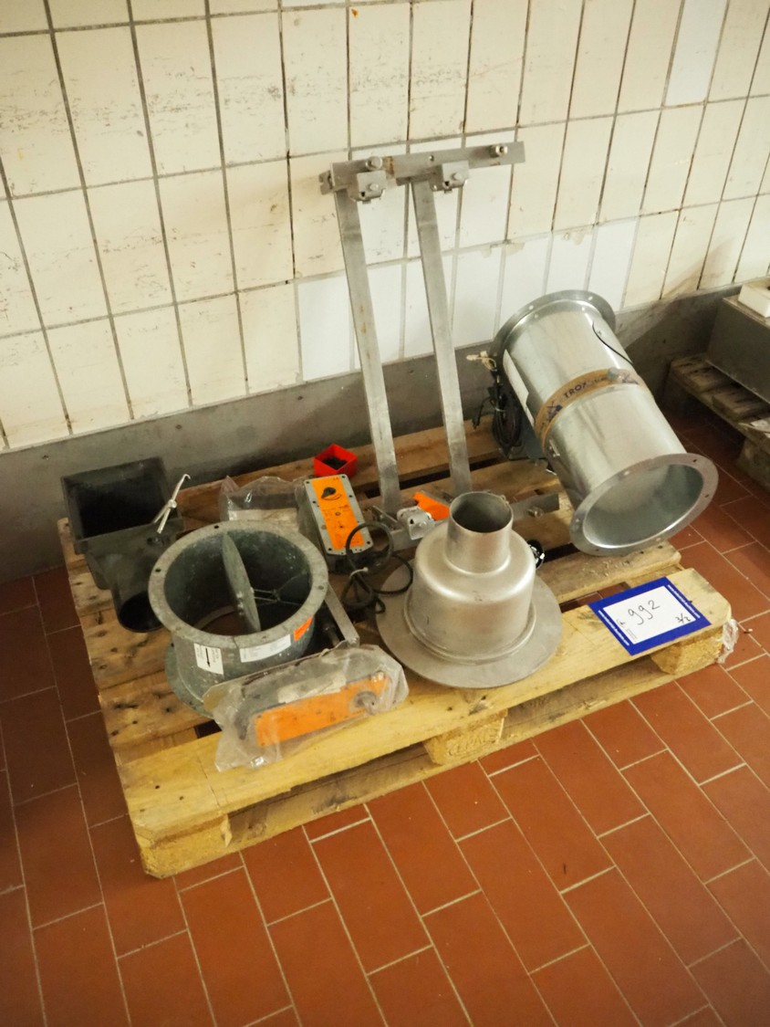 3 pallets with machine parts, among others: Parts for packaging machine, wooden reel with drive chain, parts for blower and powder machine, infeed funnel and parts for fans.