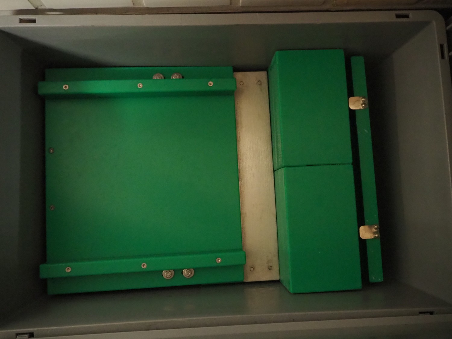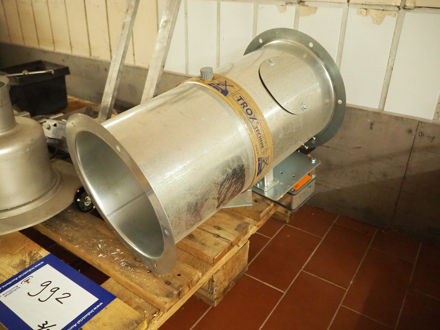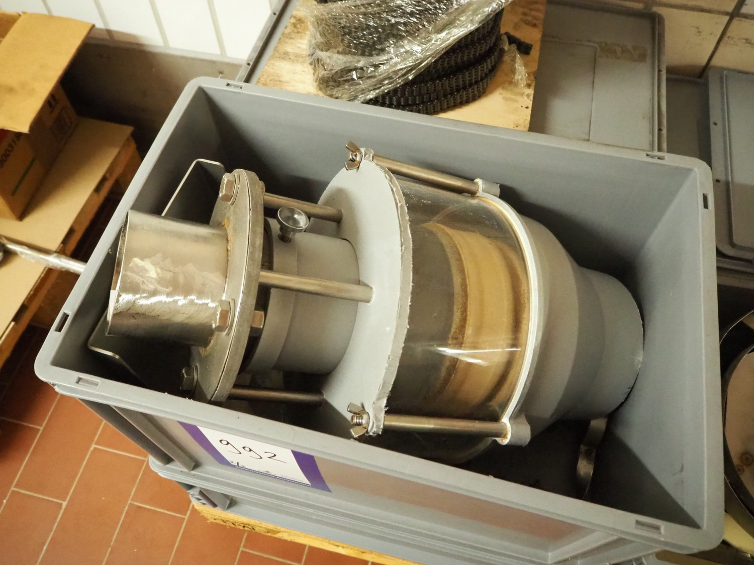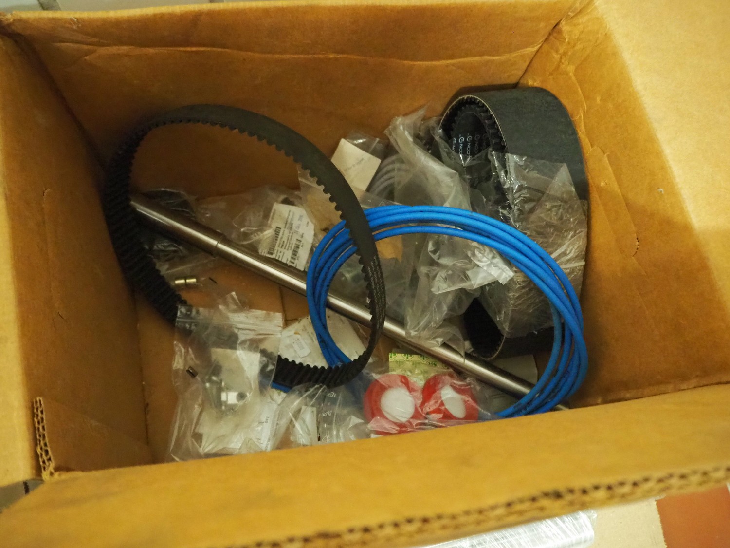 3 pallets with machine parts, among others: Parts for packaging machine, wooden reel with drive chain, parts for blower and powder machine, infeed funnel and parts for fans.