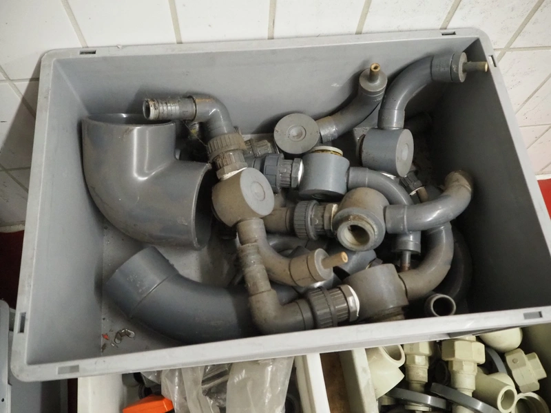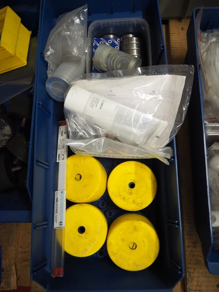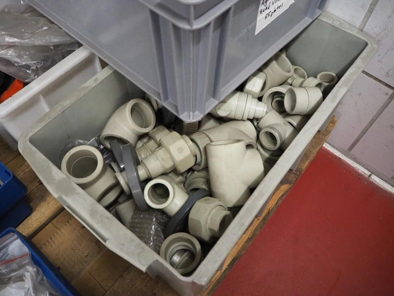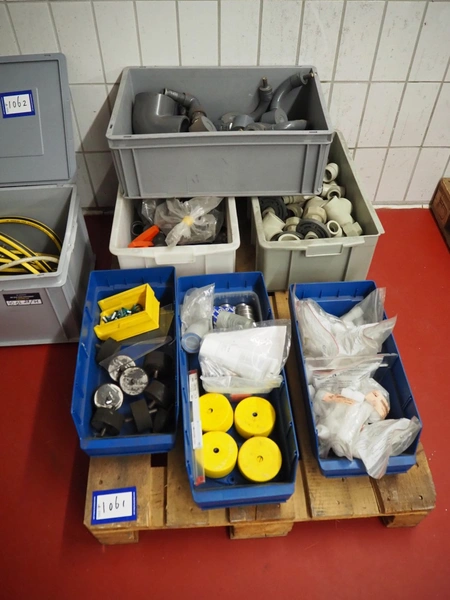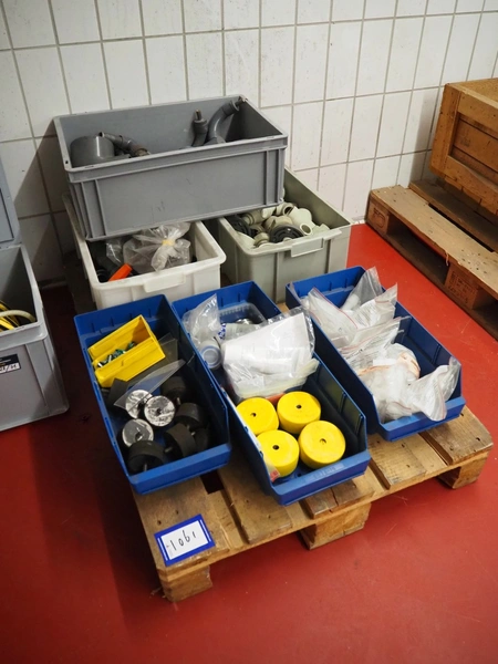 Pallet with various parts, among others: plastic couplings for lab, wheels, and plastic valves, dimensions: 1200 mm x 800 mm x 550 mm.