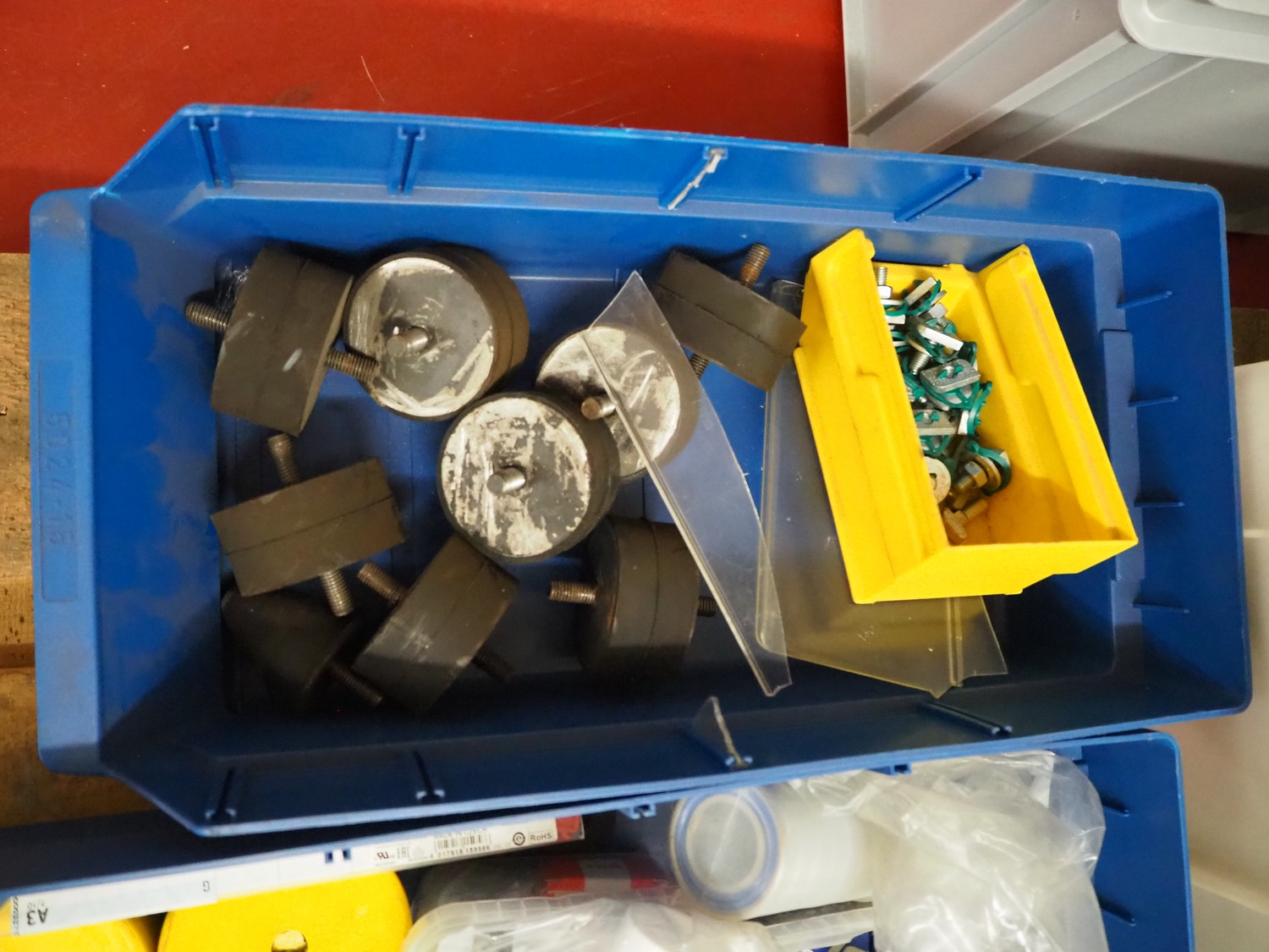 Pallet with various parts, among others: plastic couplings for lab, wheels, and plastic valves, dimensions: 1200 mm x 800 mm x 550 mm.