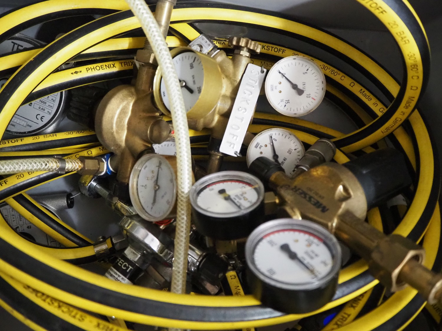 Pallet with spare parts, among others: meters, hoses, valves and cable clamps, dimensions: 1200 mm x 800 mm x 700 mm.