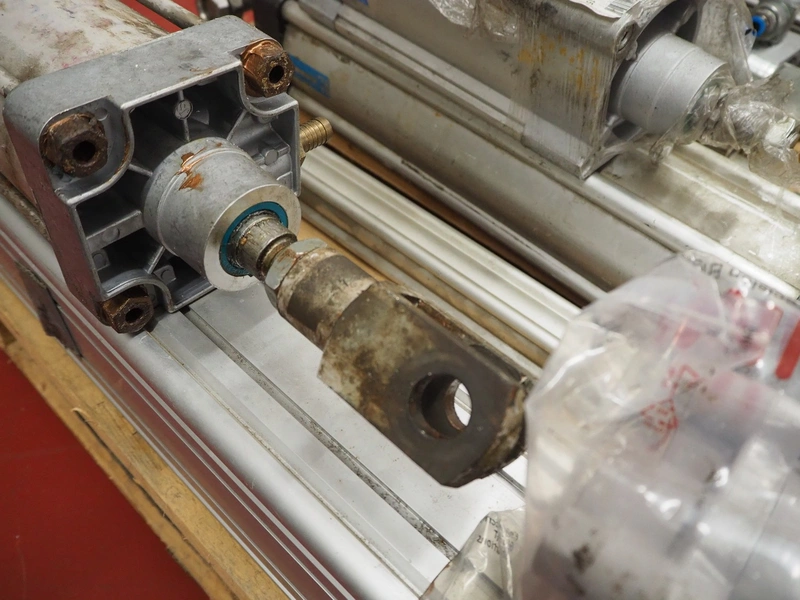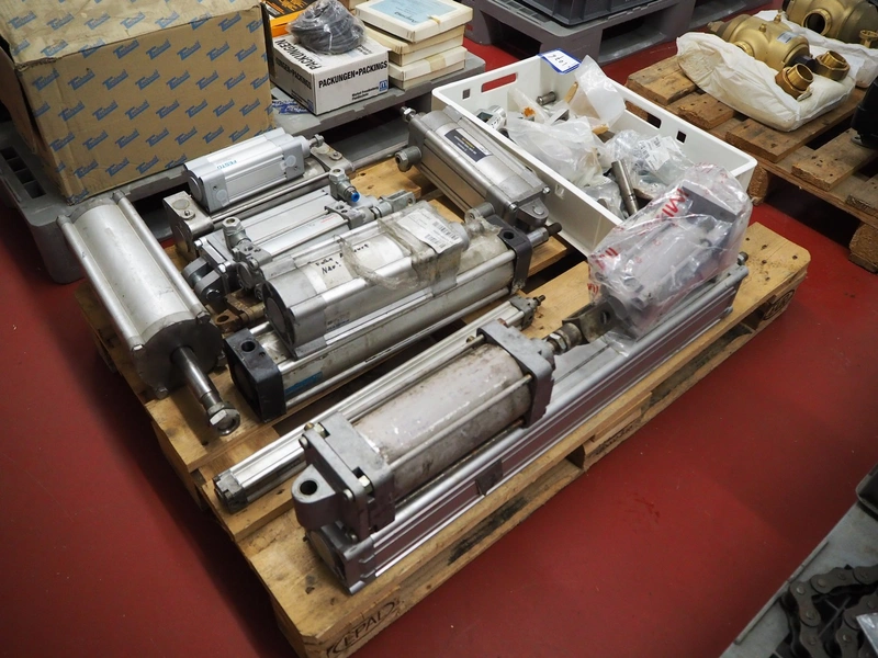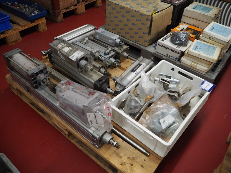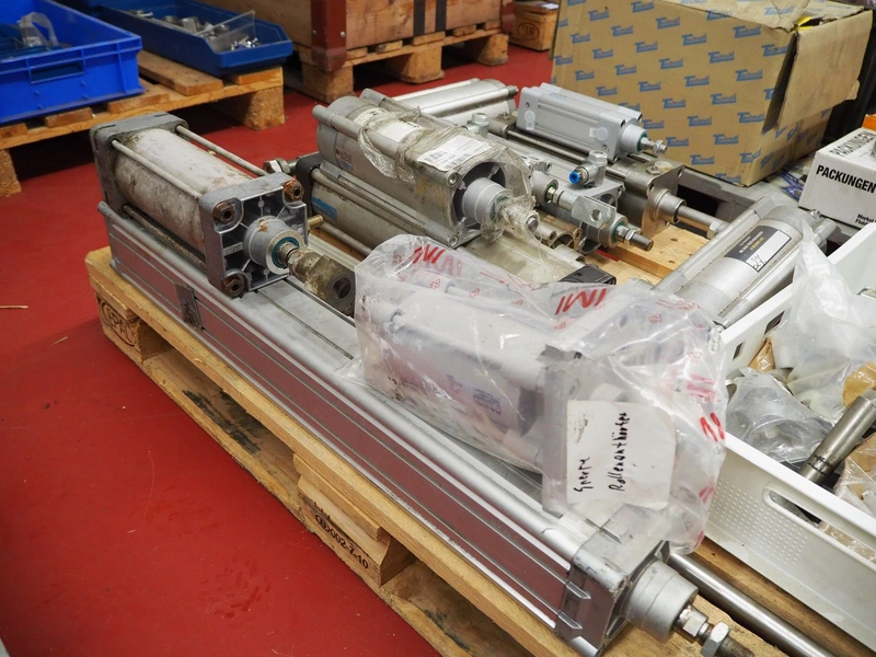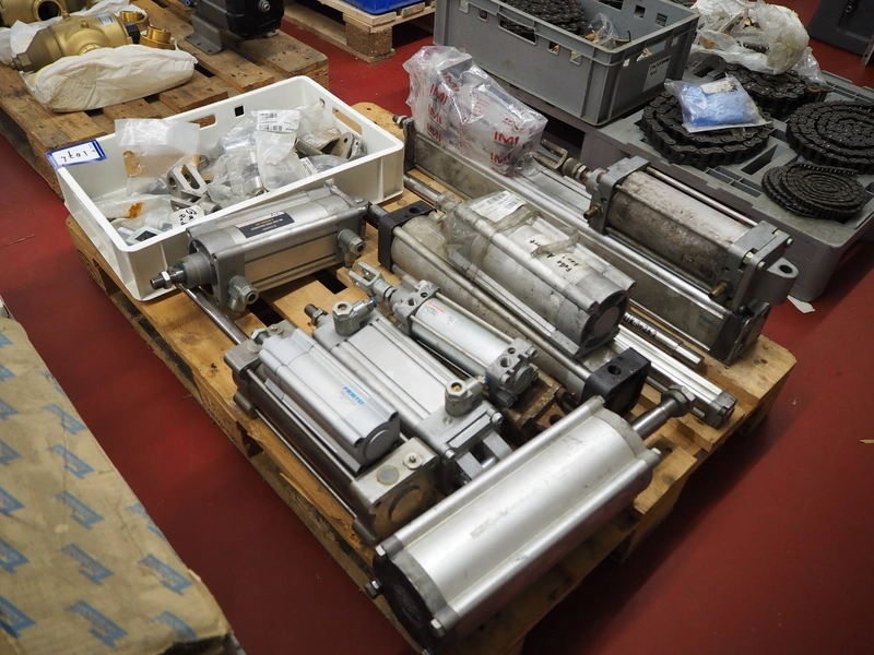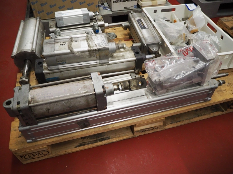 Pallet with large amount of Festo pneumatic arms, dimensions: 1200 mm x 800 mm x 450 mm.