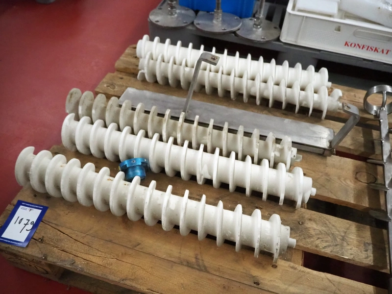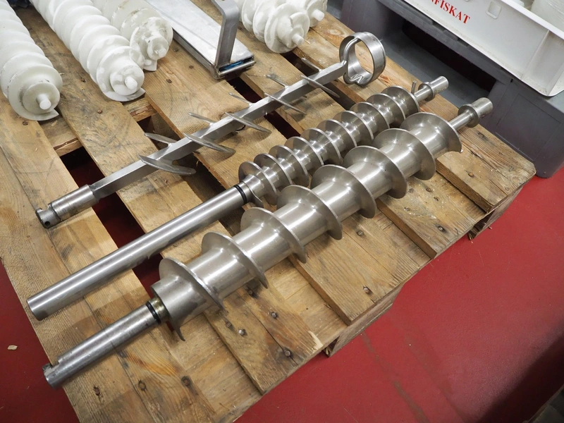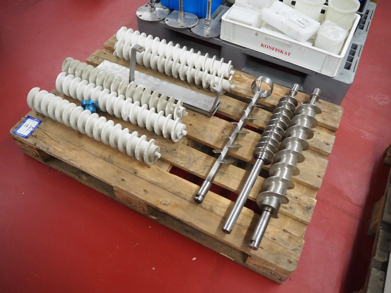 Pallet with plastic and s/s worms for cheese / bread crumb spreaders, dimensions: 1200 mm x 800 mm x 250 mm.