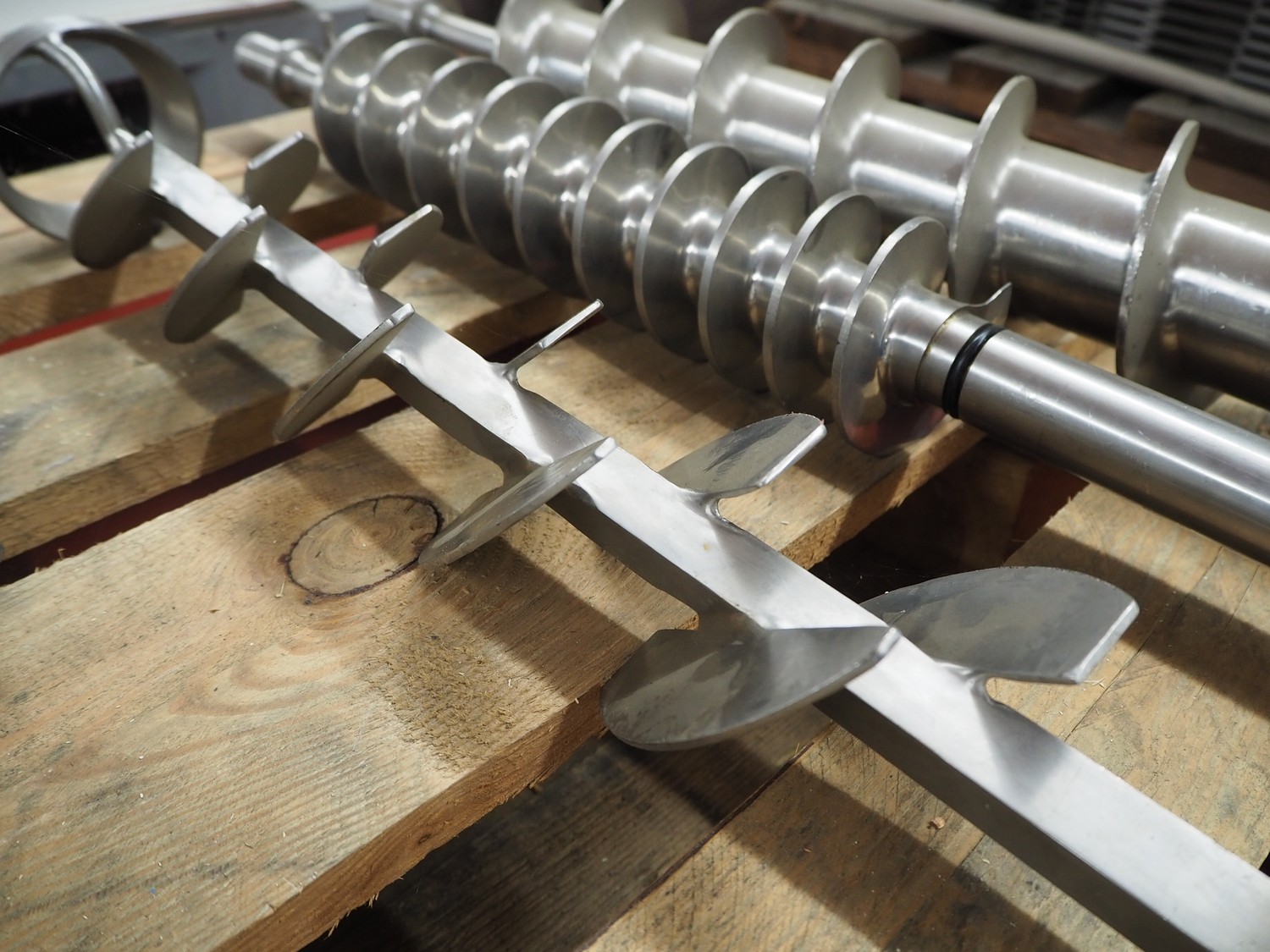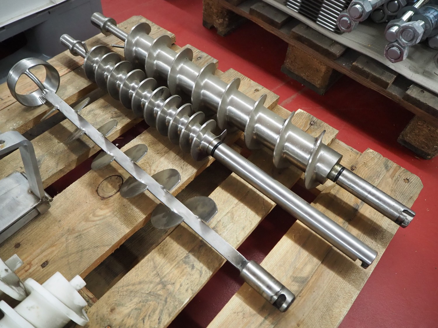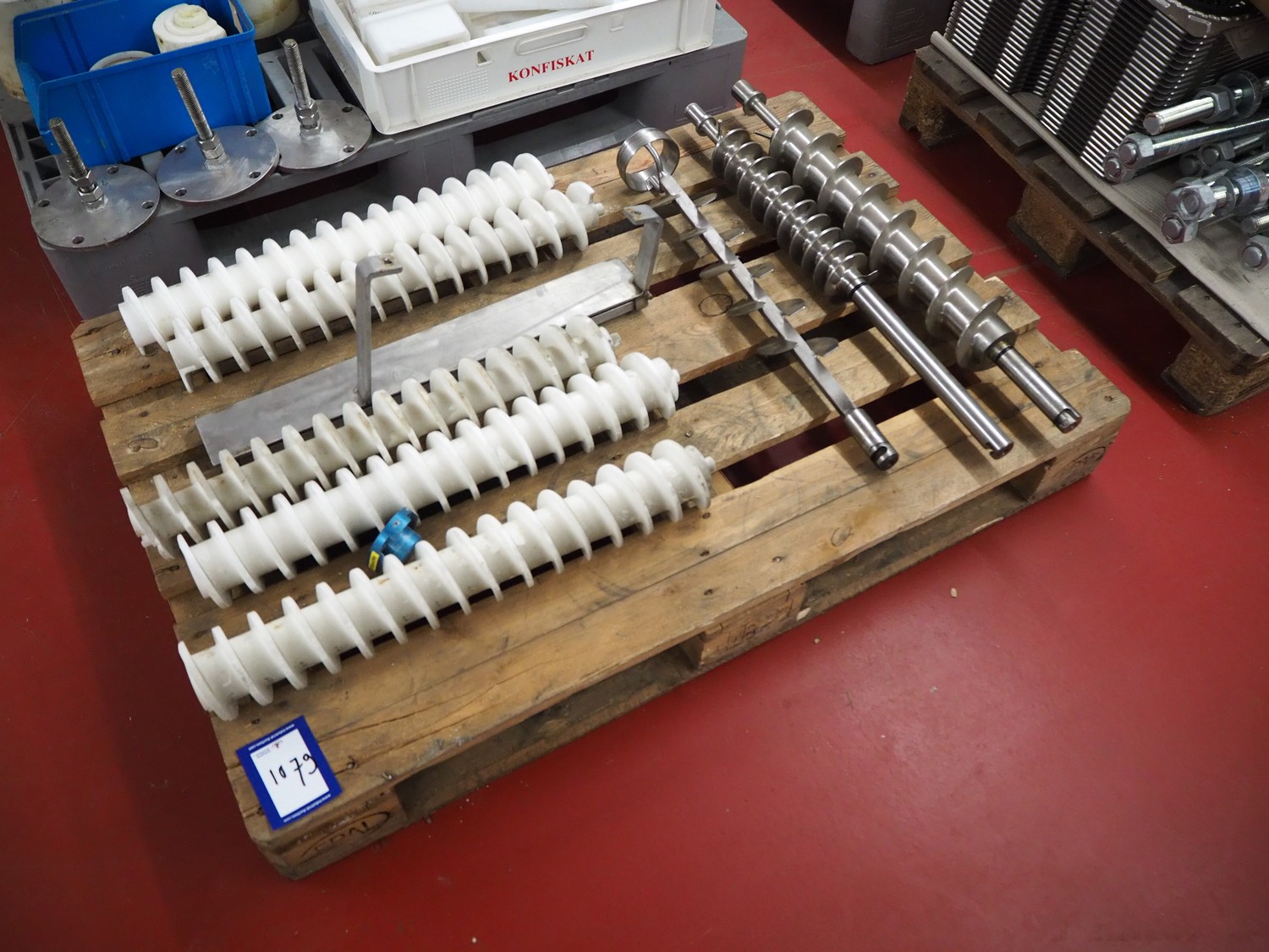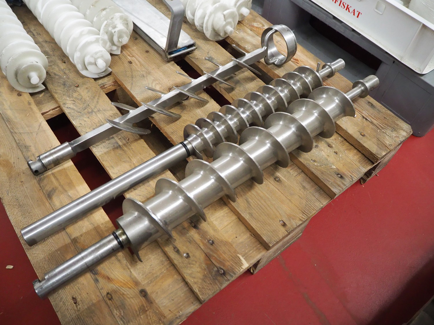 Pallet with plastic and s/s worms for cheese / bread crumb spreaders, dimensions: 1200 mm x 800 mm x 250 mm.