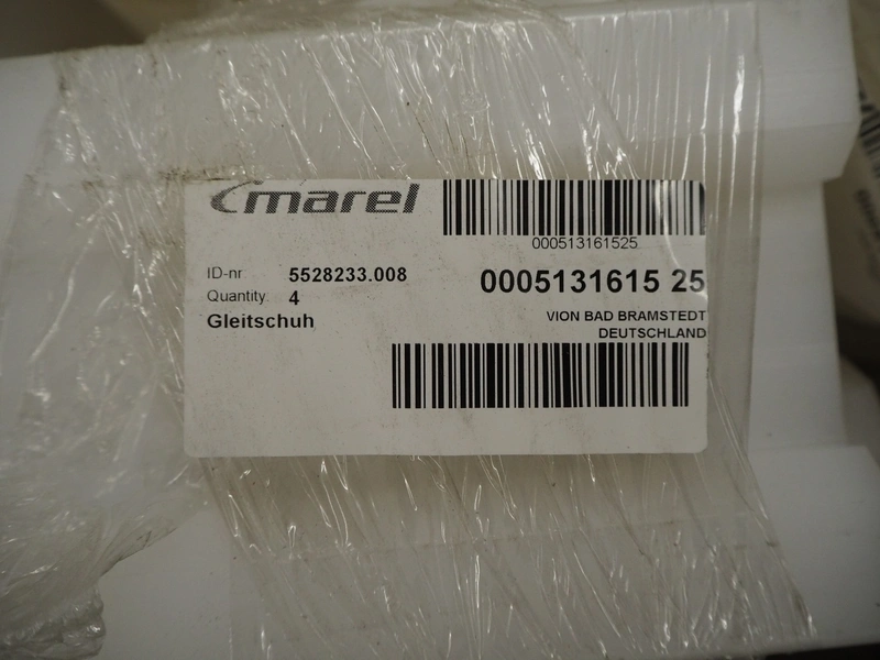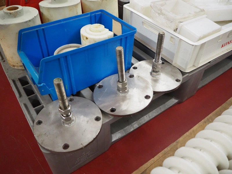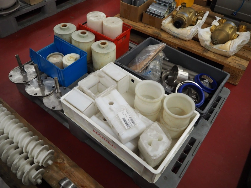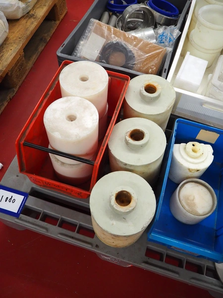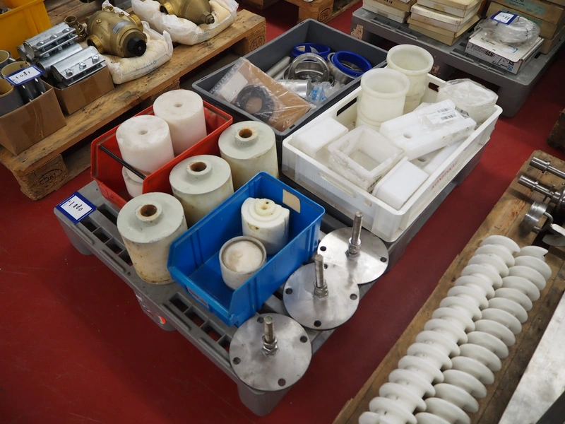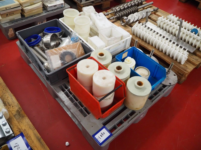 Pallet with parts for portioning machine and s/s and plastic feet.