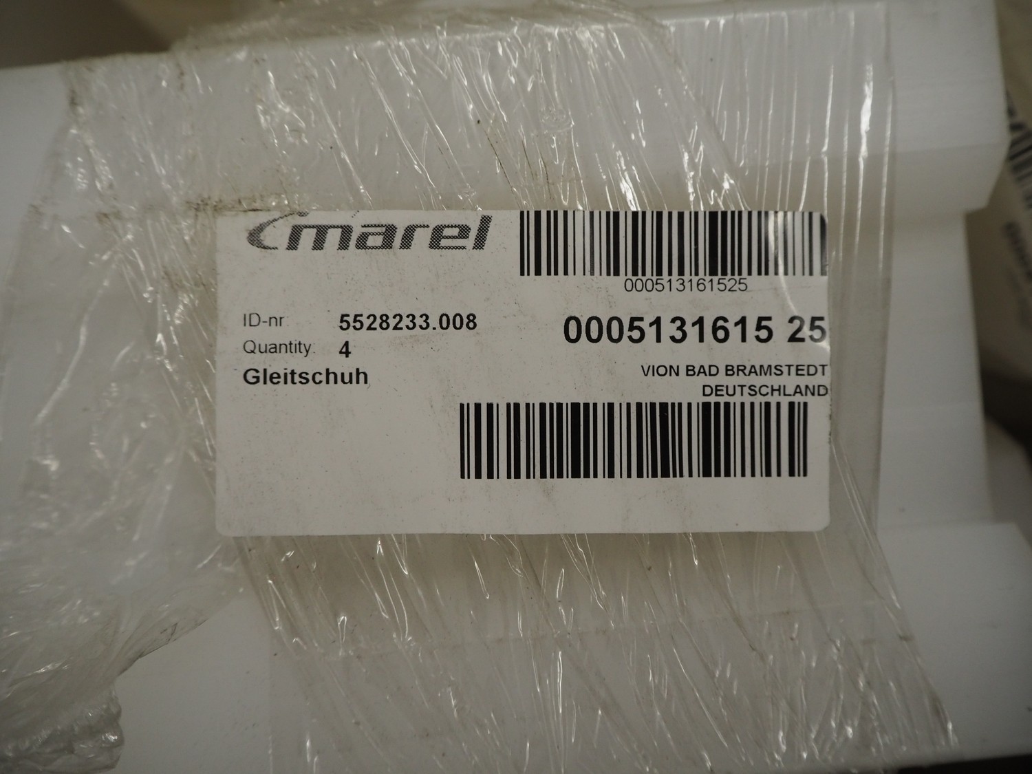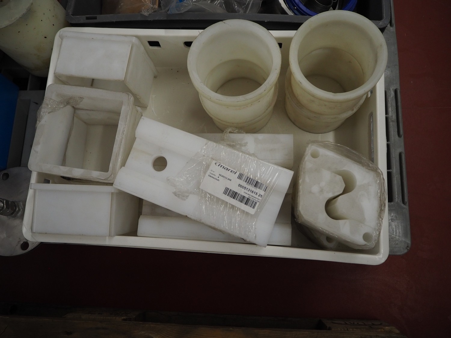 Pallet with parts for portioning machine and s/s and plastic feet.