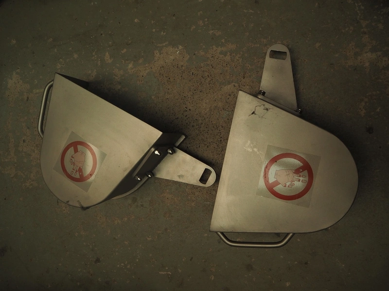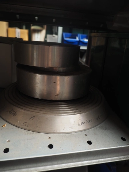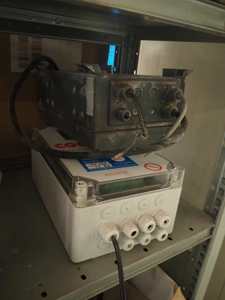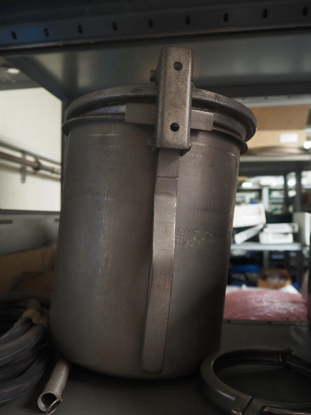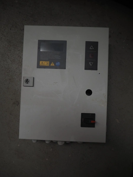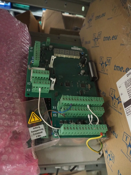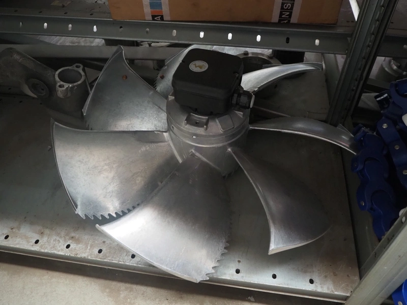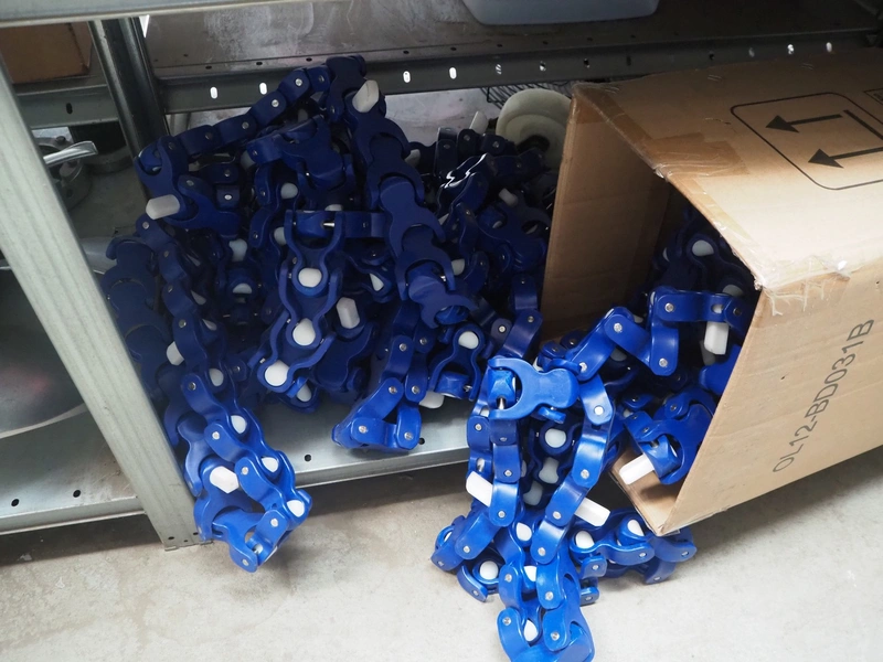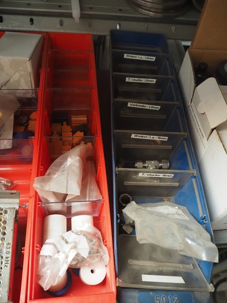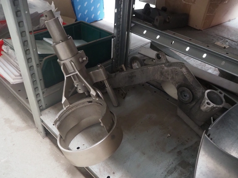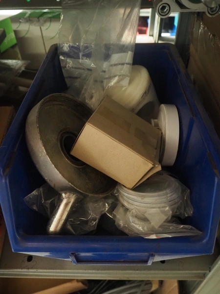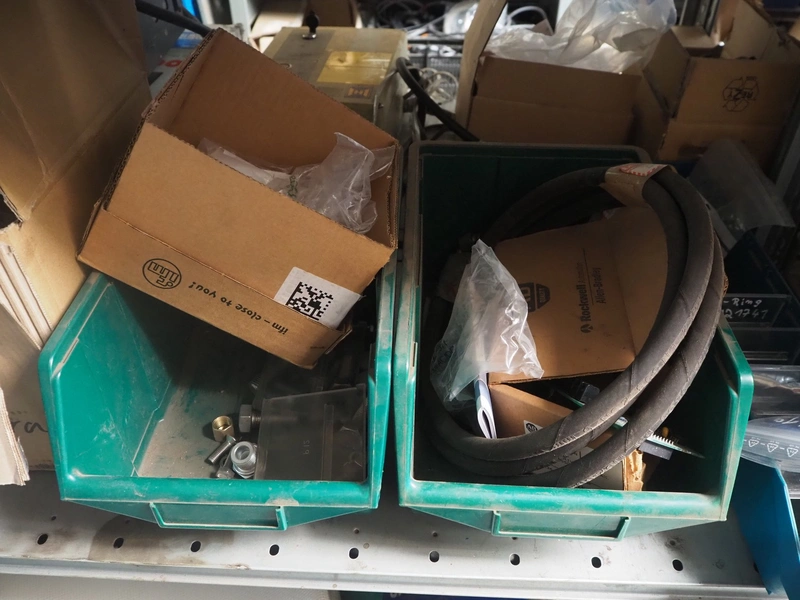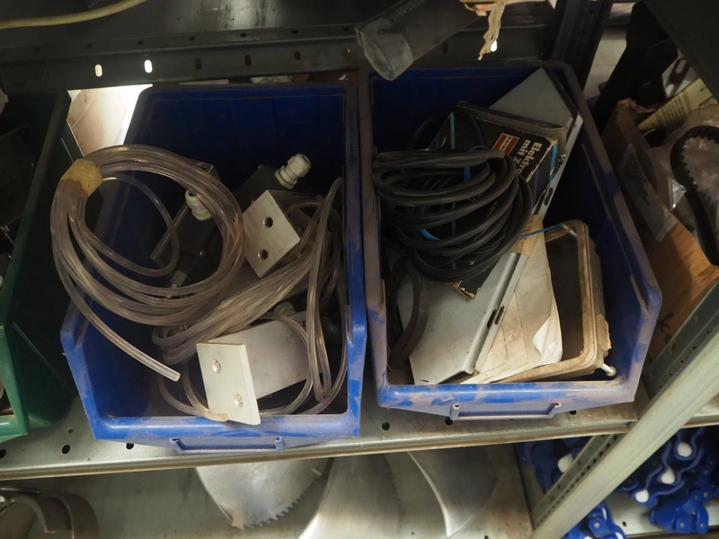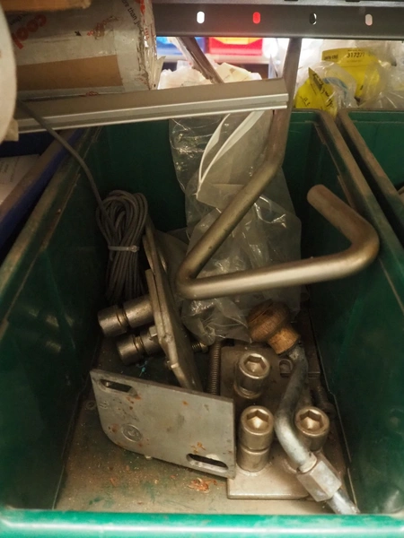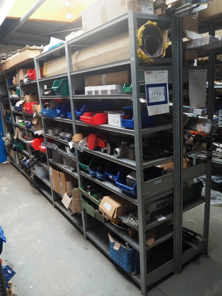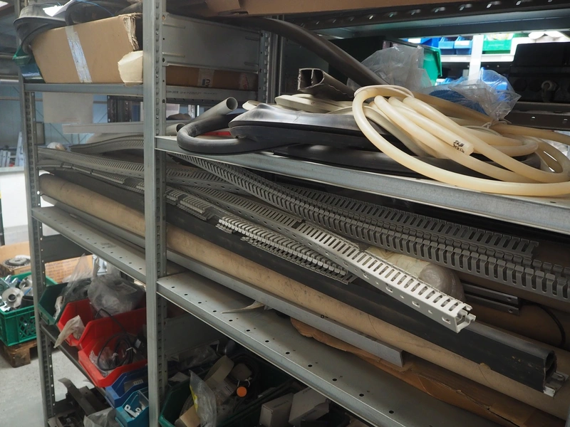 Aluminum rack with large amount of different machine parts, amoung others: vacuum pump, plastic chain conveyor, parts for electric shutter door, electric components, dimensions: 5000 mm x 830 mm x 2100 mm.