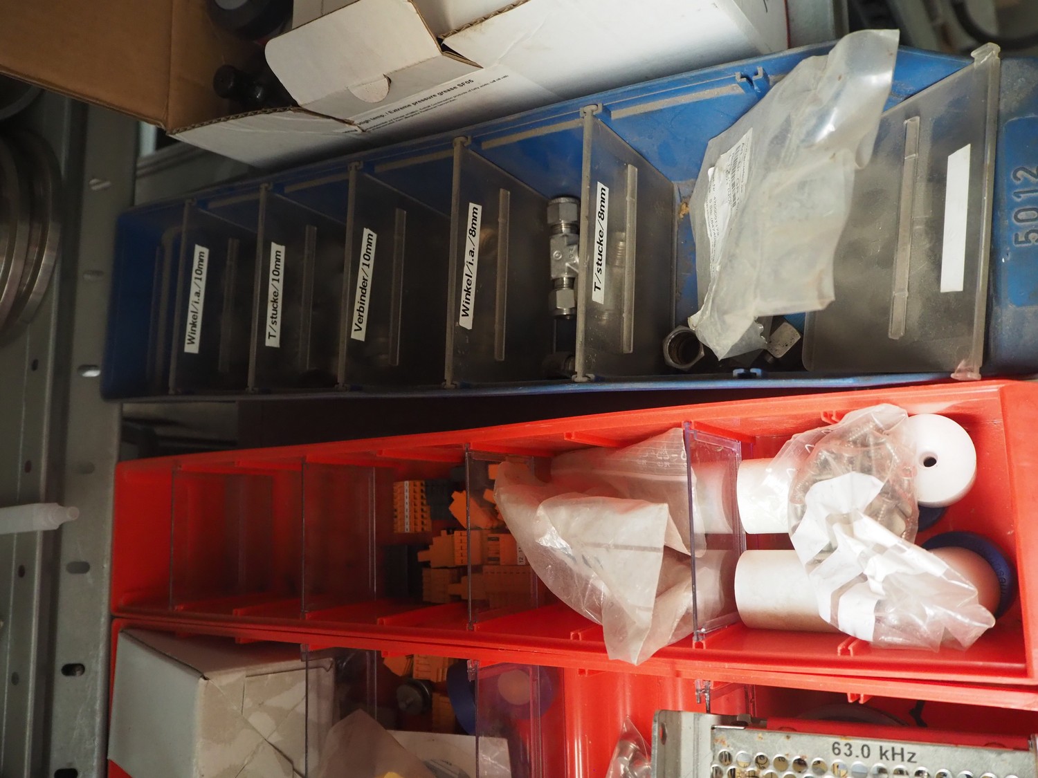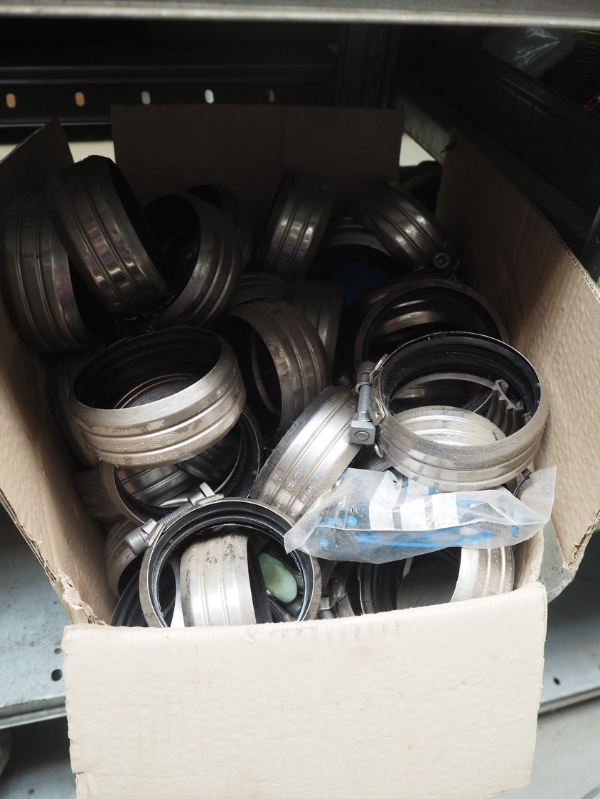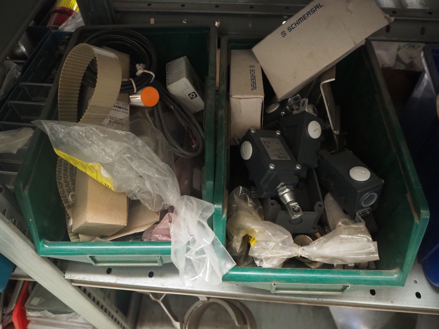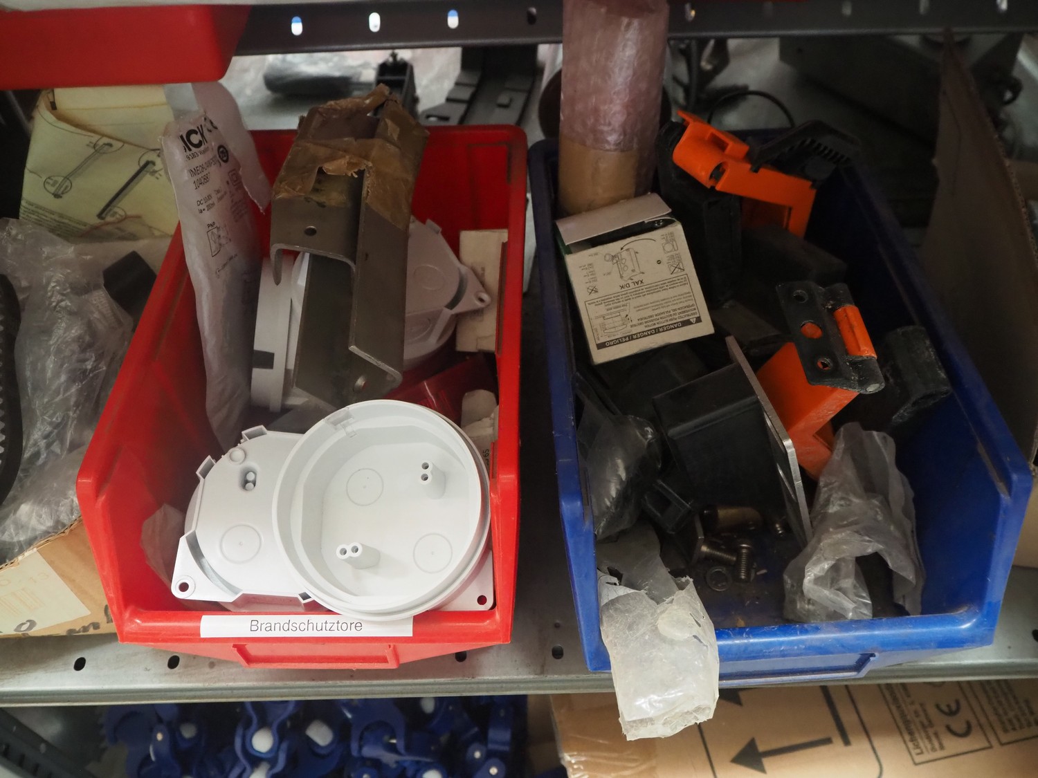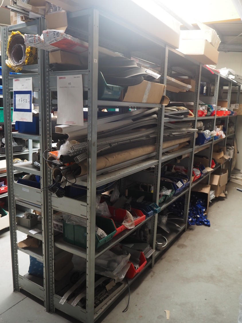 Aluminum rack with large amount of different machine parts, amoung others: vacuum pump, plastic chain conveyor, parts for electric shutter door, electric components, dimensions: 5000 mm x 830 mm x 2100 mm.