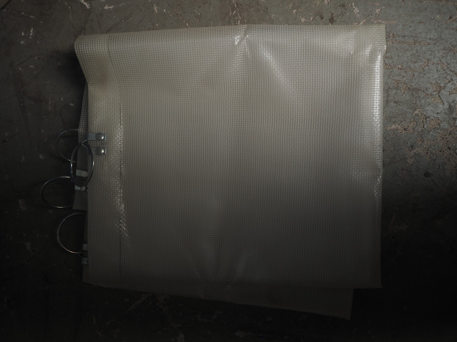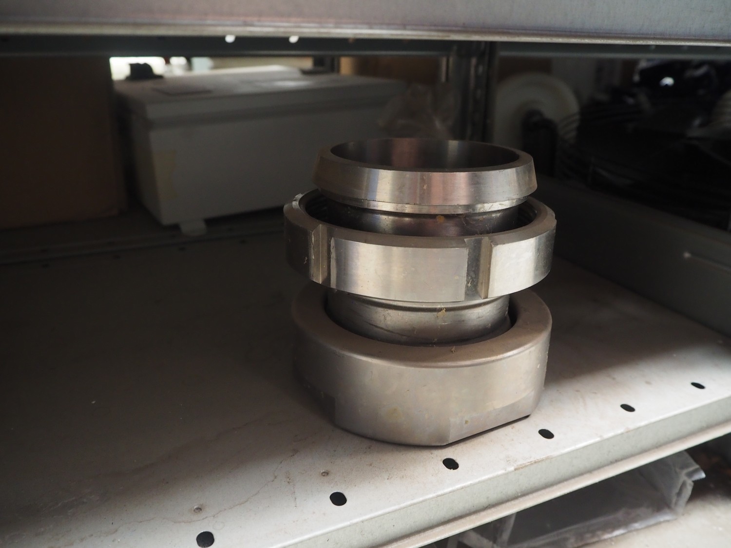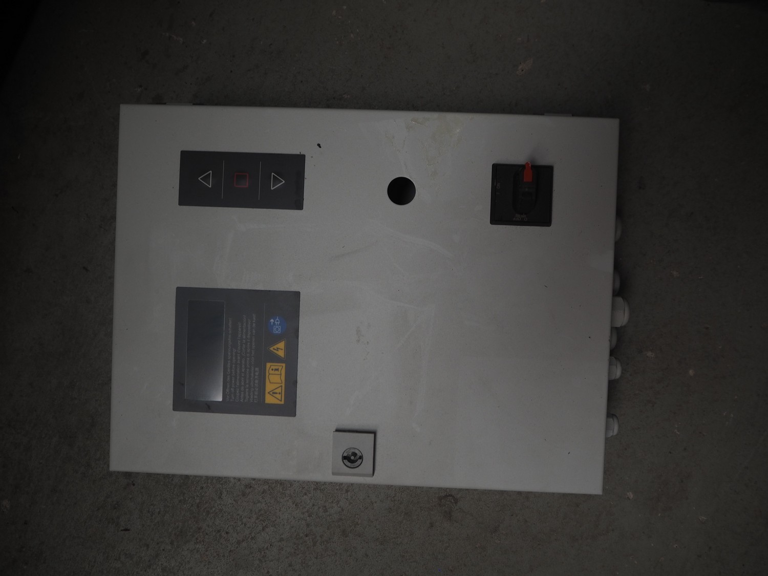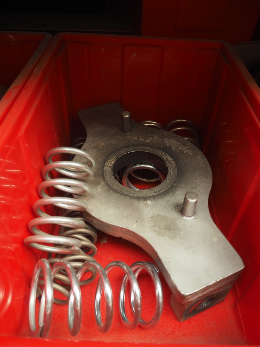 Aluminum rack with large amount of different machine parts, amoung others: vacuum pump, plastic chain conveyor, parts for electric shutter door, electric components, dimensions: 5000 mm x 830 mm x 2100 mm.