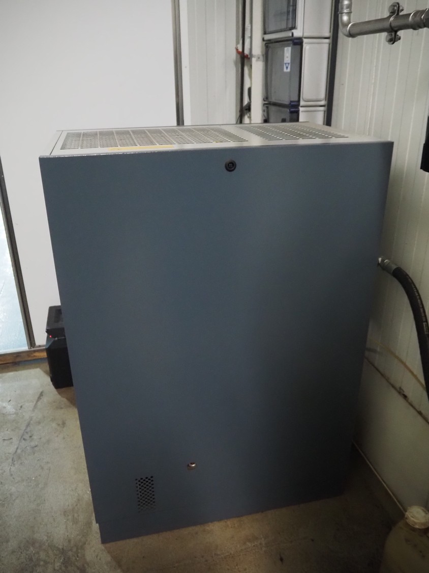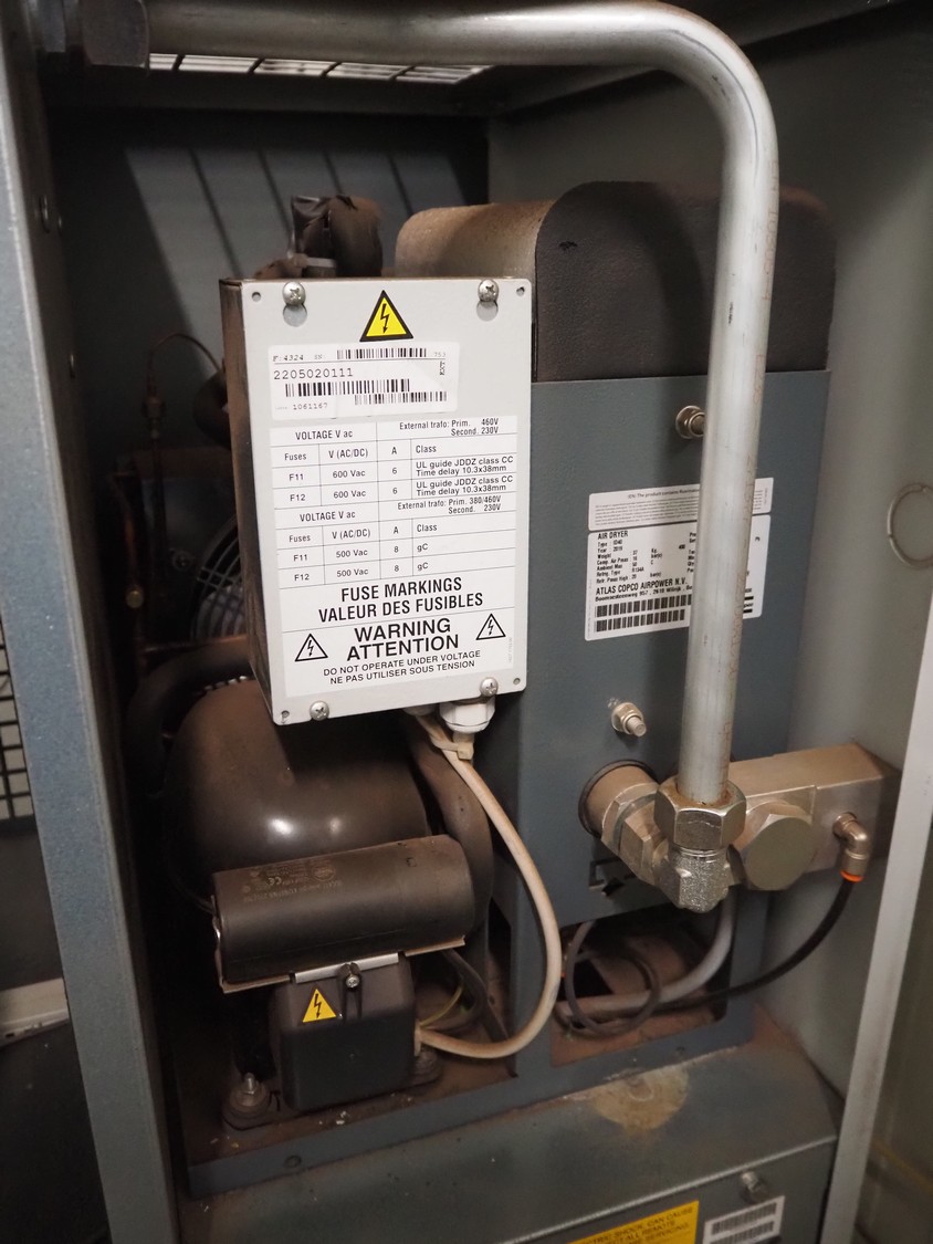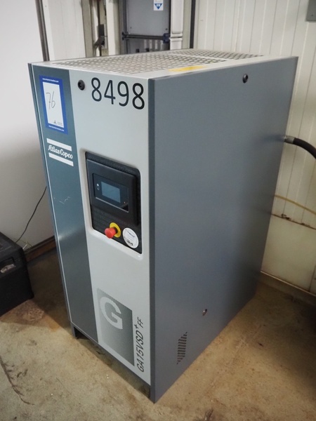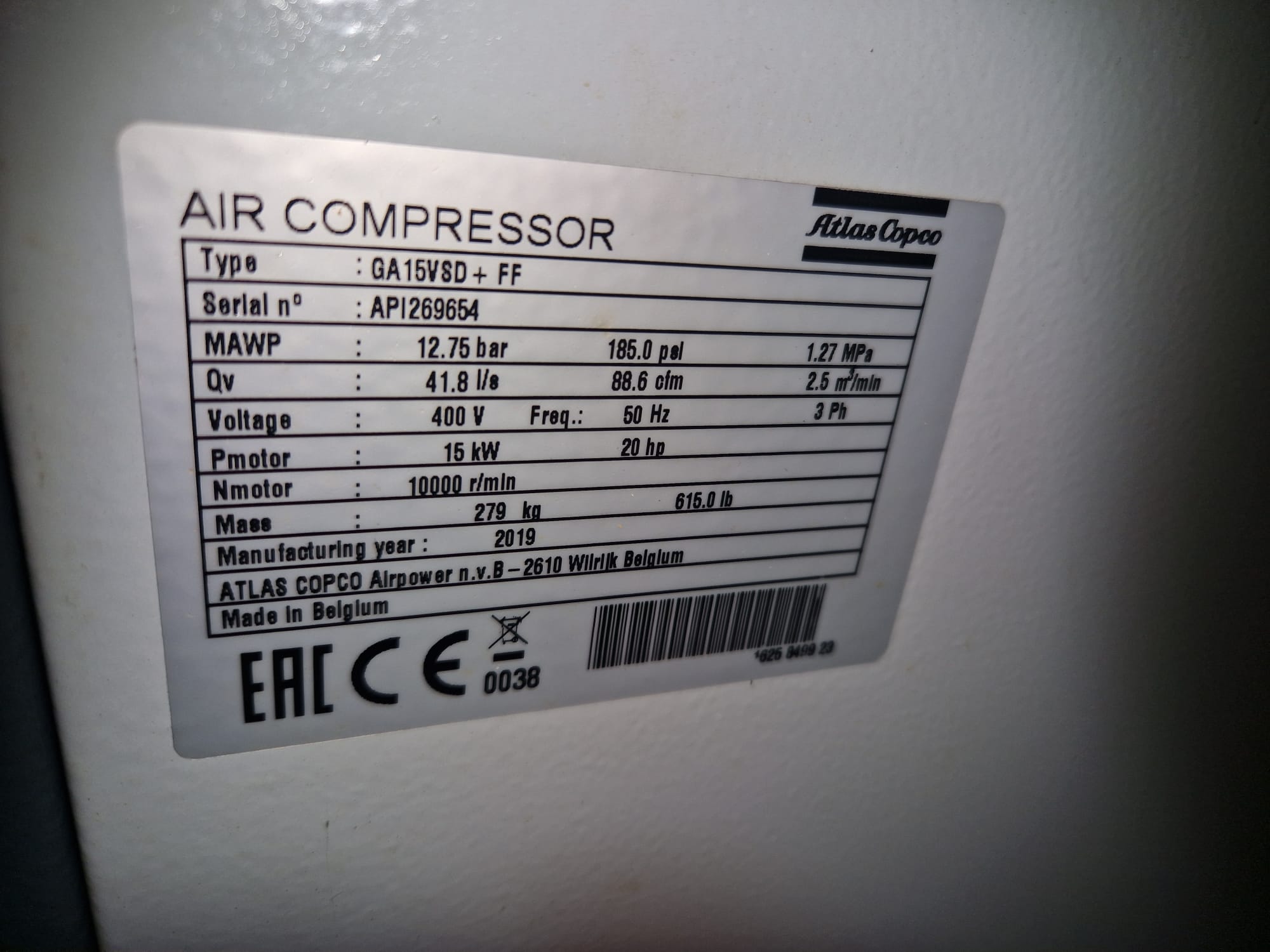 Atlas Copco air compressor with air dryer, type: GA15VSD+FF, serial number: API269654, year of construction 2019, 400 V, 3 Ph, 50 Hz, 15 kW, weight: 279 kg, MAWP: 12.75 bar, Qv: 41.8 litres per minute, dimensions: 640 mm x 1050 mm x 420 mm.