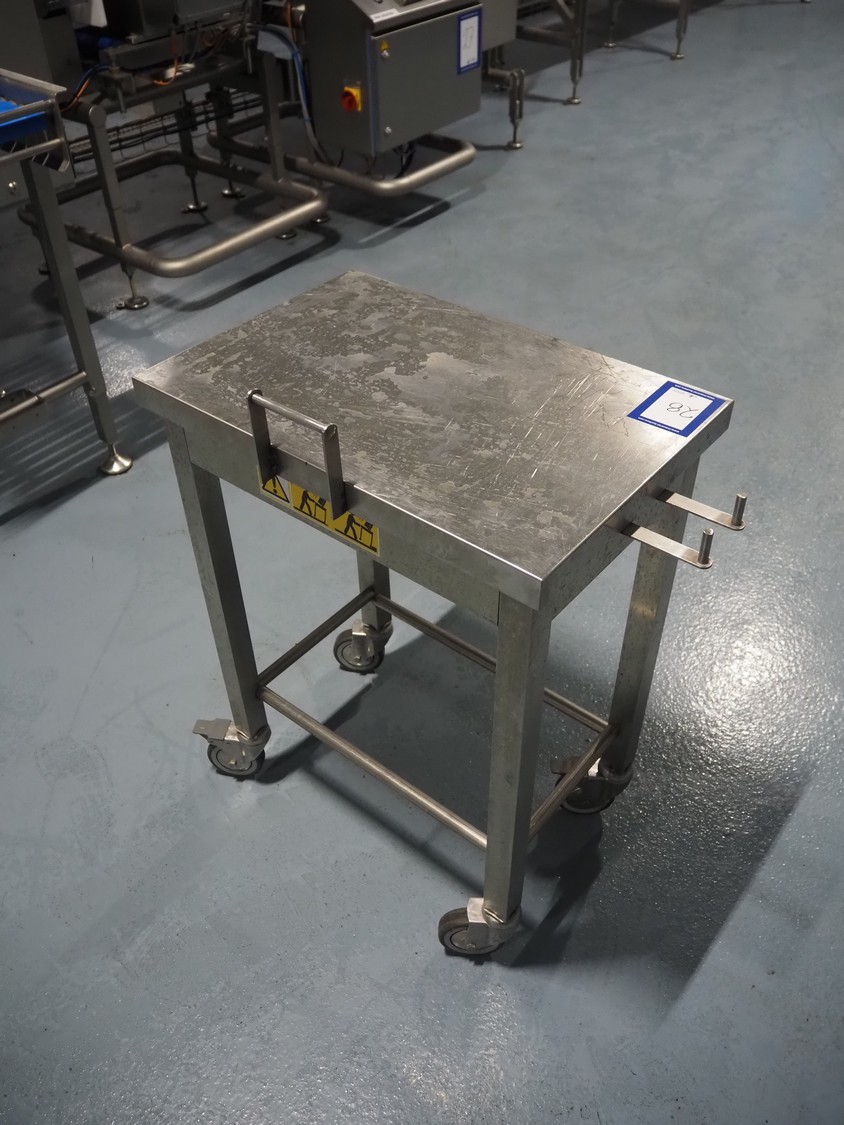 Mobile s/s table, dimensions: 700 mm x 420 mm x 880 mm.
