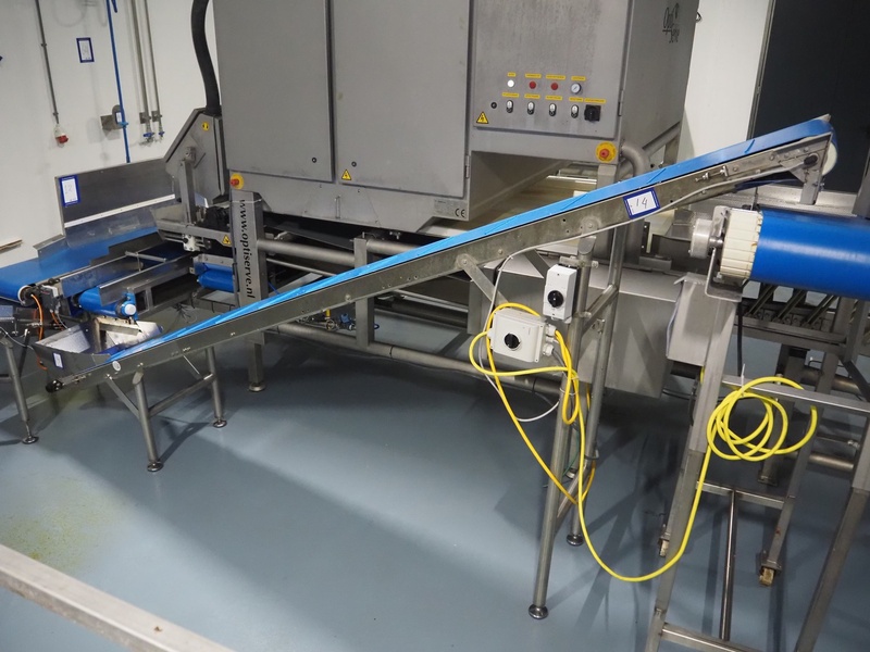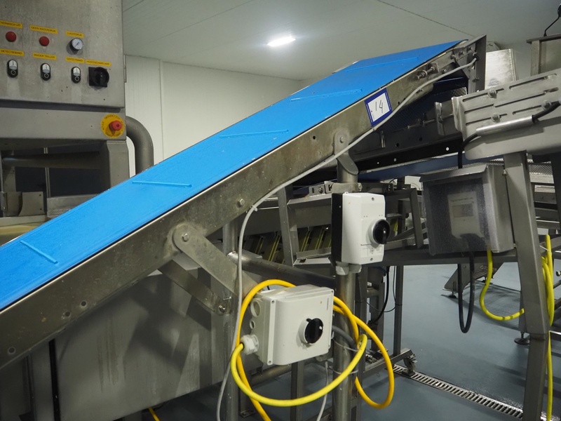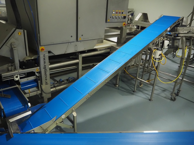 Elevating belt, s/s frame, plastic belt, belt width: 440 mm, divider height: 3 mm, distance between dividers: 290 mm, elevating height: 2900 mm, total dimensions: 3700 mm x 470 mm x 2900 mm.