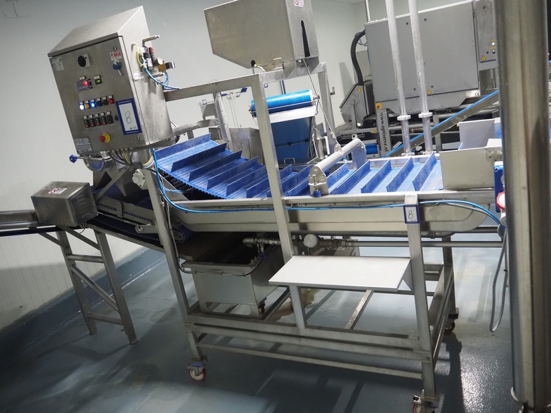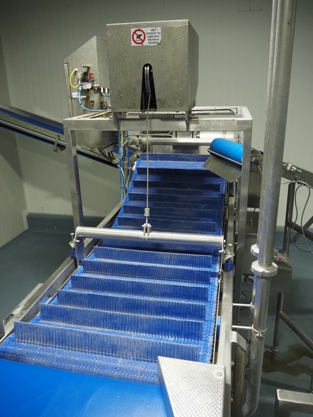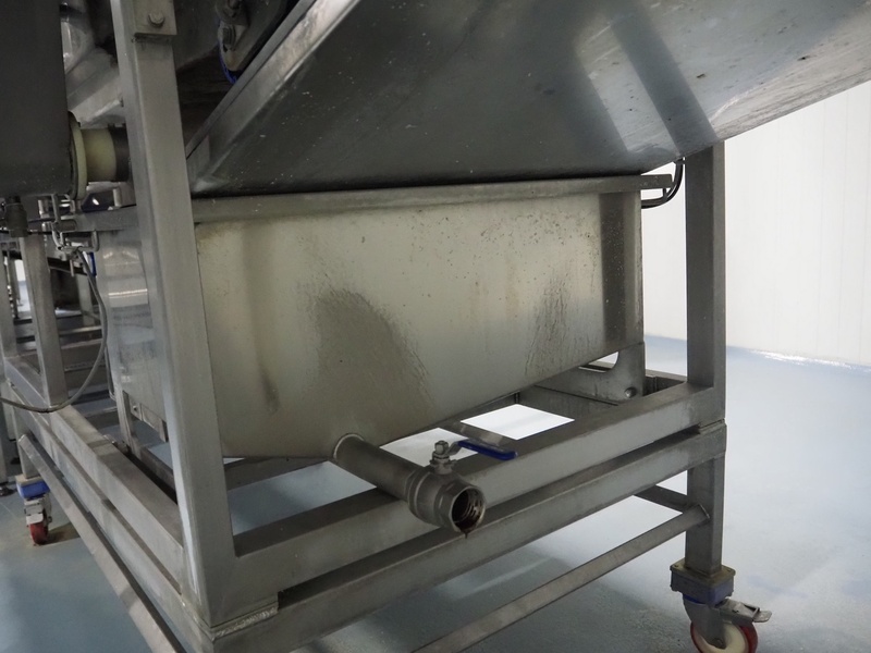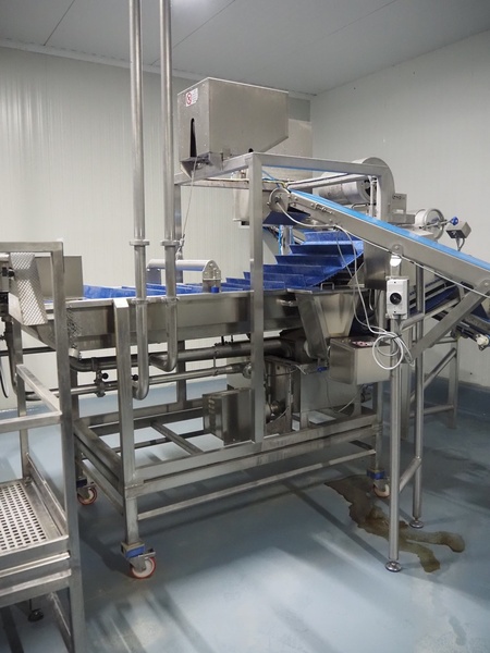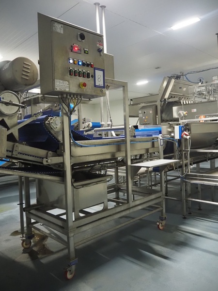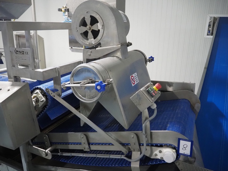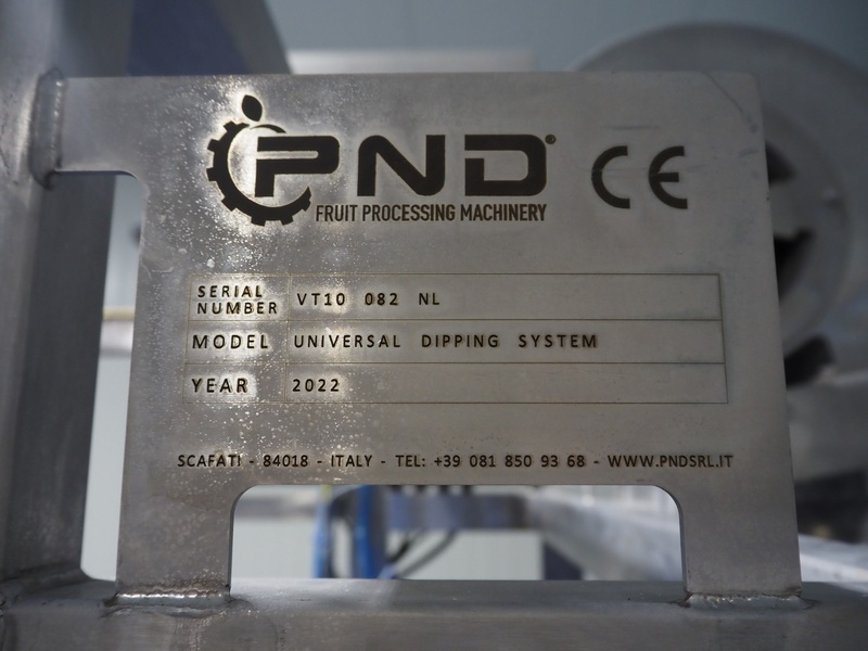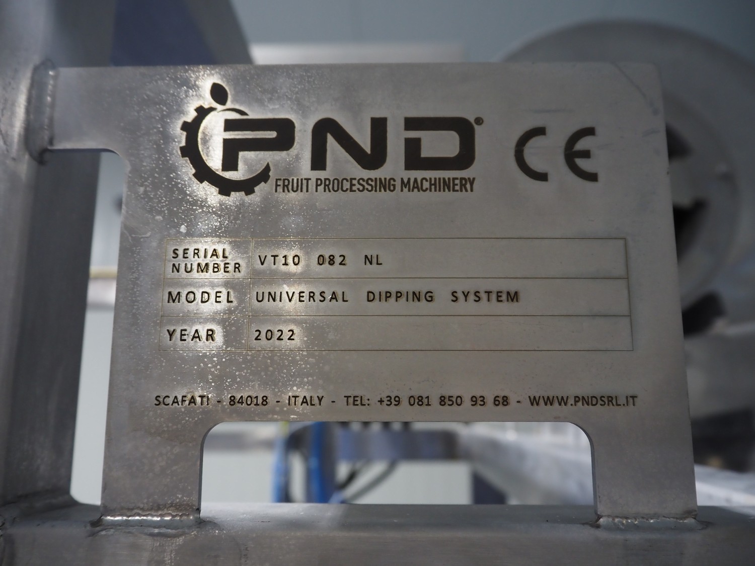 PND dipping machine, model: UNIVERSAL DIPPING MACHINE, serial number: VT10 082 NL, year of construction: 2022, plastic mesh belt with dividers, belt width: 760 mm, divider height: 75 mm, distance between dividers: 150 mm, plastic outfeed belt with blower, belt width: 760 mm, total dimensions: 3400 mm x 1700 mm x 2650 mm.