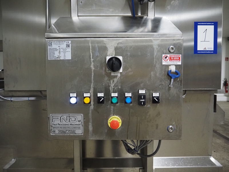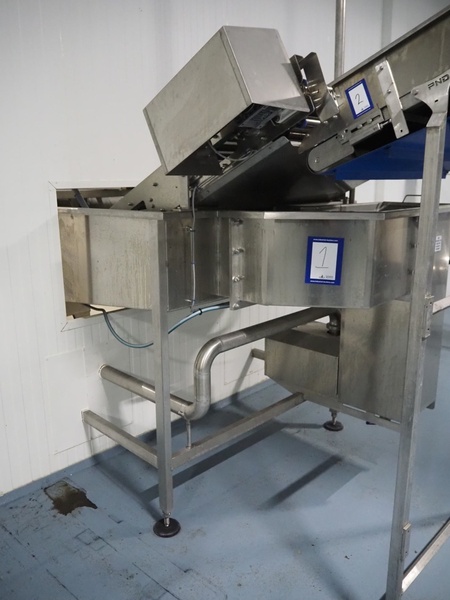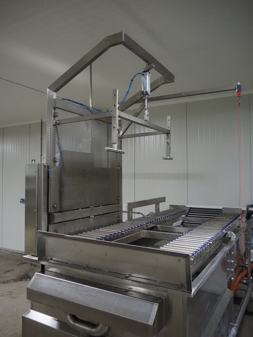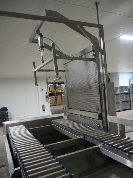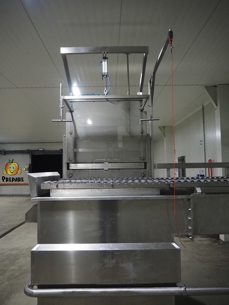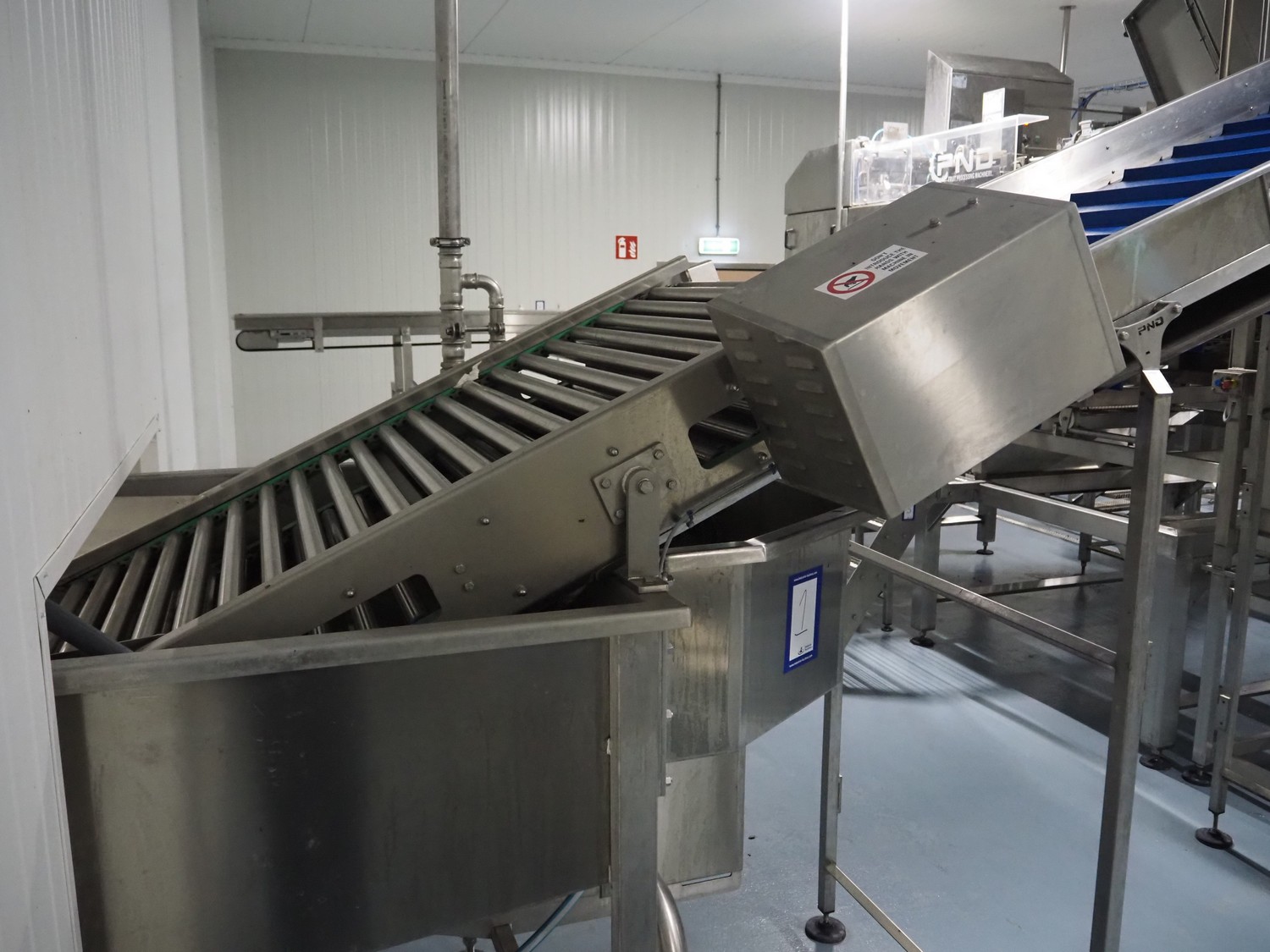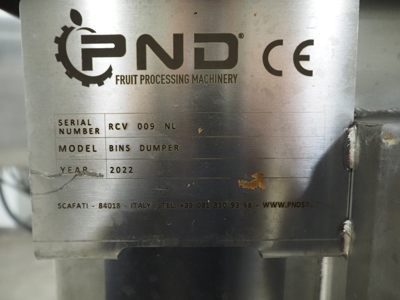 PND infeed bunker for apples with bin dumper, model, BINS DUMPER, serial number: RCV 009 NL, year of construction: 2022, s/s roller bin dumper, roller width: 290 mm, s/s outfeed roller belt, roller width: 1020 mm, total dimensions: 1950 mm x 3300 mm x 5400 mm.