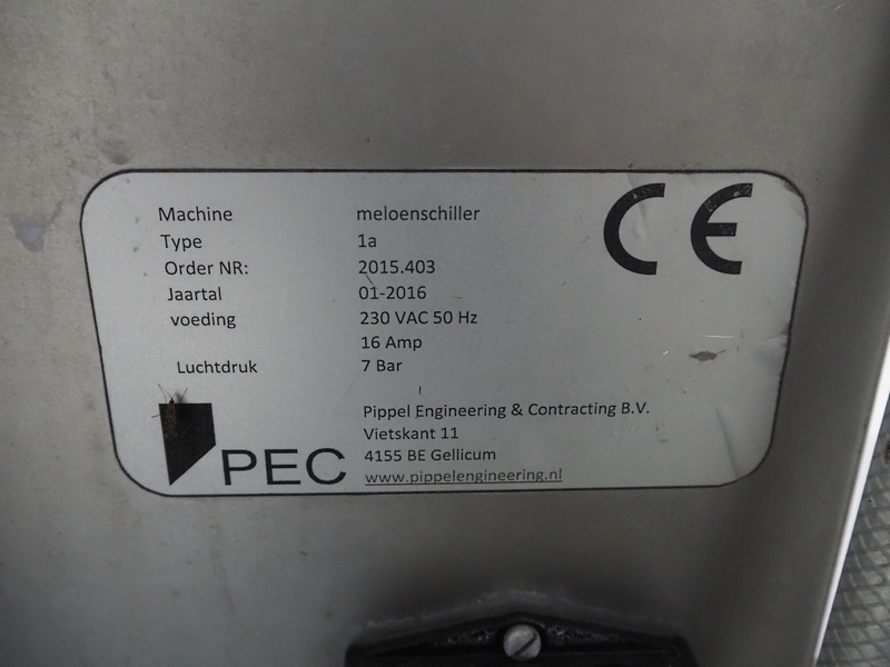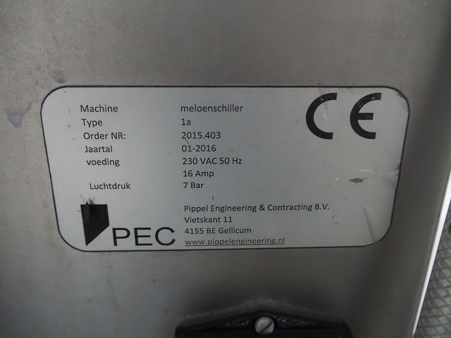 PEC mobile melon peeler, type: 1a, order number: 2015.403, year of construction: 01-2016, 230 V, 50 Hz, 16 A, dimensions: 1100 mm x 1000 mm x 2300 mm.