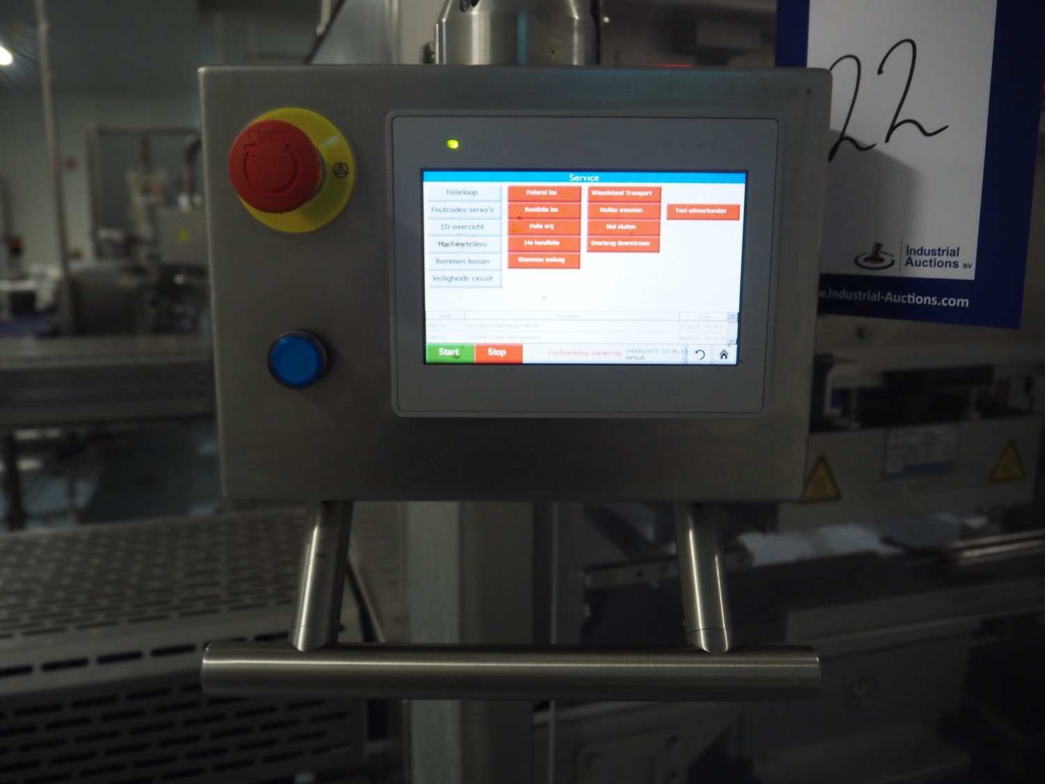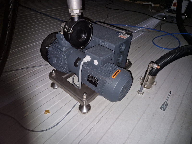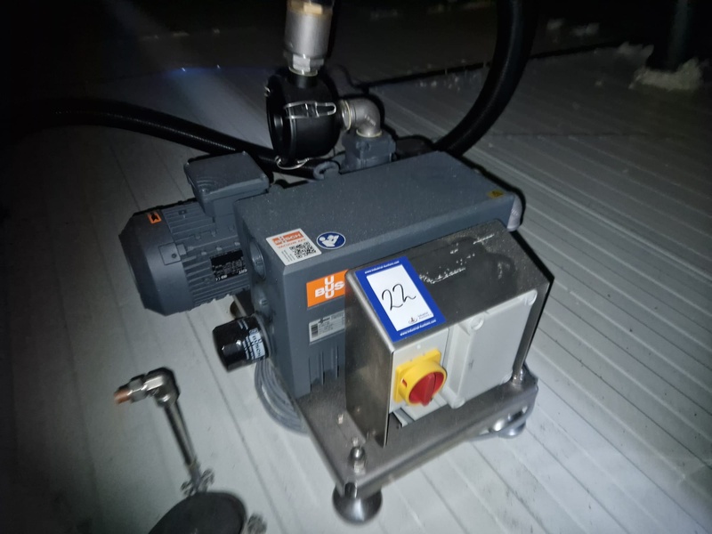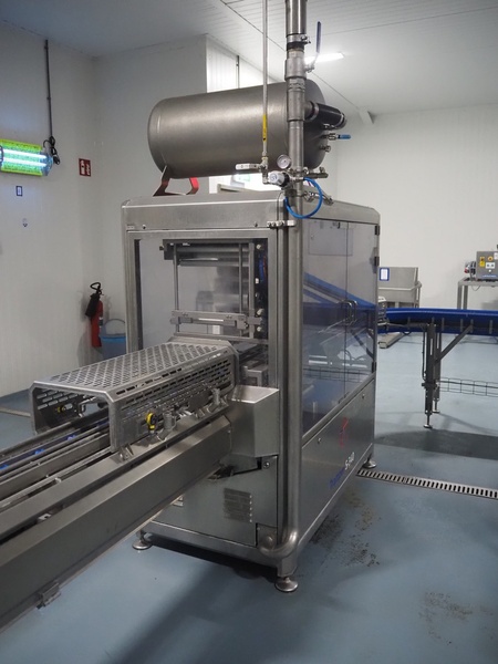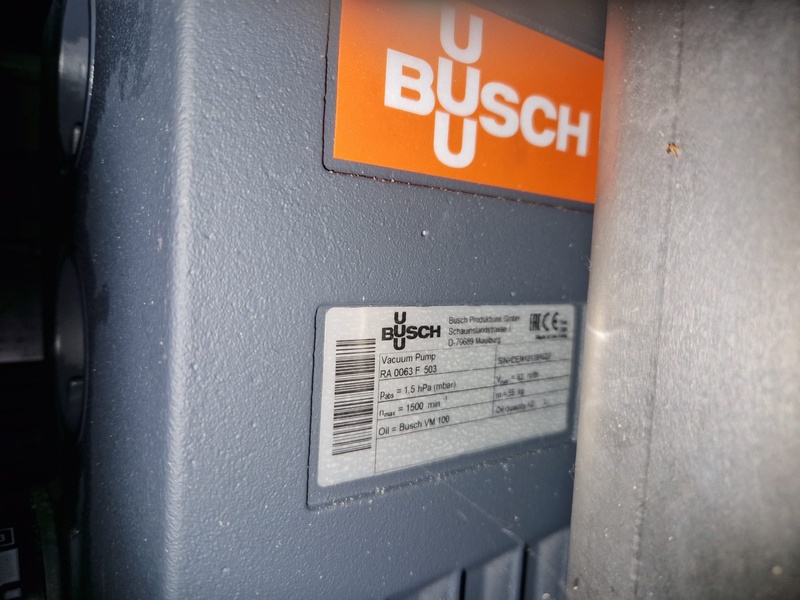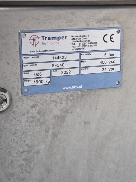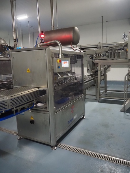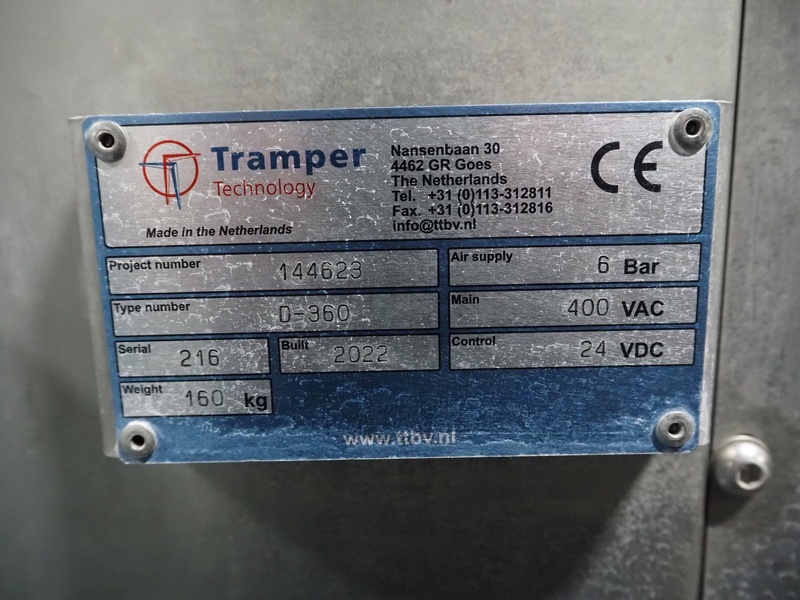 Tramper Technology traysealer with denester, type denester: D-360, serial number: 216, year of construction: 2022, weight: 160 kg, type traysealer: S-340, serial number: 026, year of construction: 2022, 400 V, 6 bar, weight: 1900 kg, plastic walking beam infeed, clearance: 125 mm, dye: (2x) Ø 124 mm, plastic outfeed belt, belt width: 355 mm, total dimensions: 6400 mm x 1200 mm x 2300 mm. Including Busch vacuum pump, type: RA 0063 F 503, capacity: 63 m³ per hour, dimensions: 600 mm x 550 mm x 400 mm.