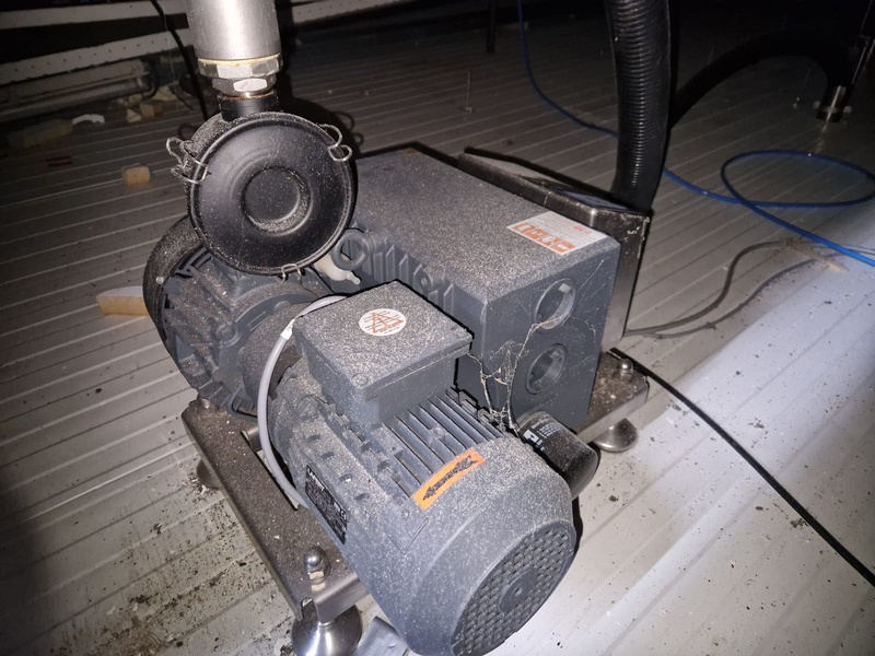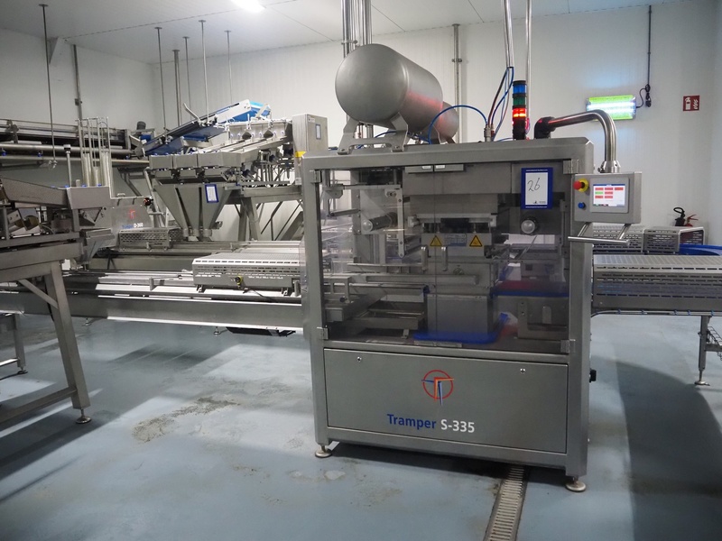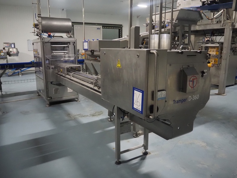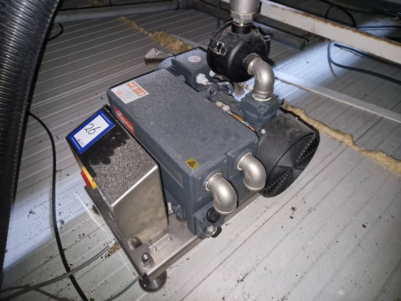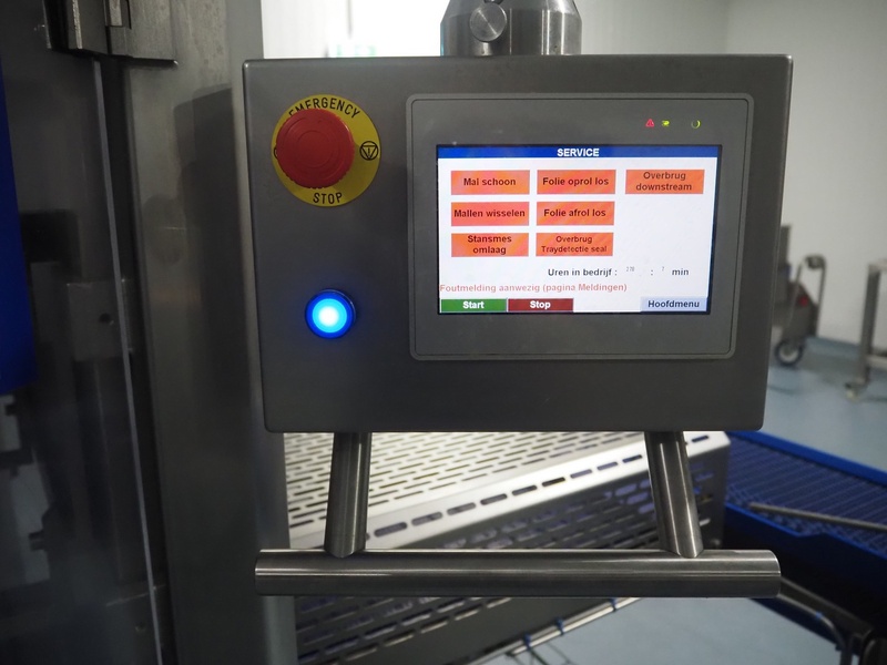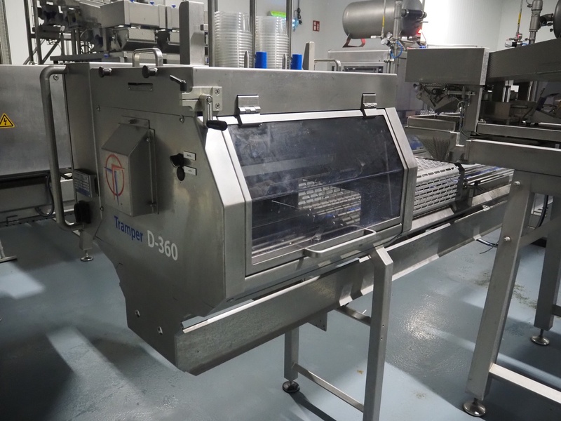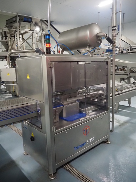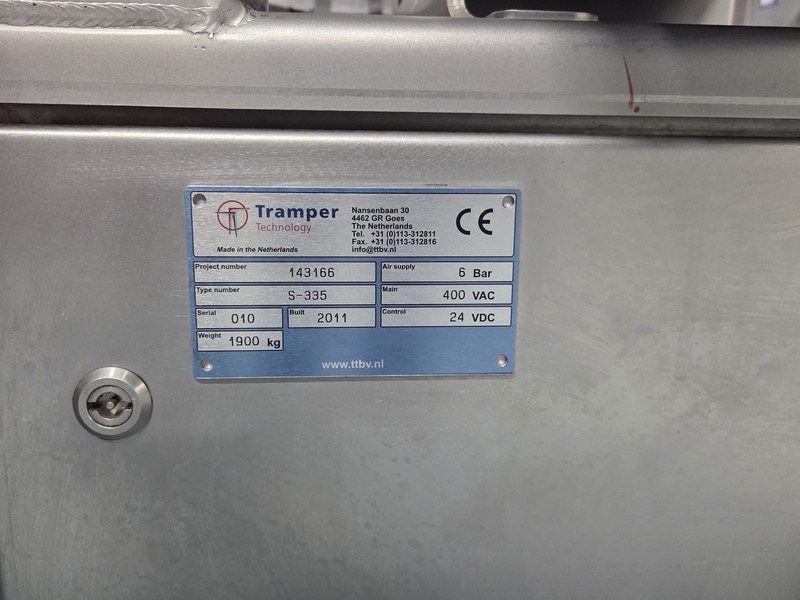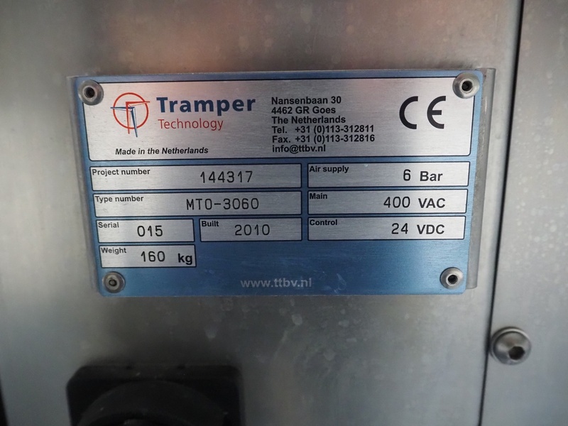Tramper Technology traysealer with denester, type denester: MTO-3060, serial number: 015, year of construction: 2010, revised: 2021, weight: 160 kg, type traysealer: S-335, serial number: 010, year of construction: 2011, revised: 2021, 400 V, 6 bar, weight: 1900 kg, plastic walking beam infeed, clearance: 125 mm, dye: (2x) Ø 124 mm, plastic outfeed belt, belt width: 355 mm, total dimensions: 6400 mm x 1200 mm x 2300 mm. Including Busch vacuum pump, type: RA 0063 F 503, capacity: 63 m³ per hour, dimensions: 600 mm x 550 mm x 400 mm.