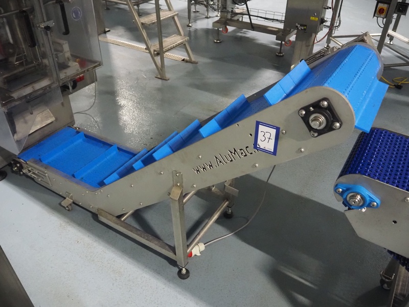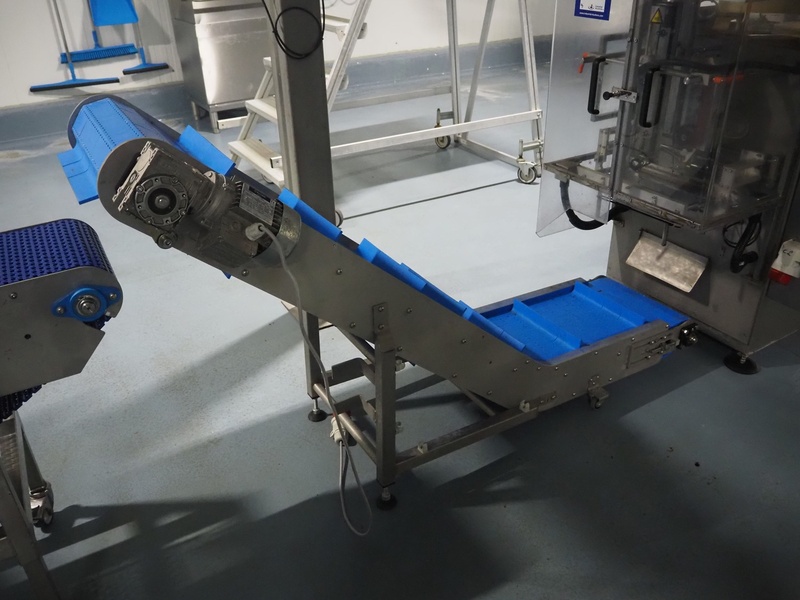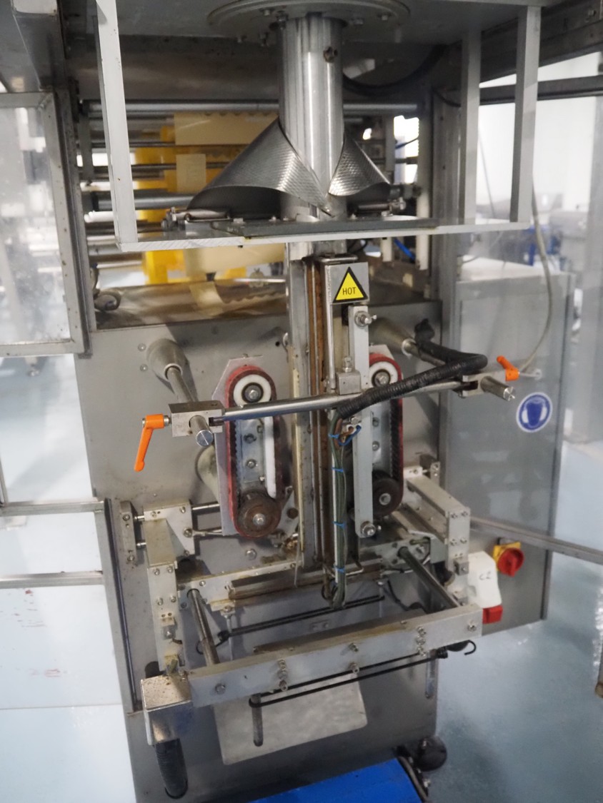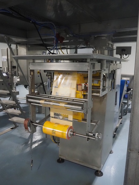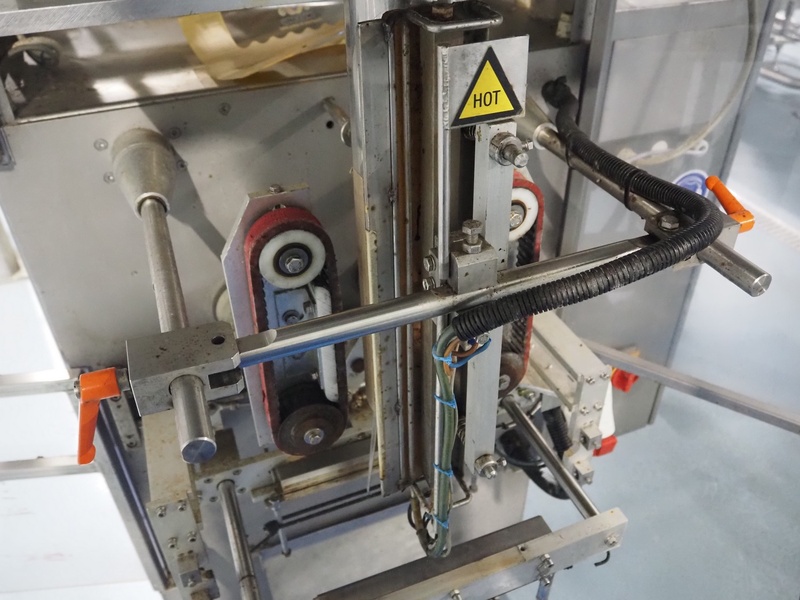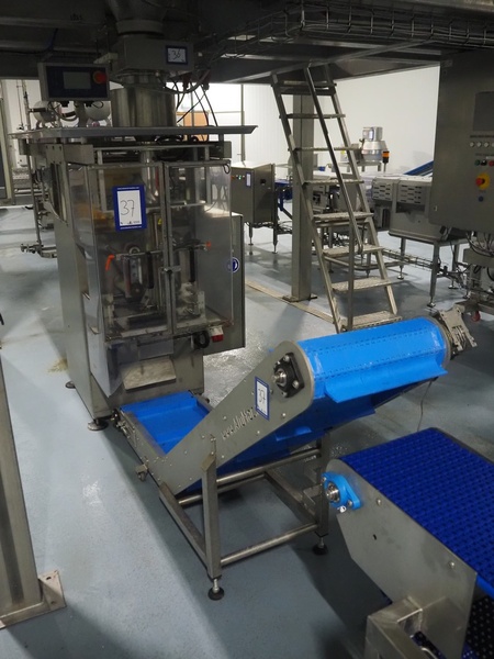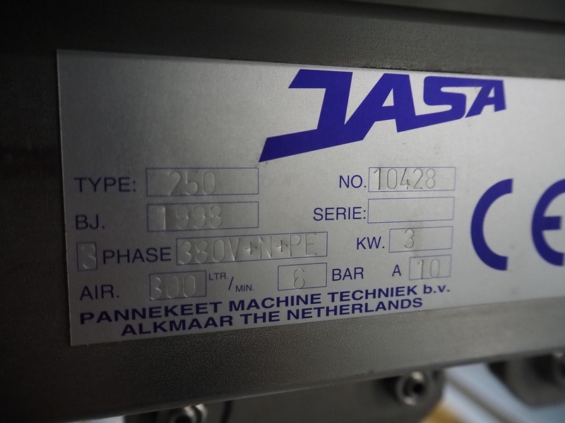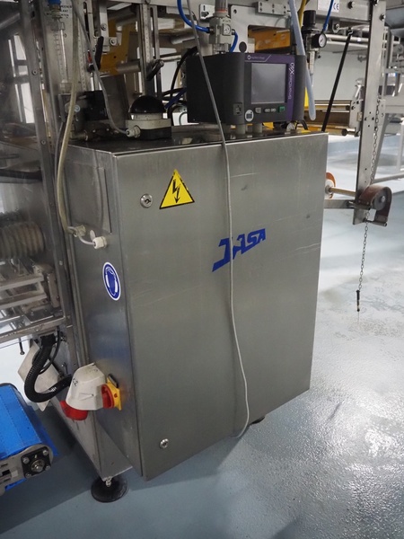 Jasa vertical bag form-, fill- and seal machine, type: 250, number: 10428, year of construction: 1998, 380 V, 3 Ph, 10 A, 3 kW, 6 bar, film width: 310 mm, filling pipe: Ø 70 mm, vertical seal length: 450 mm, horizonal seal length: 270 mm, total dimensions: 960 mm x 1960 mm x 1870 mm. Including AluMac elevating belt, s/s frame, plastic belt and dividers, belt width: 400 mm, divider height: 50 mm, distance between dividers: 150 mm and 300 mm, elevating height: 1120 mm, total dimensions: 1850 mm x 650 mm x 1150 mm.