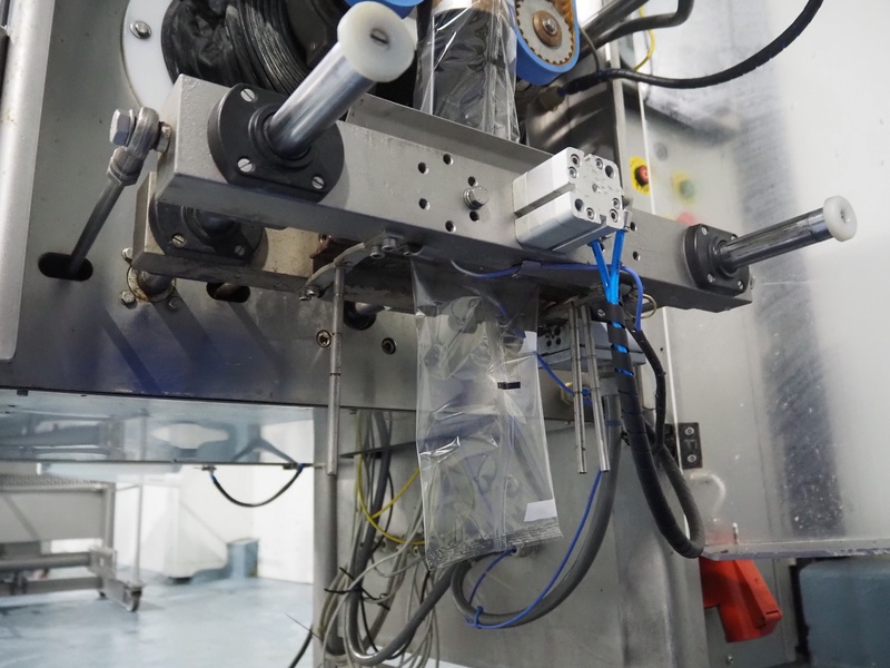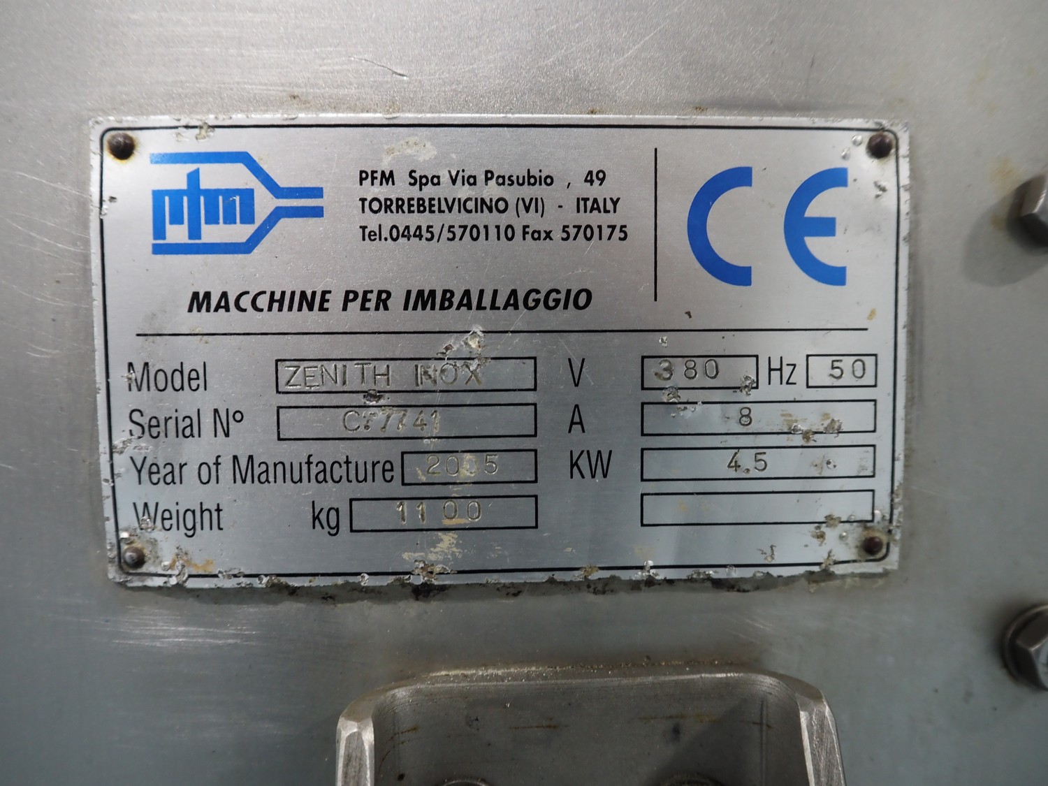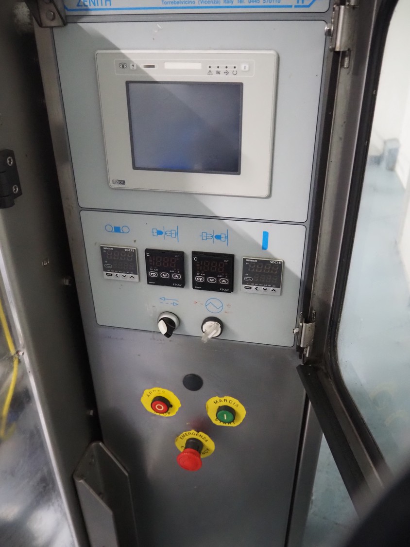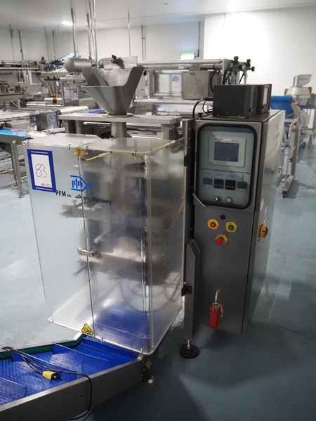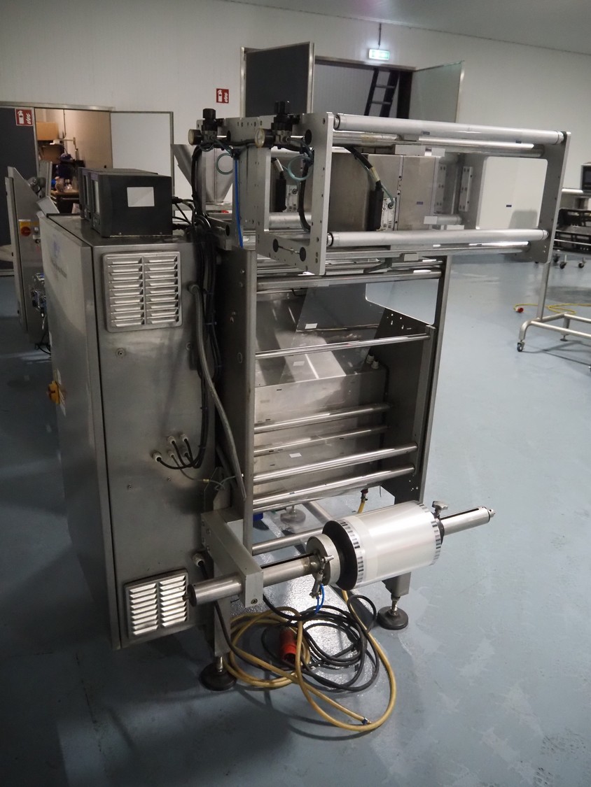 PFM vertical bag form-, fill-, and seal machine, model: Zenith Inox, serial number: C 7741, year of construction: 2005, 380 V, 50 Hz, 8 A, 4.5 kW, 2 Markem Imaje smart date printers, film width: 280 mm, seal width: 250 mm, total dimensions: 1900 mm x 1100 mm x 1770 mm.