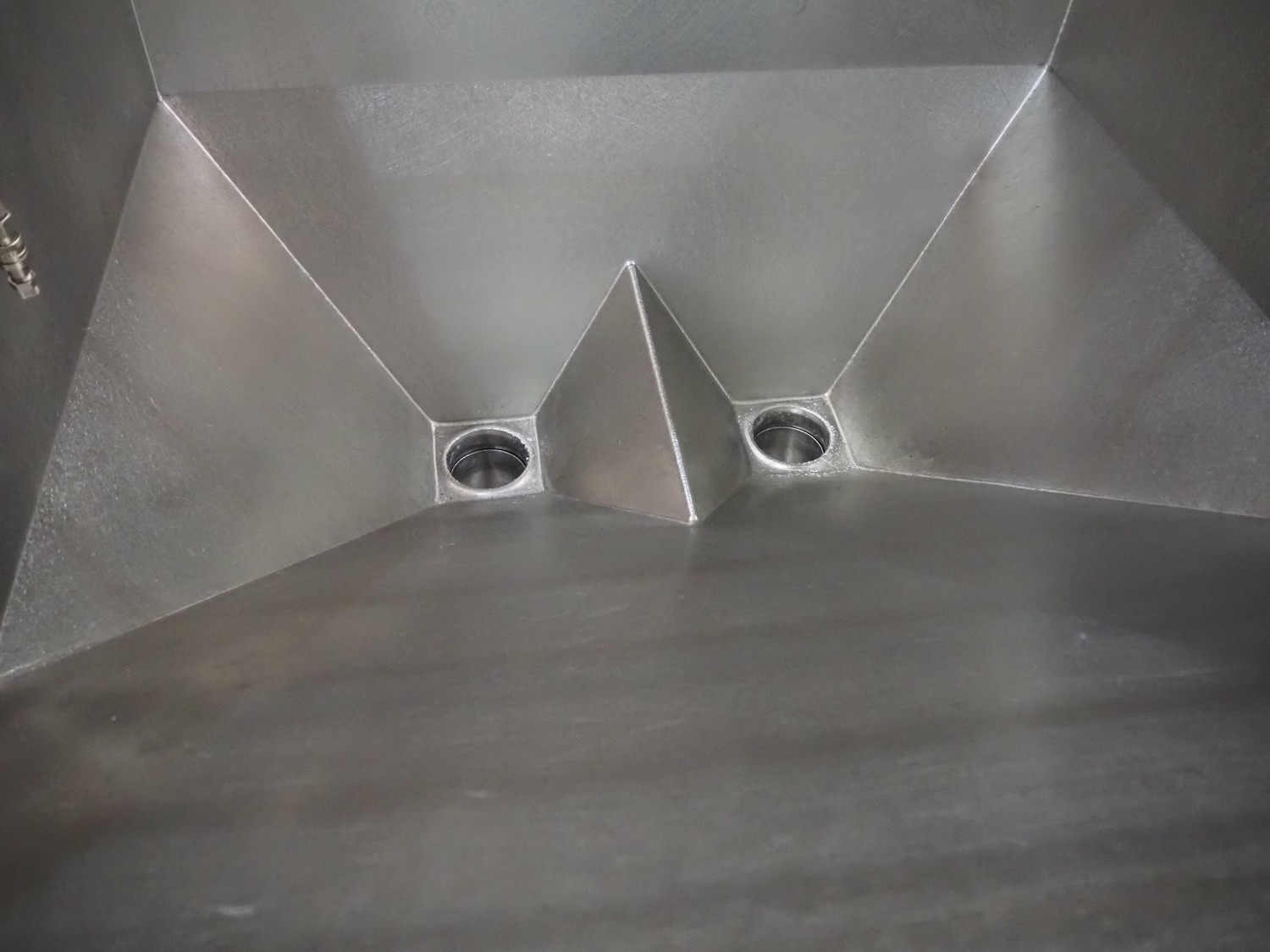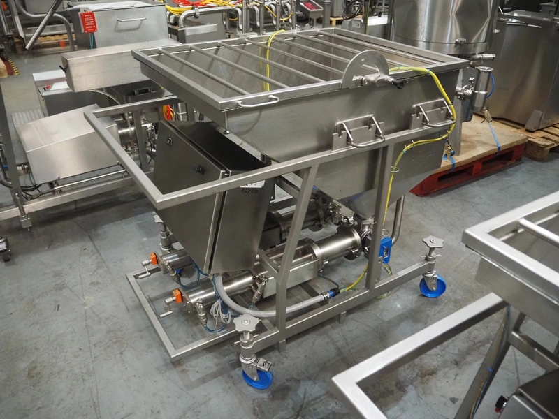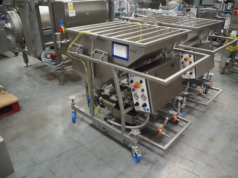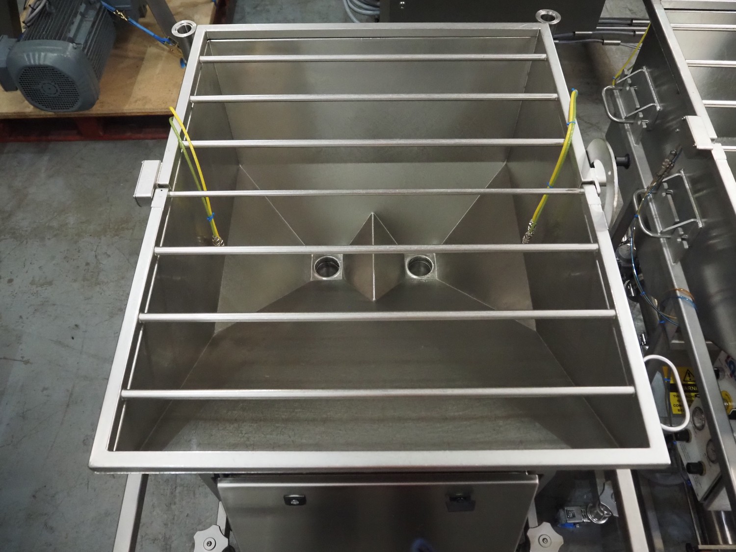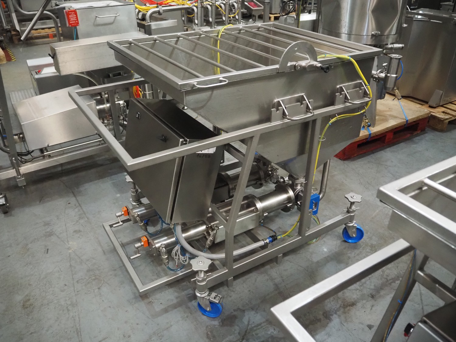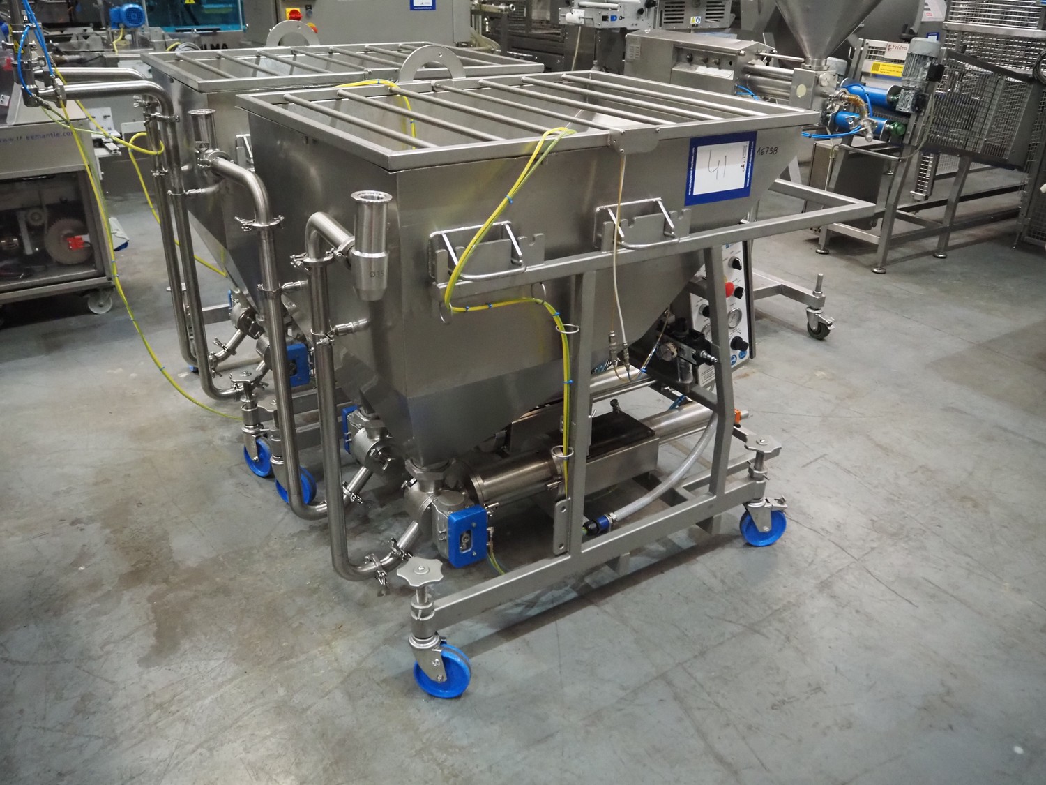Riggs Autopack mobile infeed bunker with 2 pumps, model: 1000, serial number: TT1075R, year of construction: 2009, inside dimensions tub: 1000 mm x 780 mm x 700 mm, diameter outfeed: (2x) 35 mm, total dimensions: 1400 mm x 1000 mm x 1200 mm.