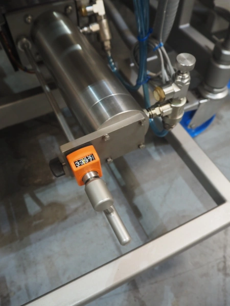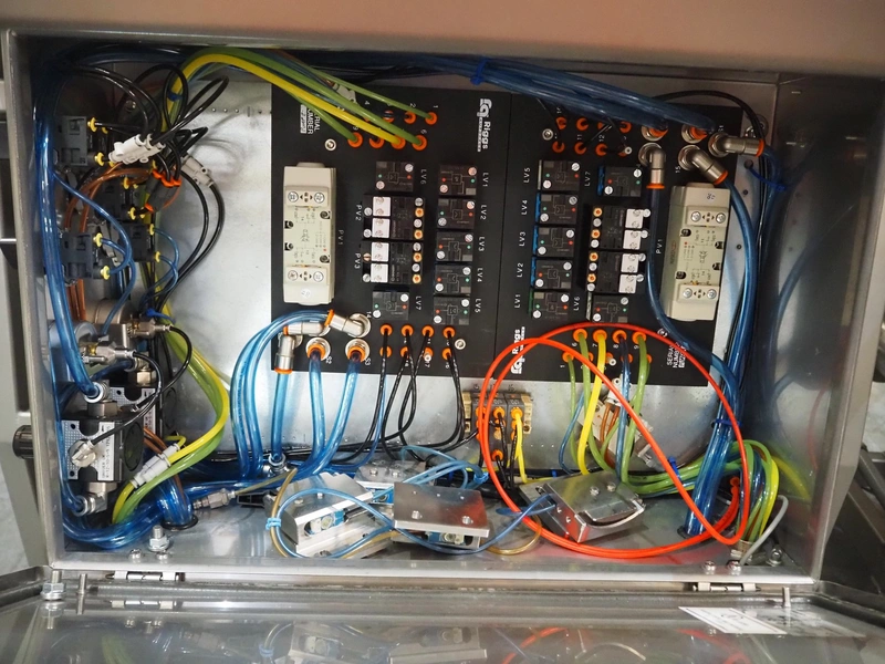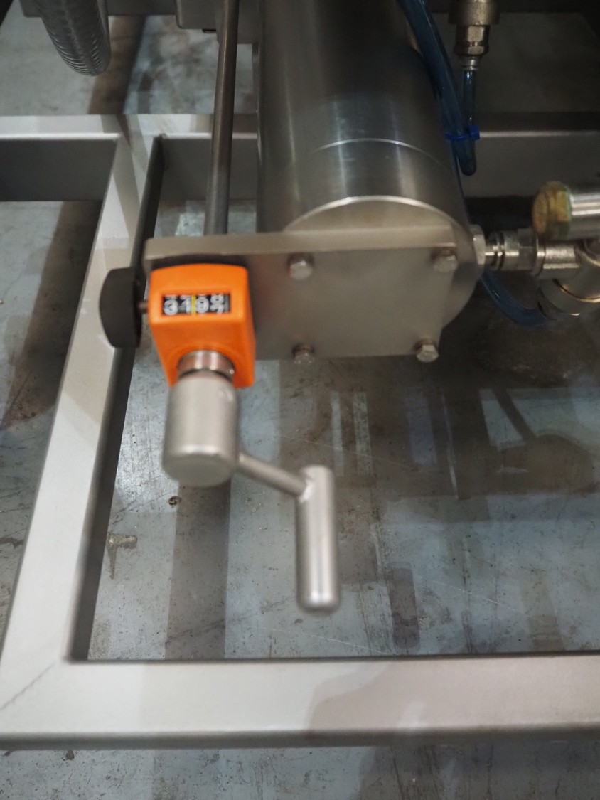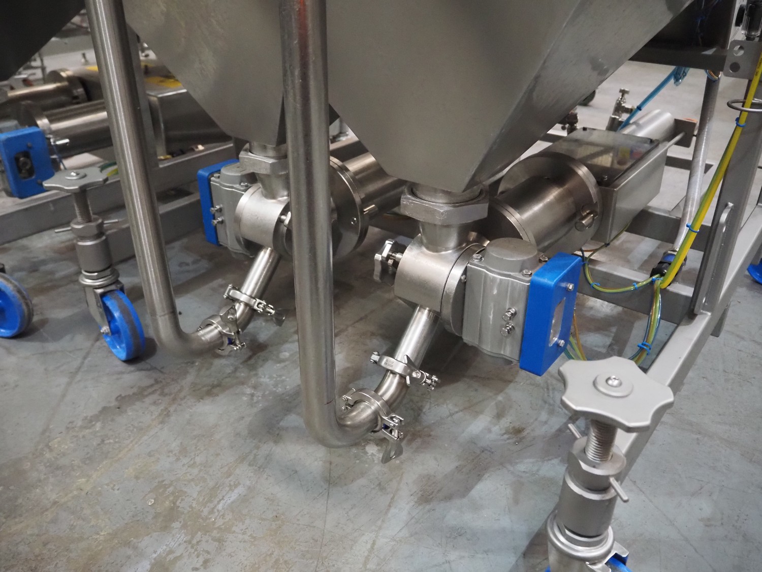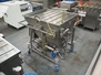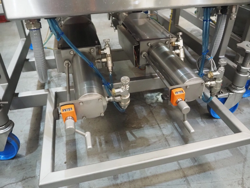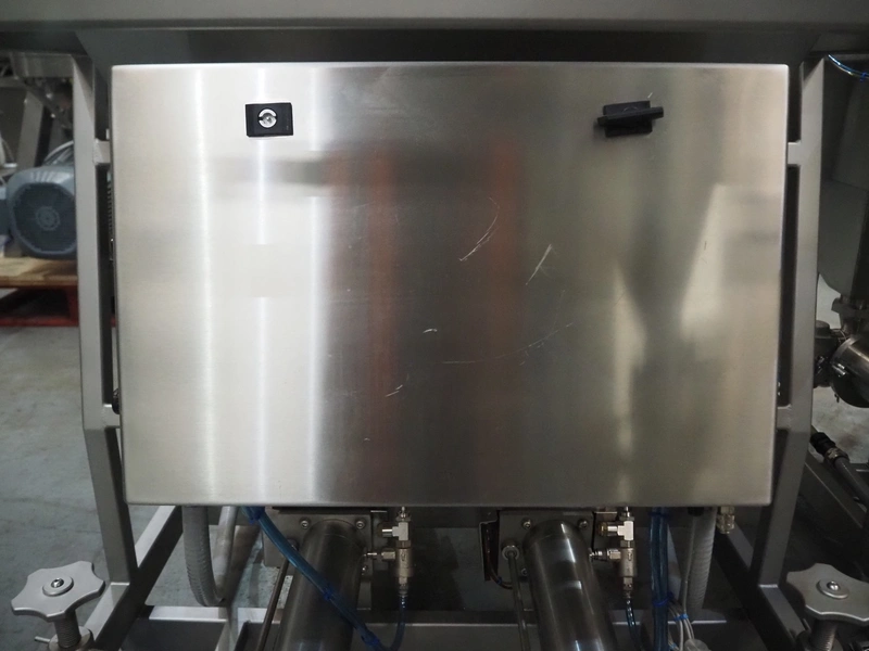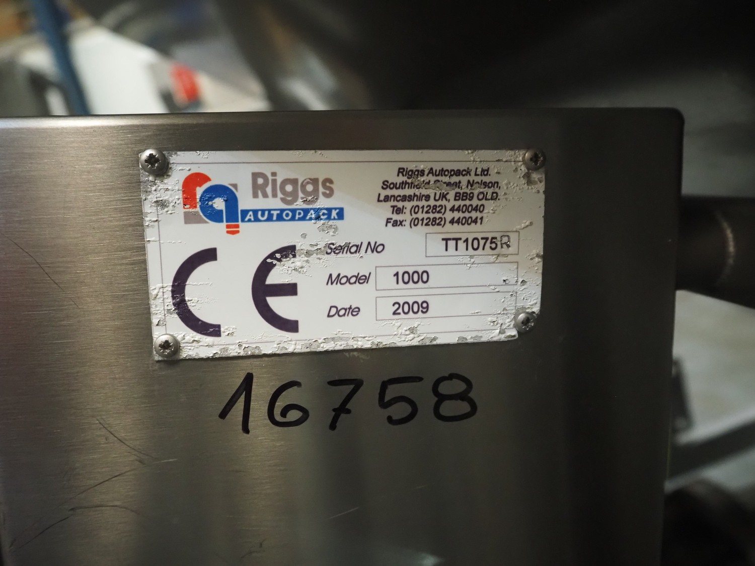 Riggs Autopack mobile infeed bunker with 2 pumps, model: 1000, serial number: TT1075R, year of construction: 2009, inside dimensions tub: 1000 mm x 780 mm x 700 mm, diameter outfeed: (2x) 35 mm, total dimensions: 1400 mm x 1000 mm x 1200 mm.