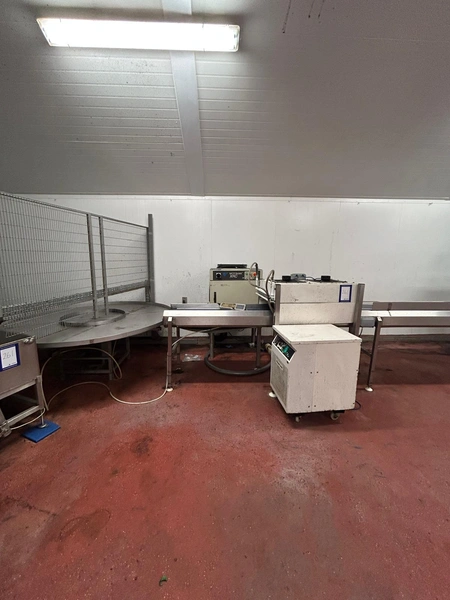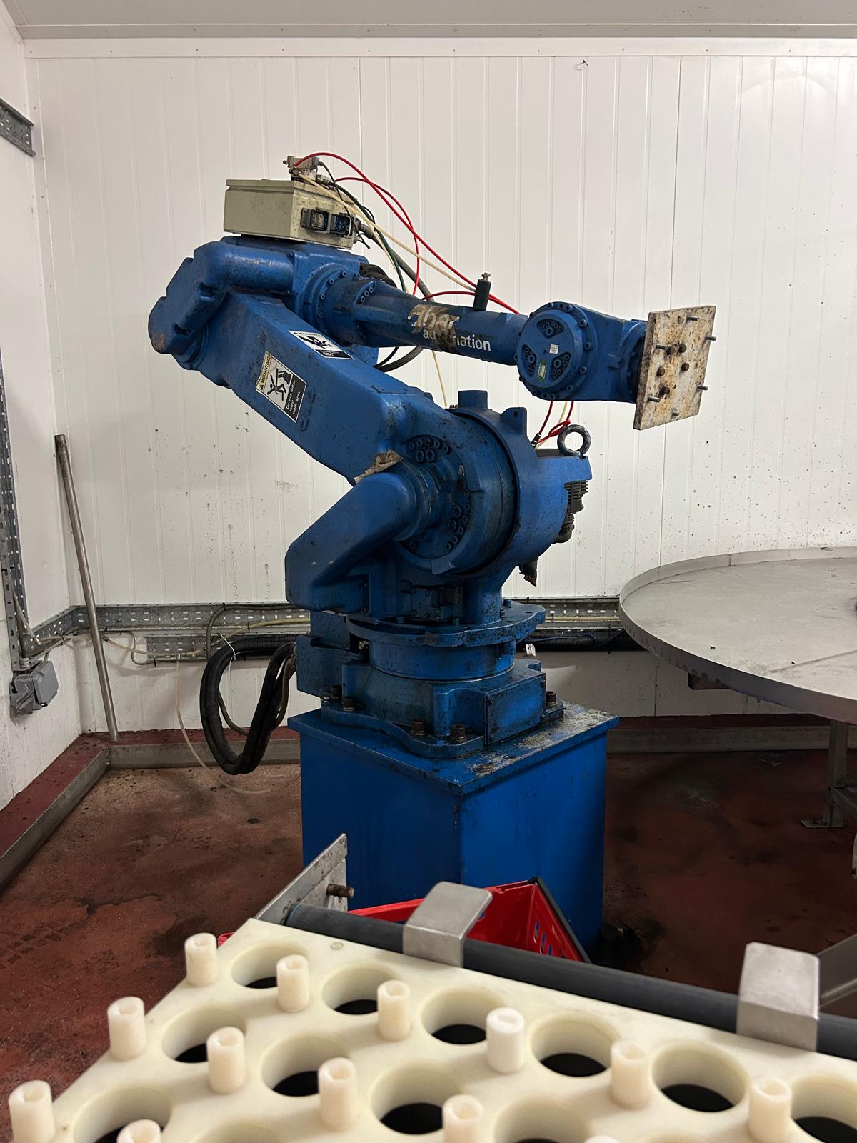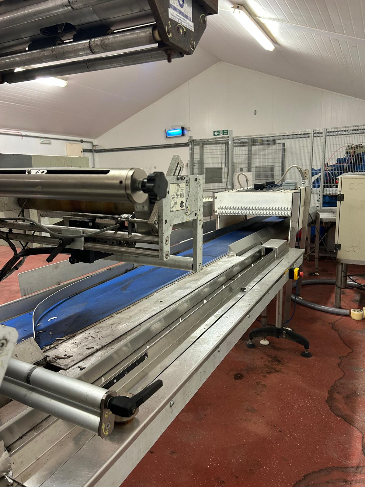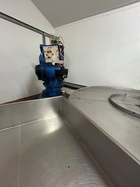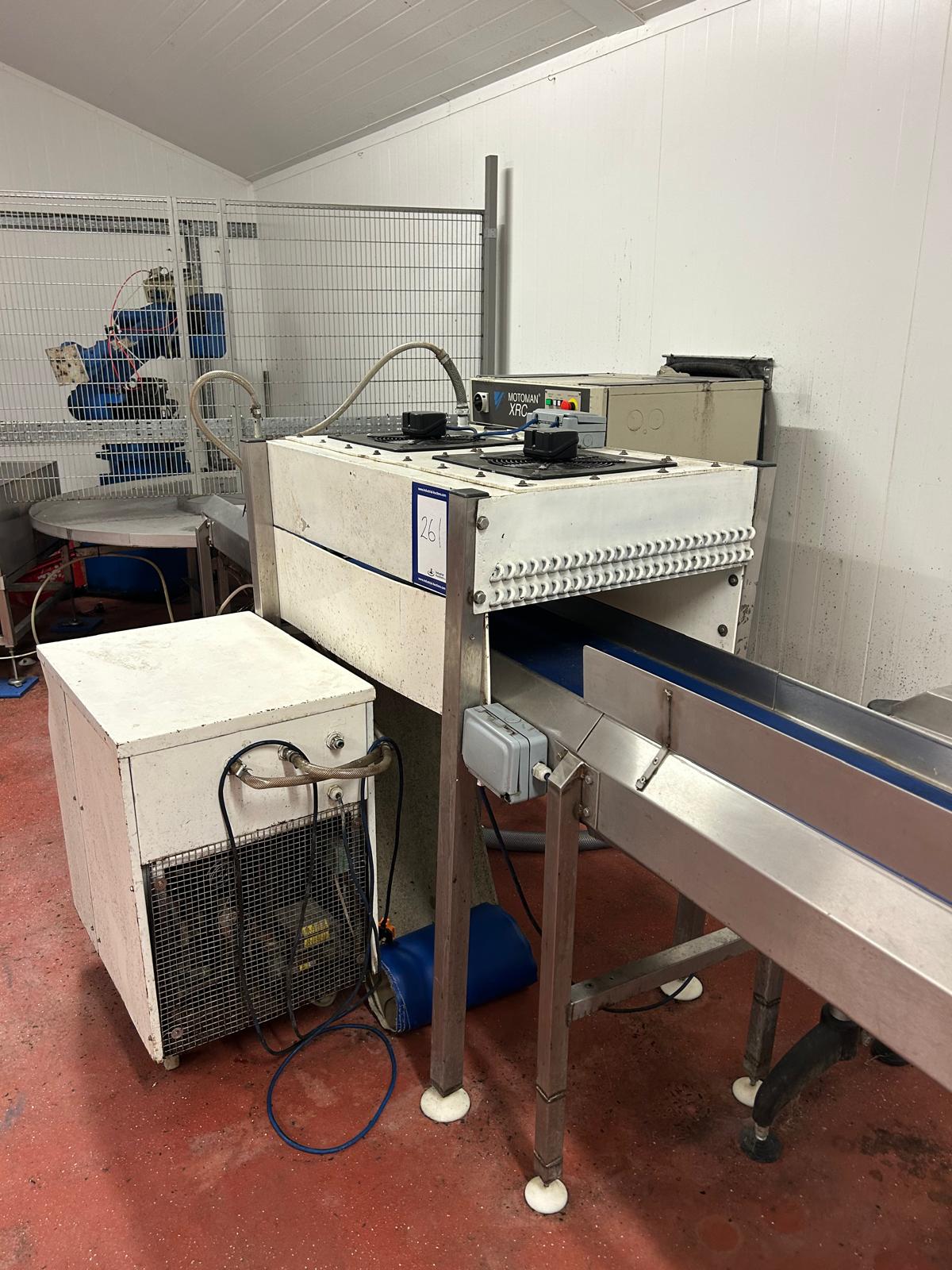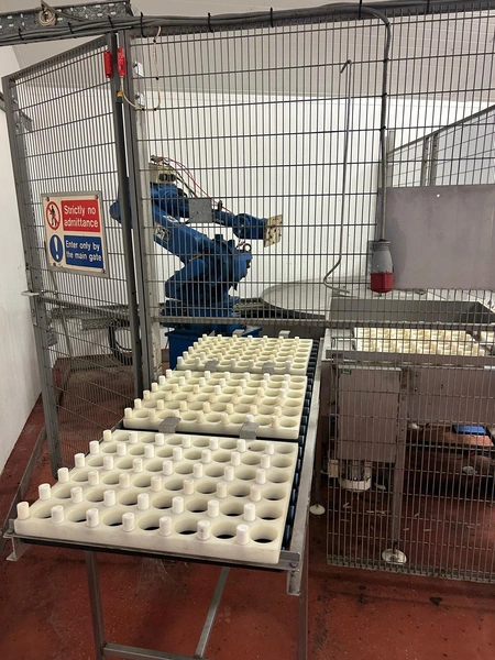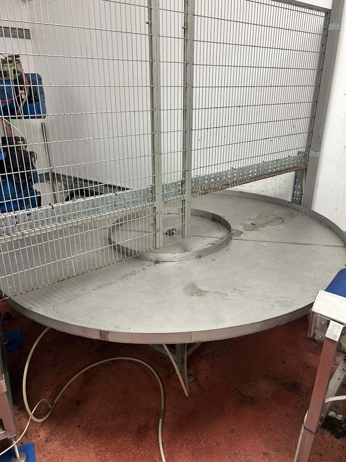 Chocolate apple line. Apples and sticks are placed into trays. Motoman robot inserts the sticks into the apples, dunks them into the heated chocolate tank and then places them on a rotary table. The rotary table can have a variety of sprinkles or marshmallows etc that will stick to the chocolate. The apples are then taken off the rotary table, placed onto a conveyor belt that passes through a cooling tunnel, and then to the LMC flowpacker, total dimenions: 9600 mm x 4200 mm.