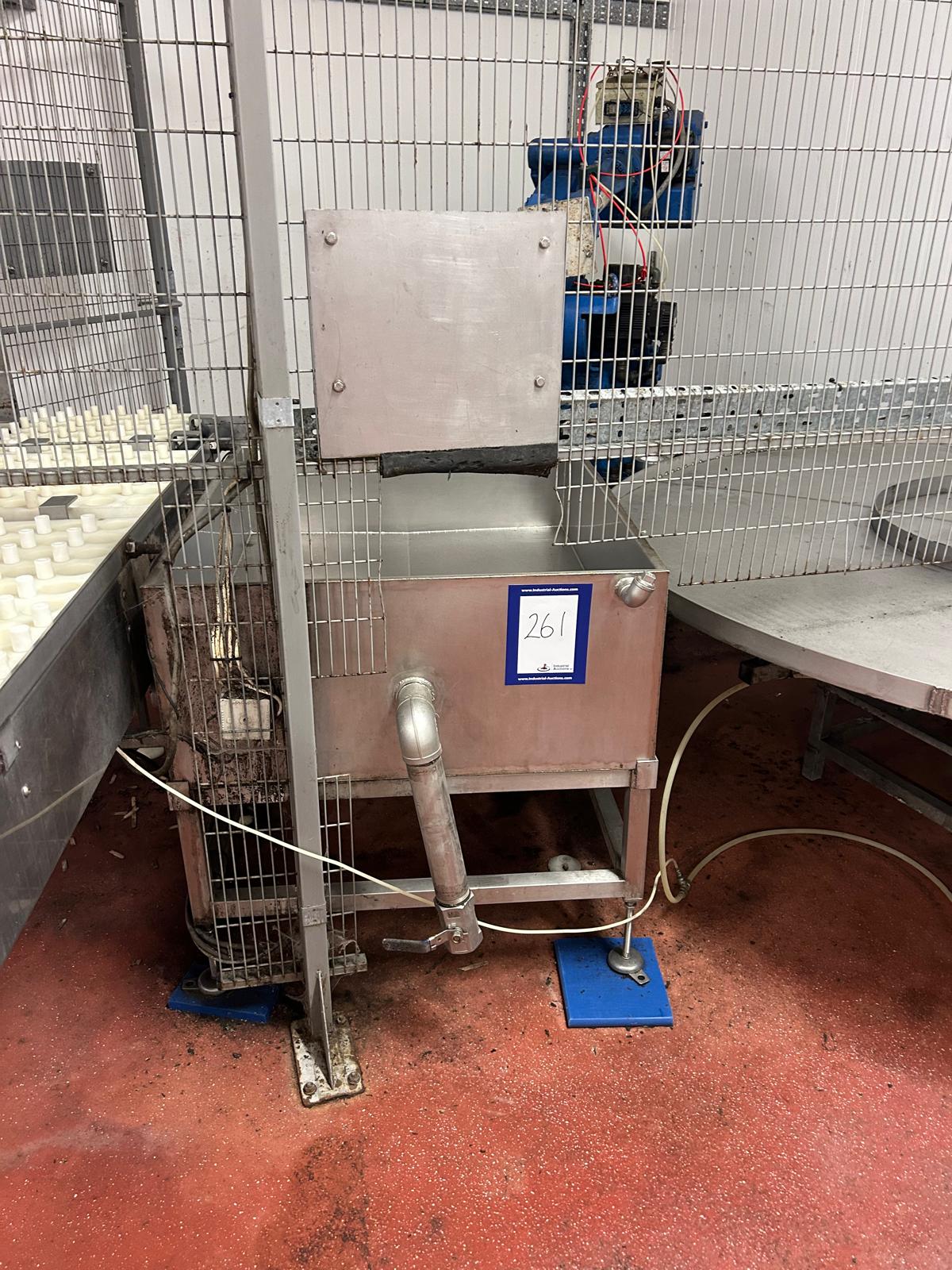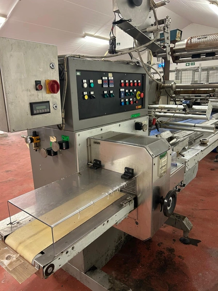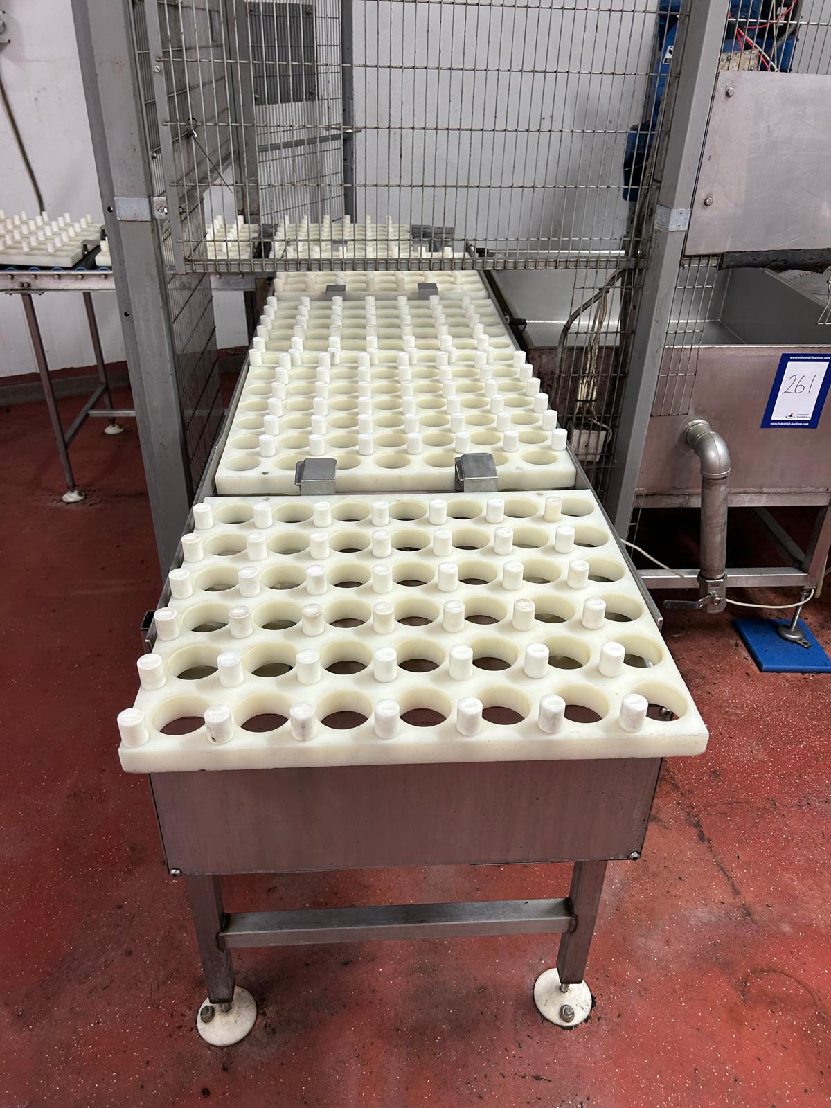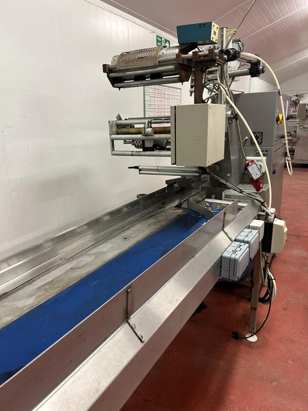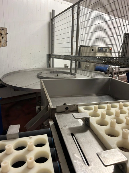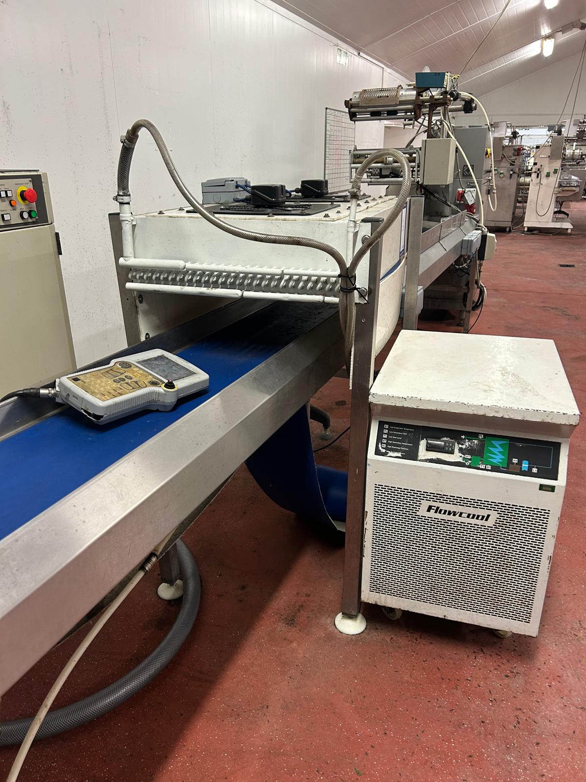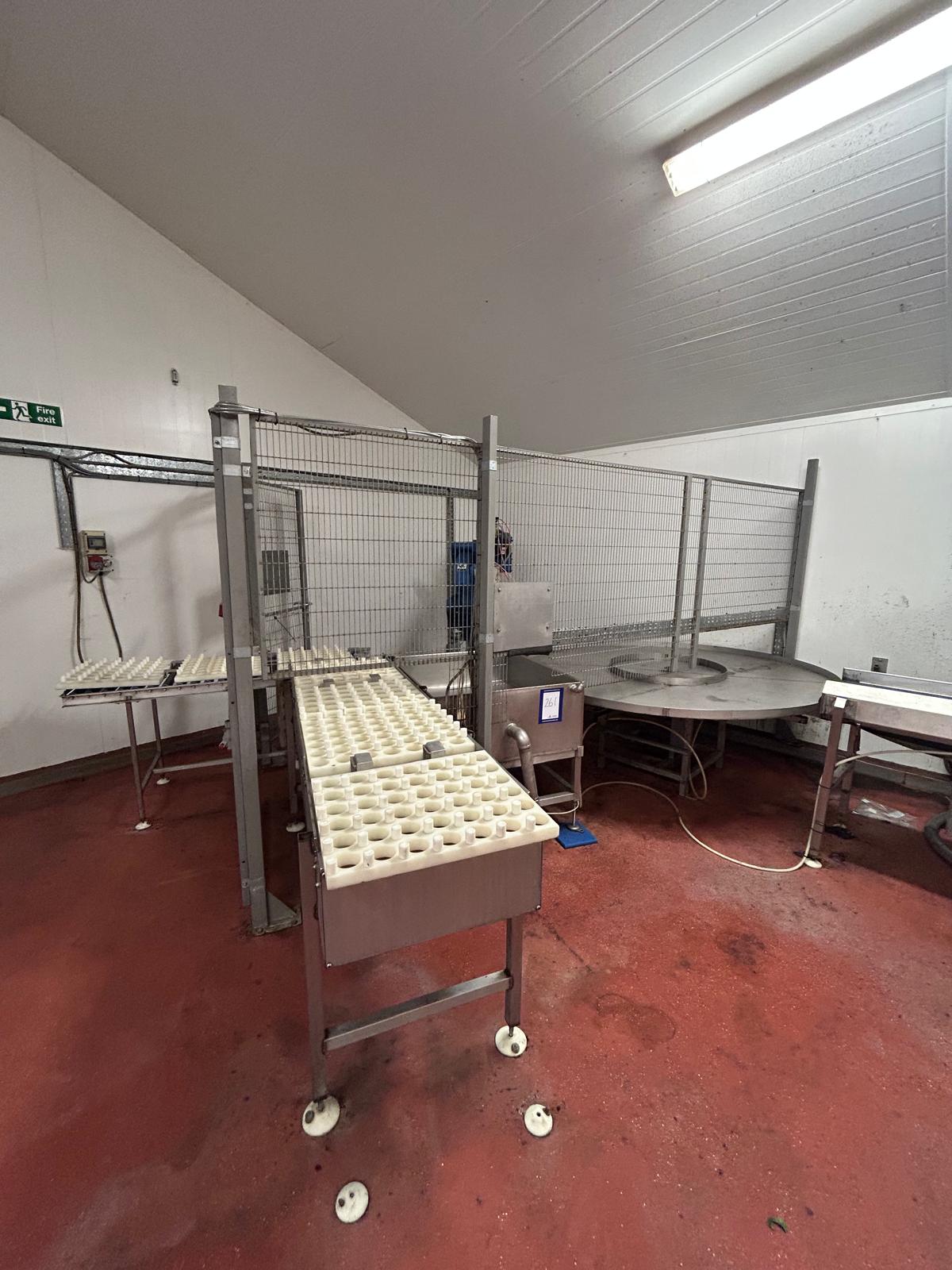 Chocolate apple line. Apples and sticks are placed into trays. Motoman robot inserts the sticks into the apples, dunks them into the heated chocolate tank and then places them on a rotary table. The rotary table can have a variety of sprinkles or marshmallows etc that will stick to the chocolate. The apples are then taken off the rotary table, placed onto a conveyor belt that passes through a cooling tunnel, and then to the LMC flowpacker, total dimenions: 9600 mm x 4200 mm.